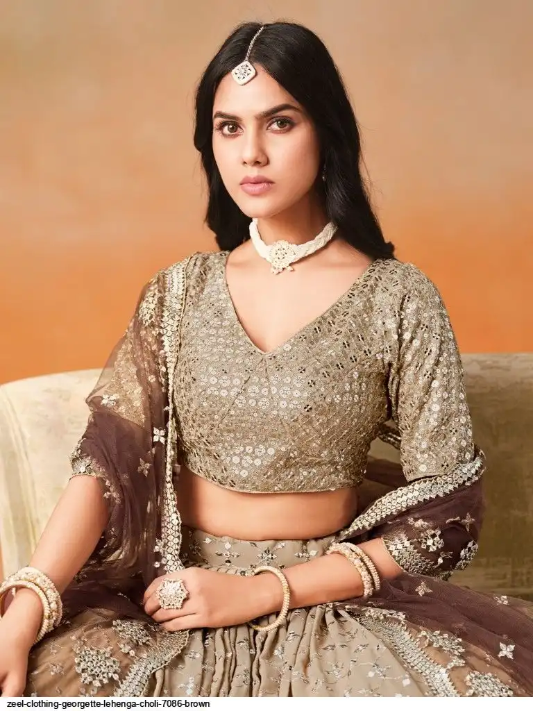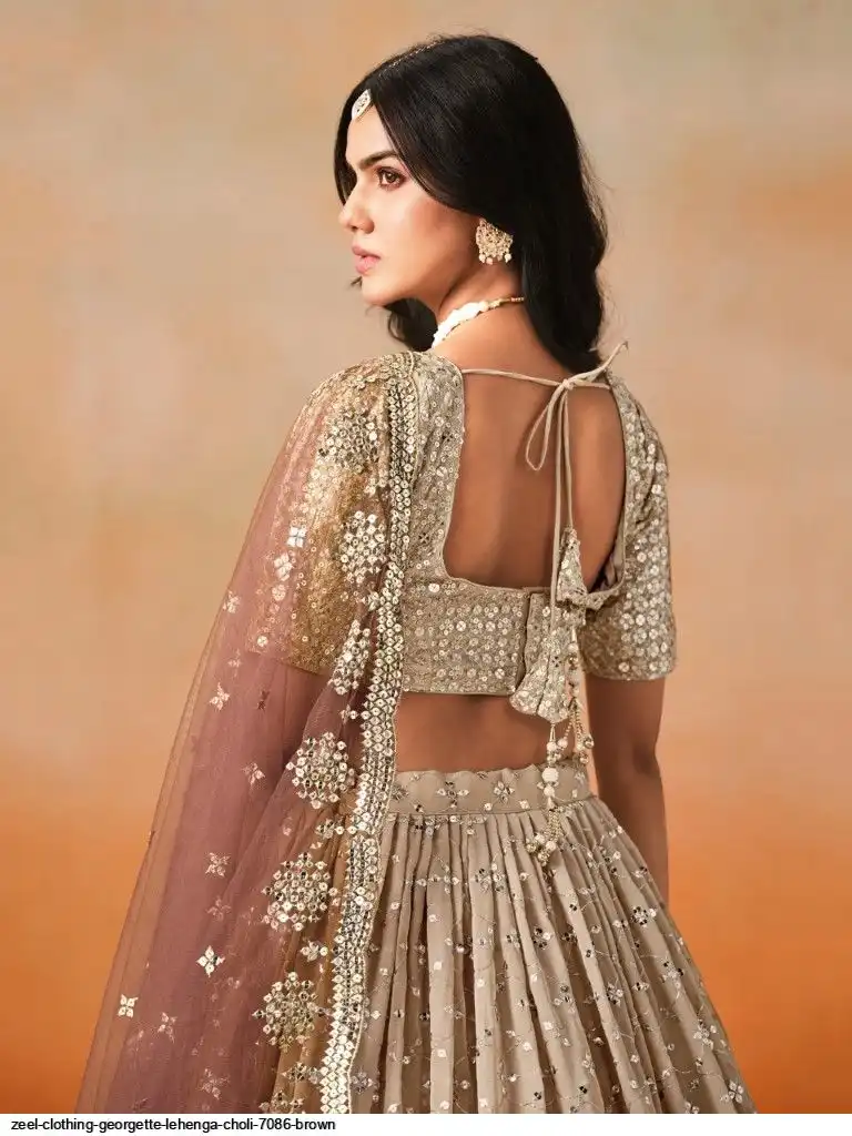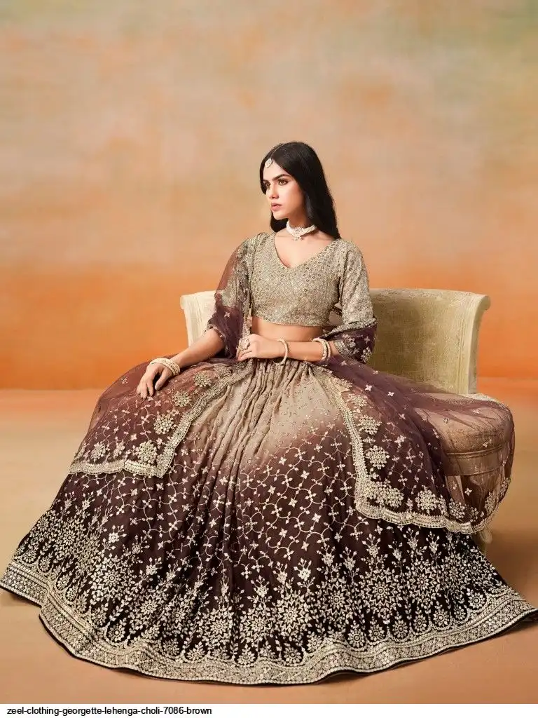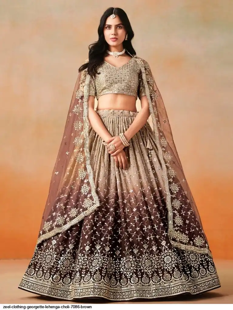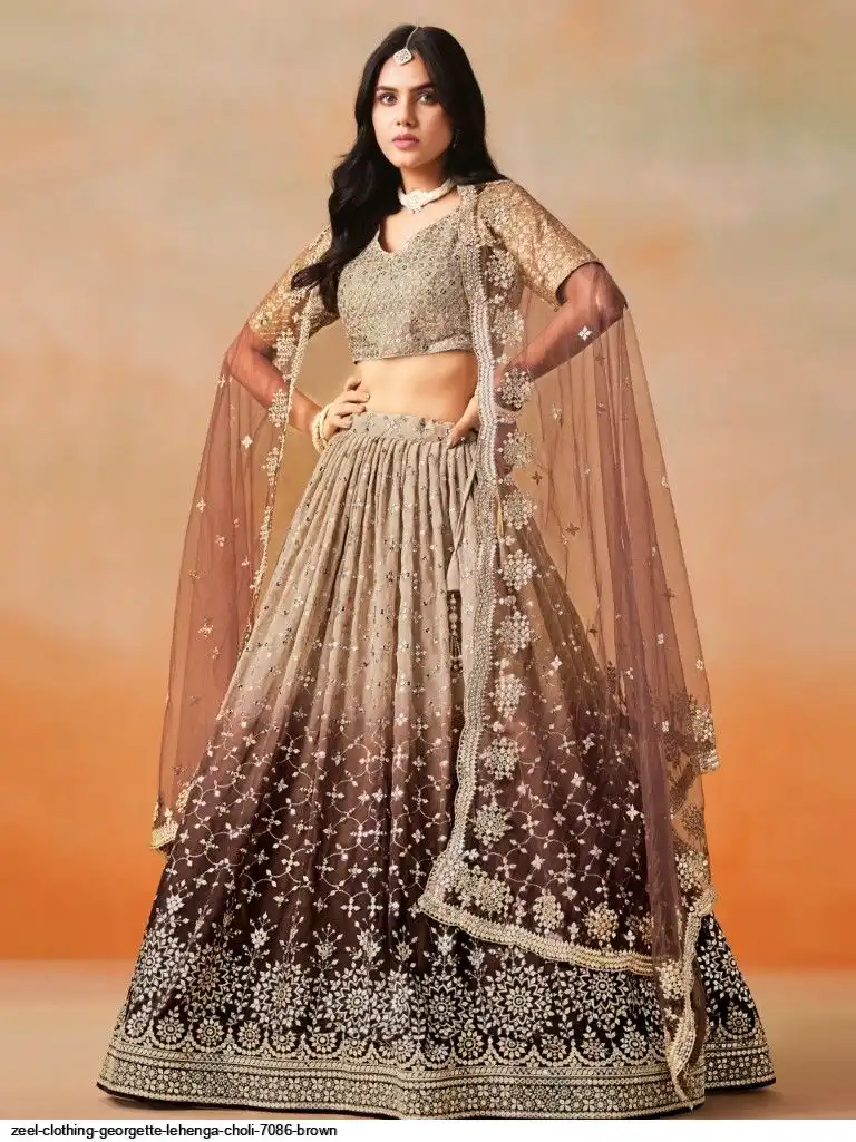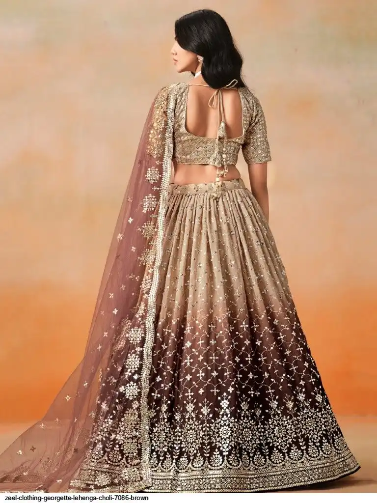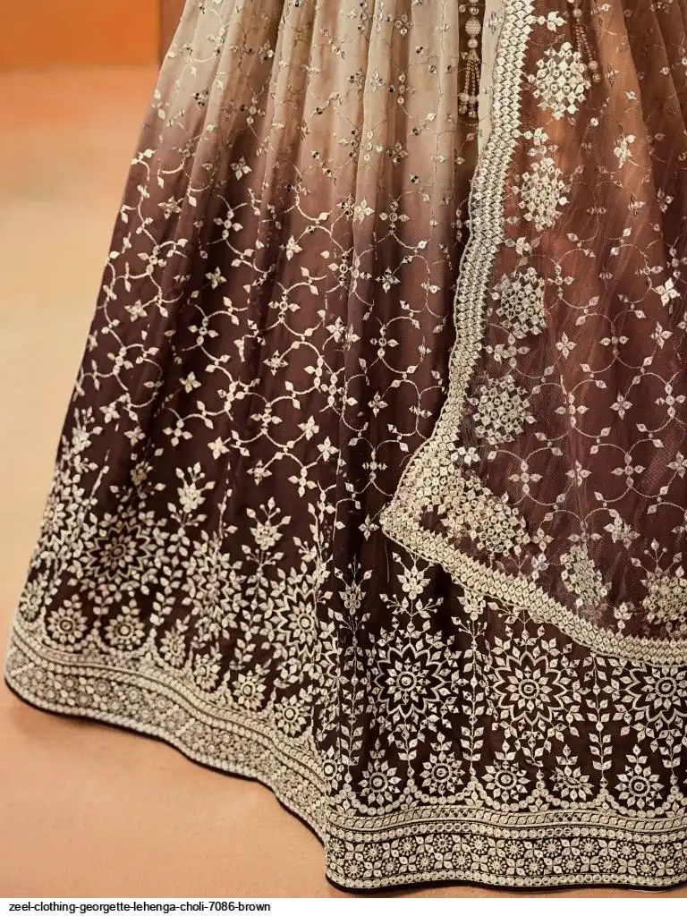 The Georgette Ombre lehenga features a beautiful gradient from beige to deep brown, adorned with heavy silver zari and sequins embroidery in elaborate floral and geometric patterns, creating a luxurious and traditional look.