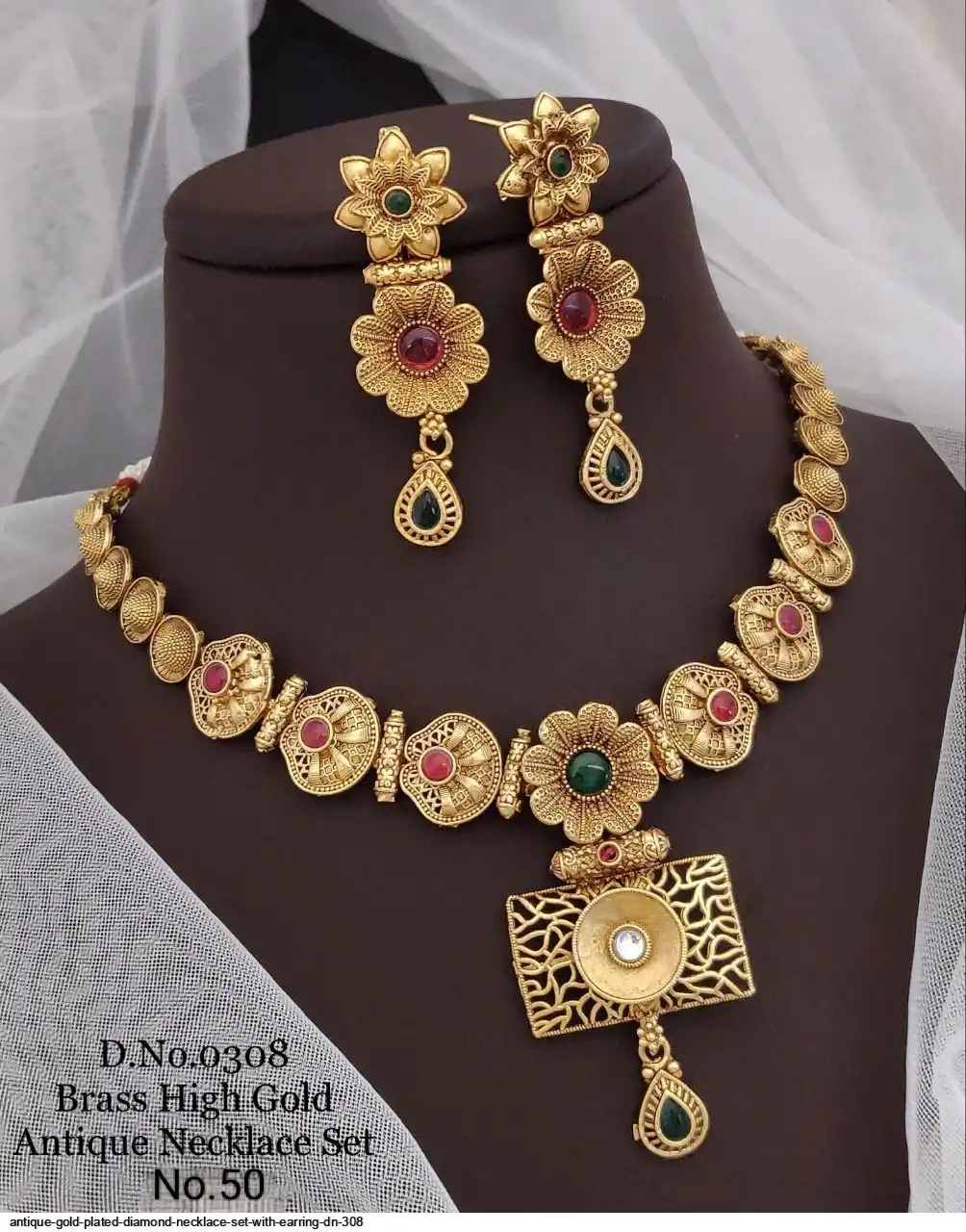 • ANTIQUE GOLD PLATED DIAMOND NECKLACE SET WITH EARRING DN 308