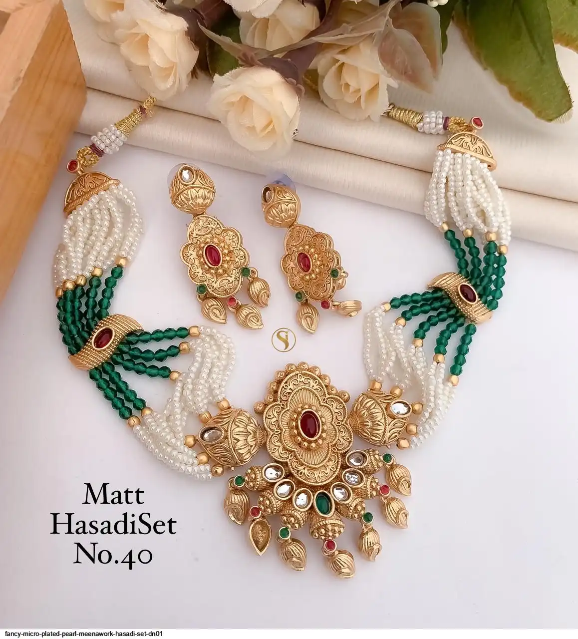 Necklace Matte Finish Micro Plated Pearl & Meenawork Designer New Hasadi set With Earring