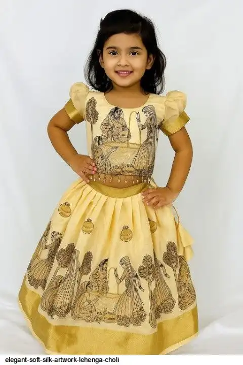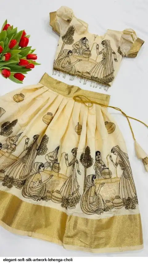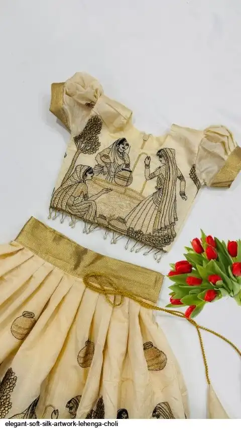 This elegant beige kids lehenga tells a story through traditional artwork, woven in rich detail. A perfect blend of heritage and fashion for your little princess!