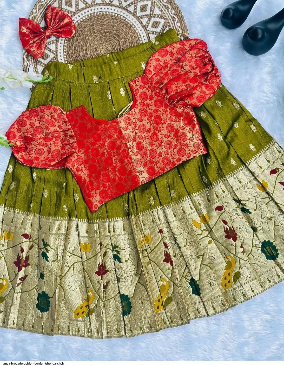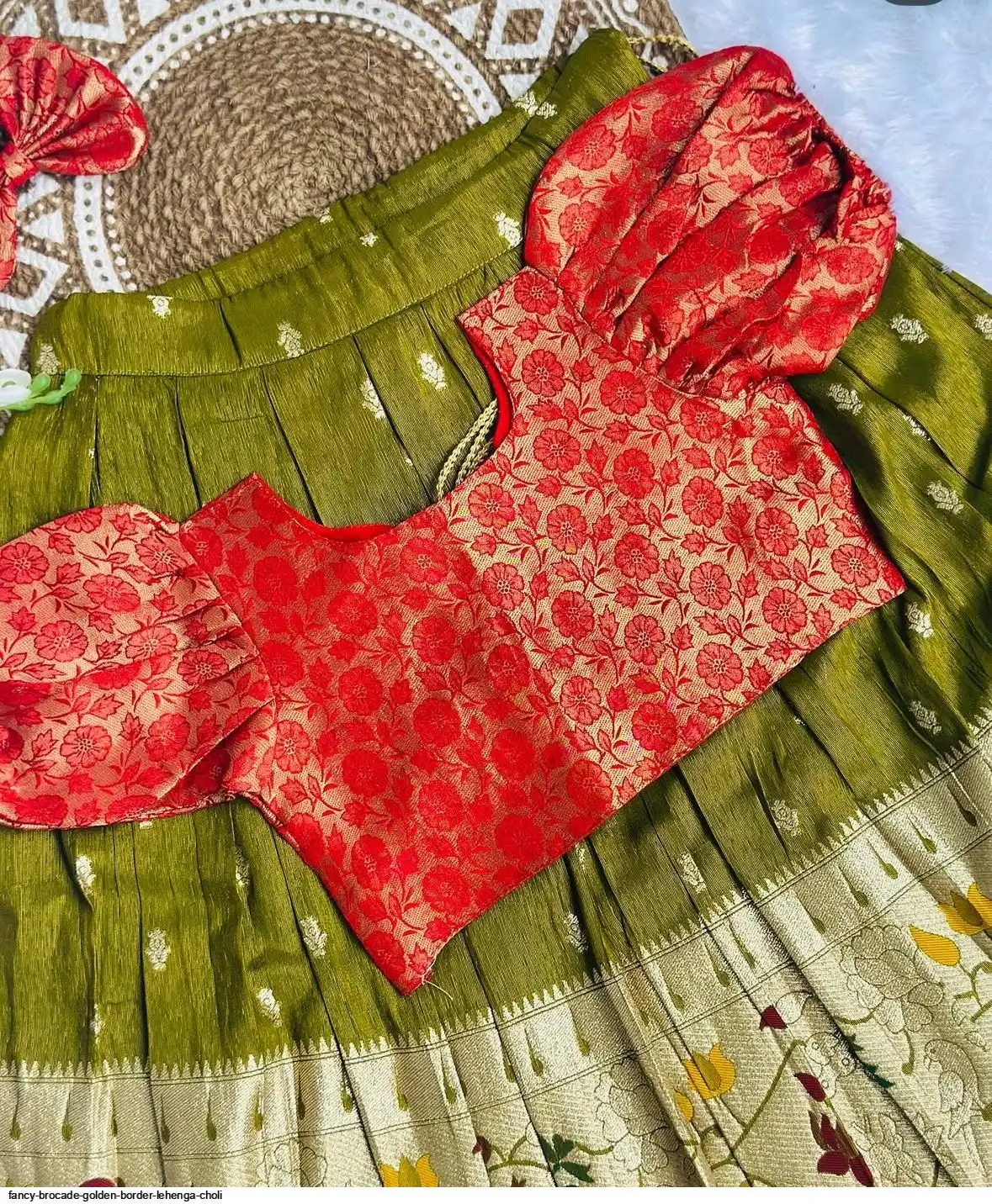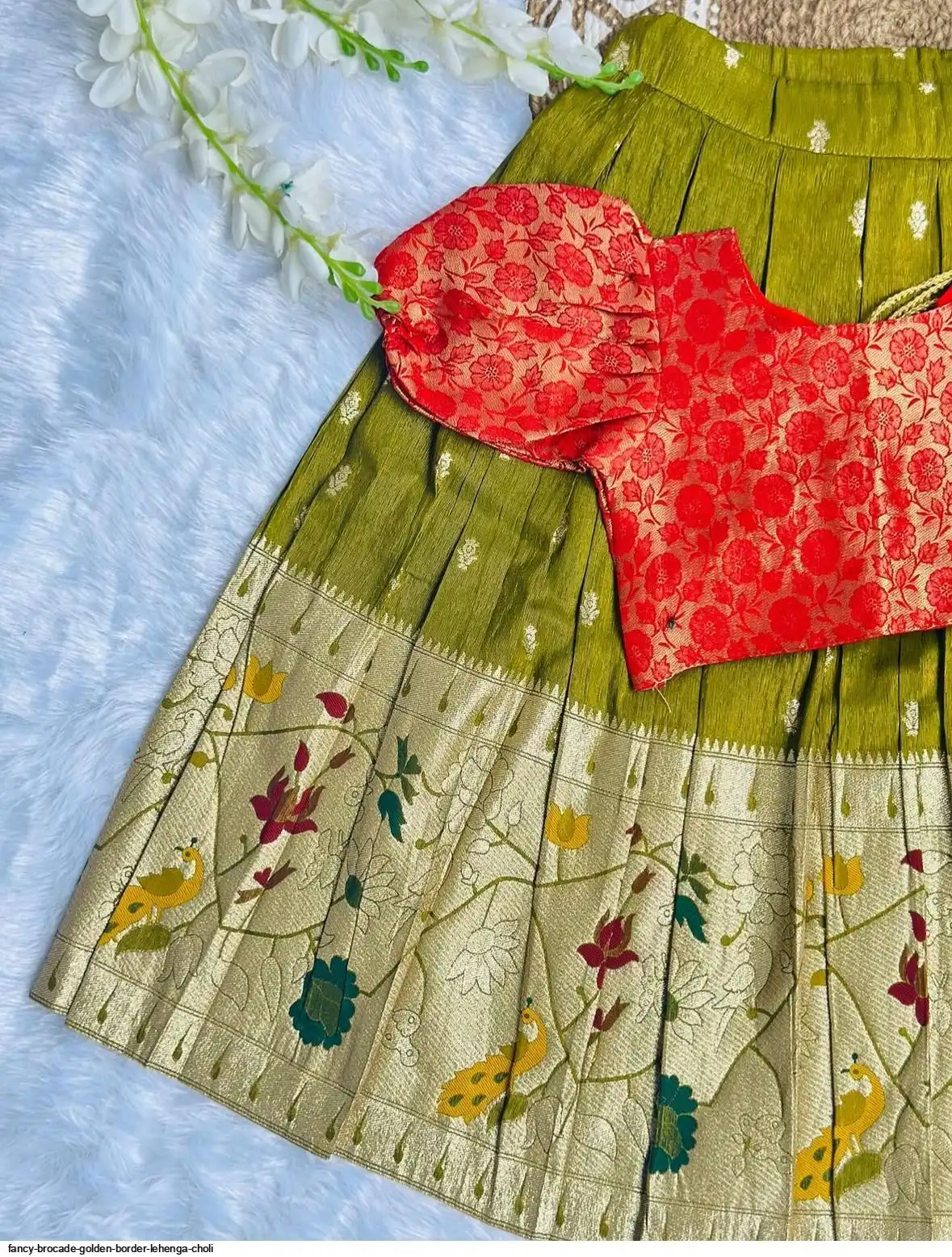 Skirt: Olive Green with Zari Weave & Golden Border