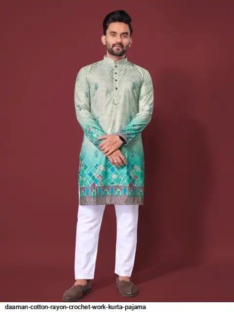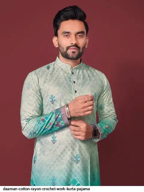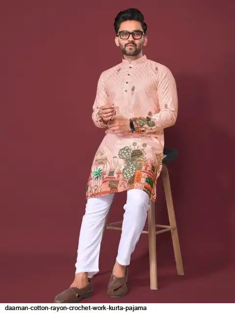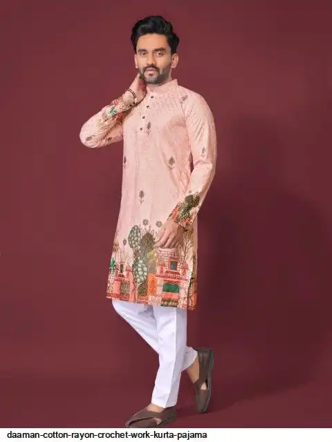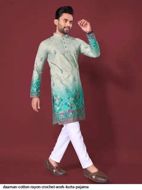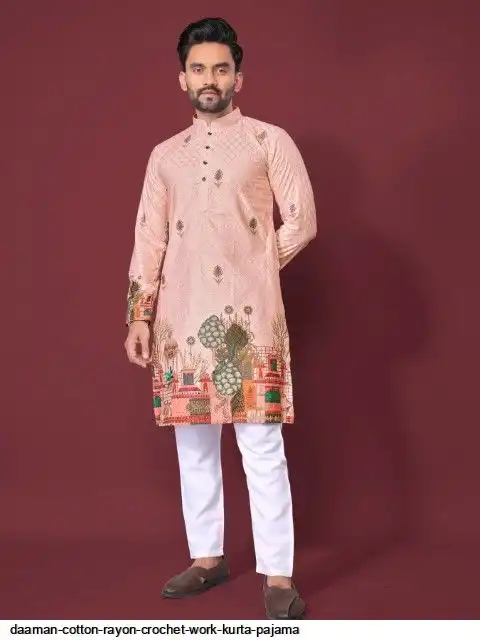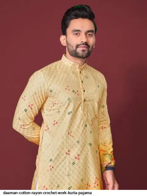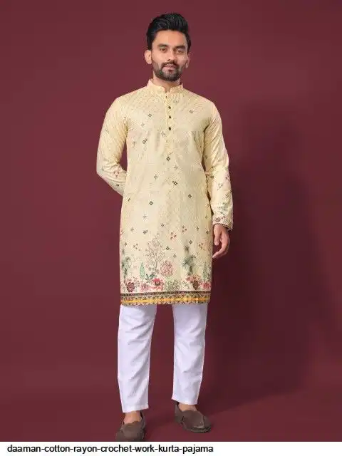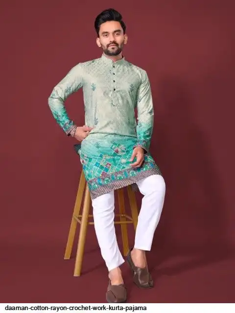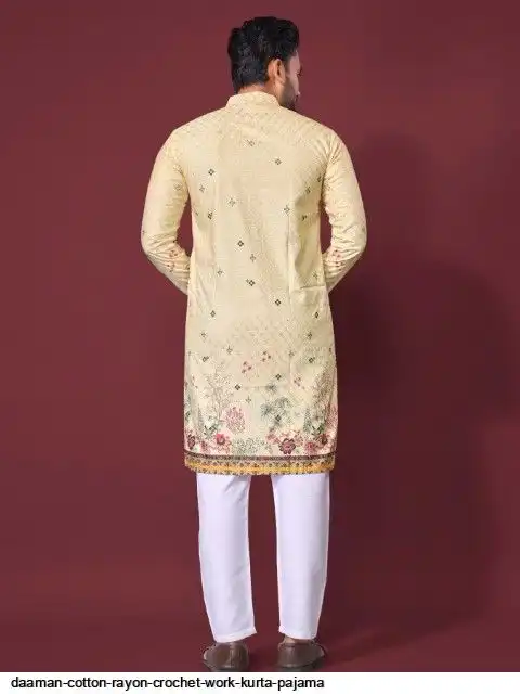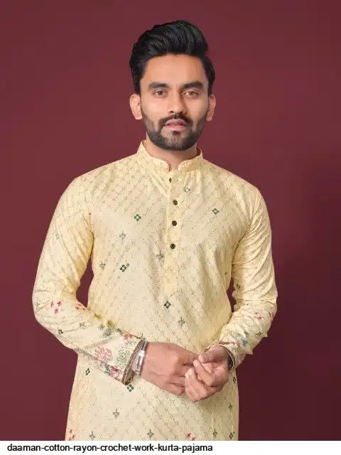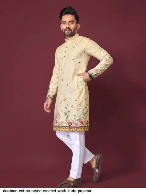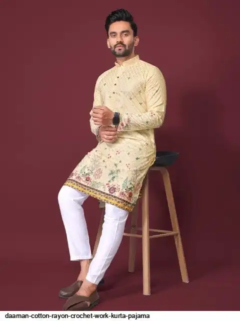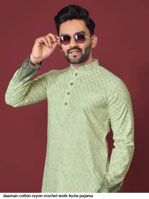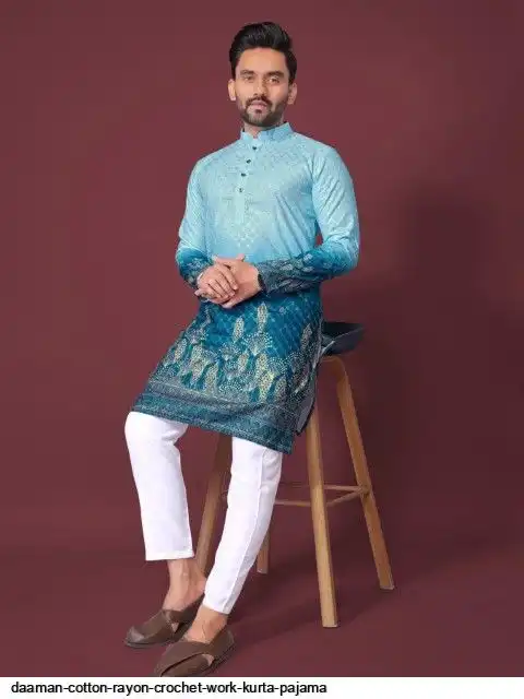 Try a desi boy look with this timeless Multicolour men’s kurta. The pure cotton fabric With CROCHET Work Kurtas using to attain these bright coloured Names all over. The rest of the outfit features a mandarin collar, a placket and full sleeves with a straight hemline. Invest in this for the upcoming festive season