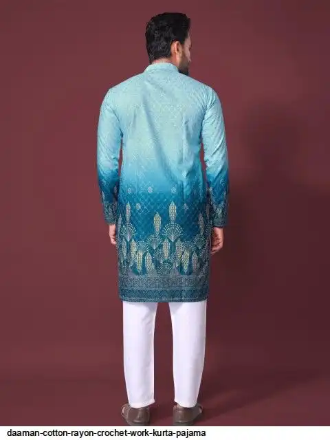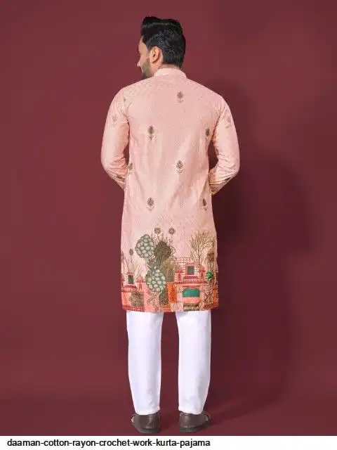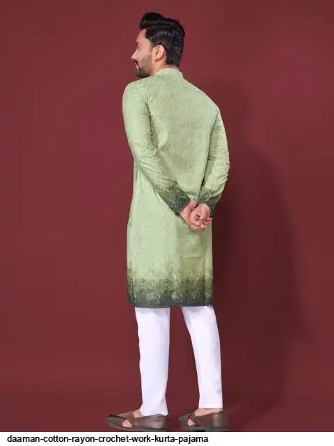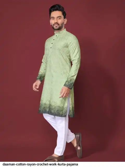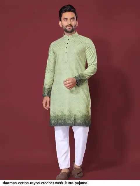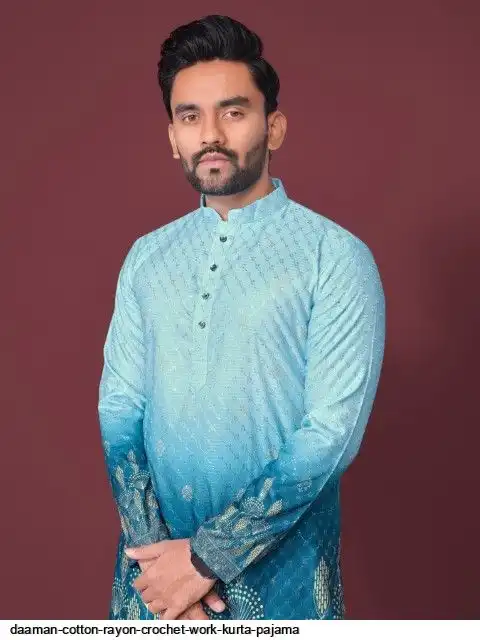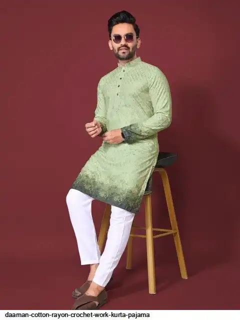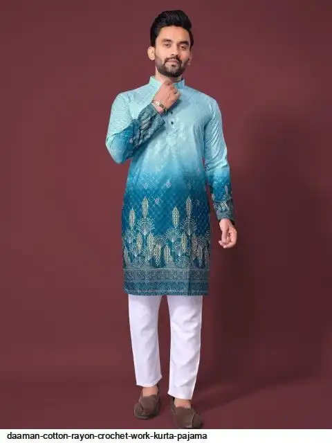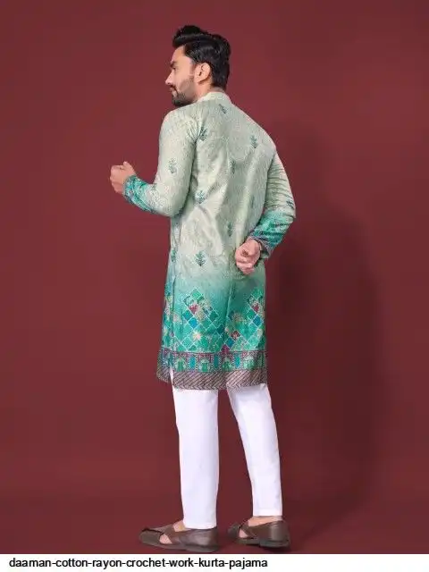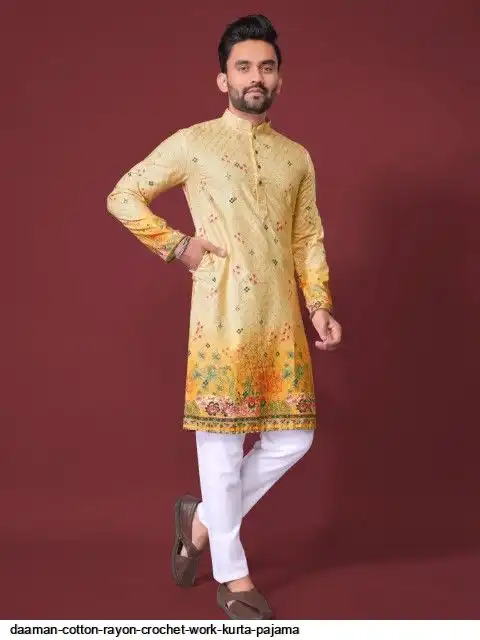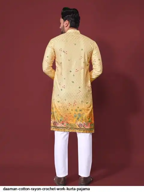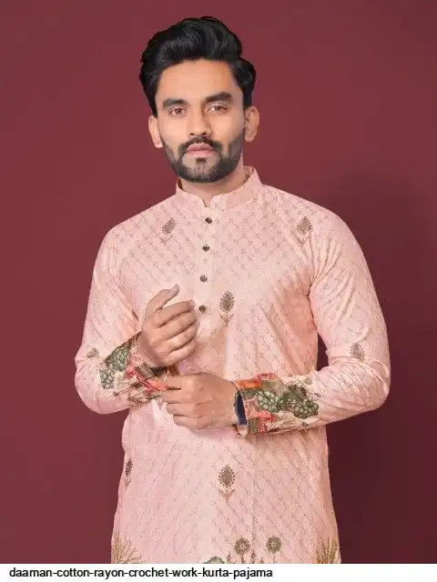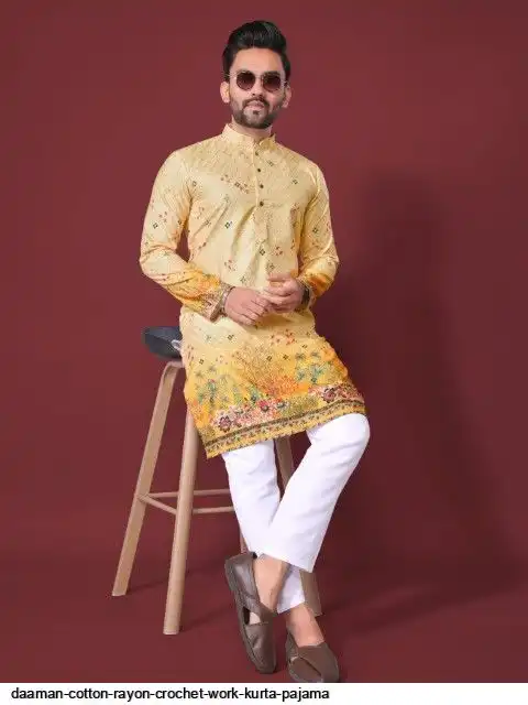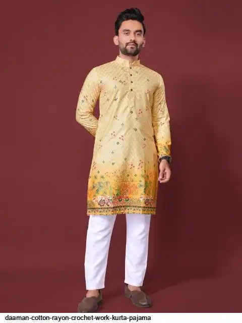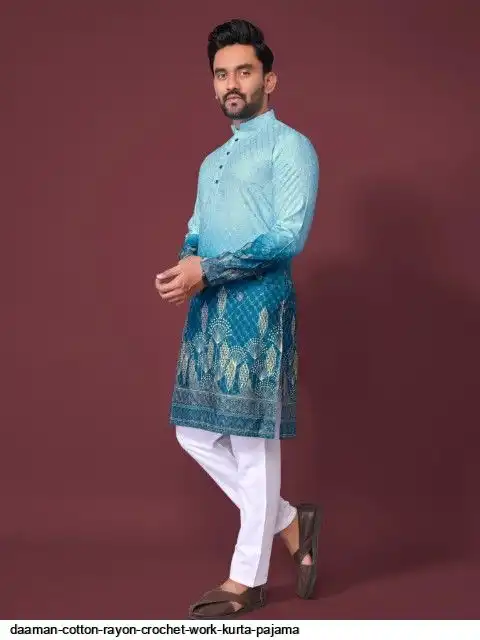 Try a desi boy look with this timeless Multicolour men’s kurta. The pure cotton fabric With CROCHET Work Kurtas using to attain these bright coloured Names all over. The rest of the outfit features a mandarin collar, a placket and full sleeves with a straight hemline. Invest in this for the upcoming festive season