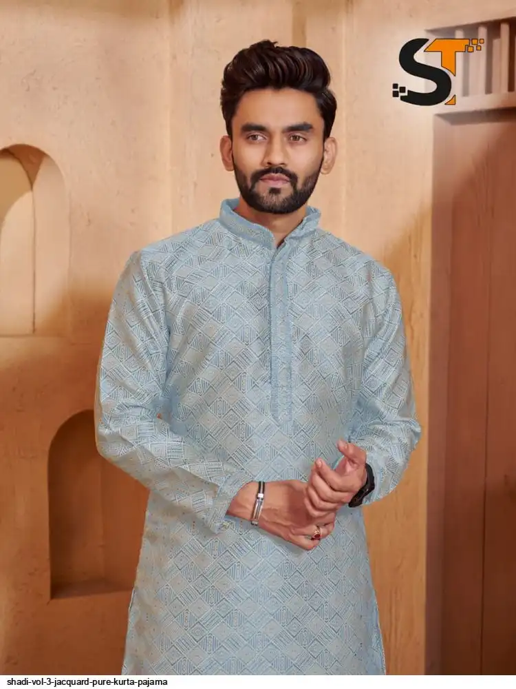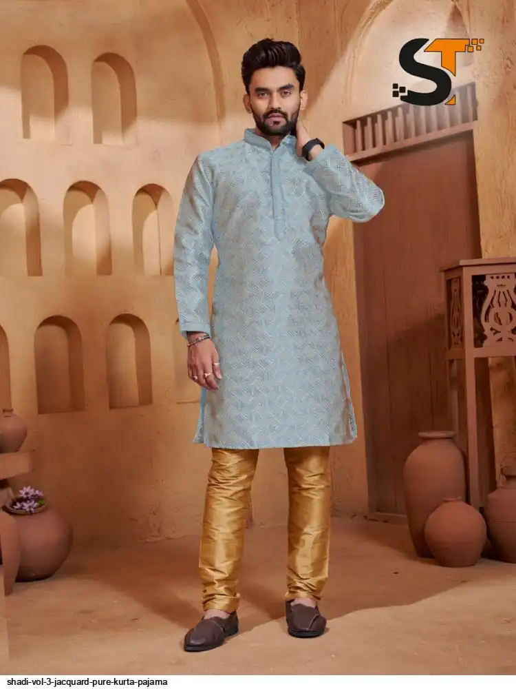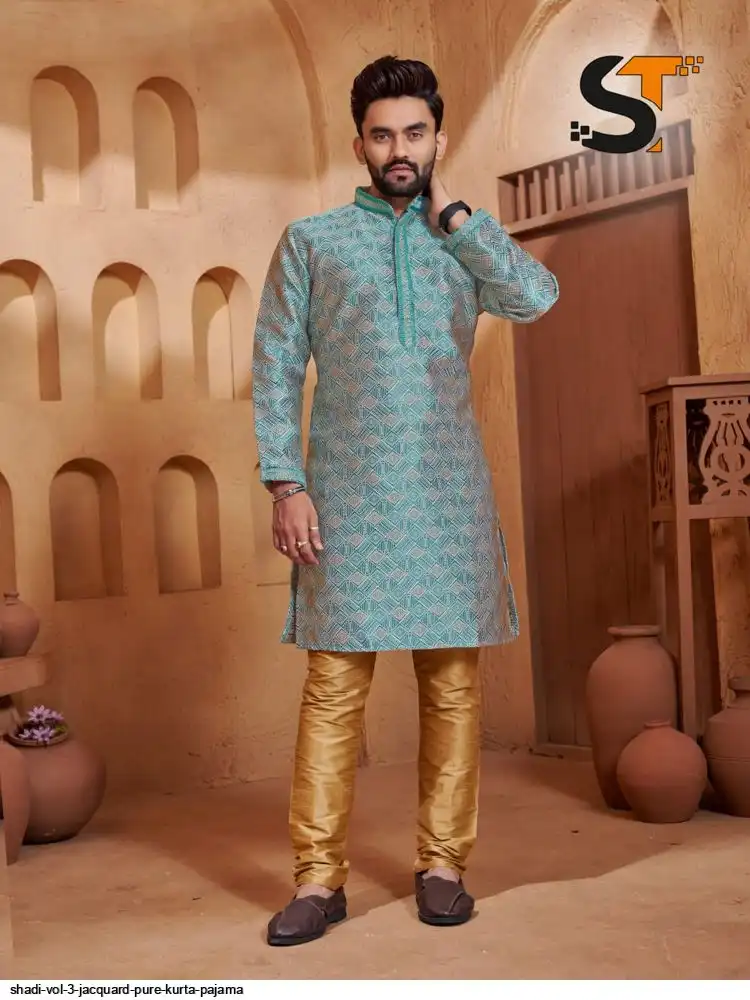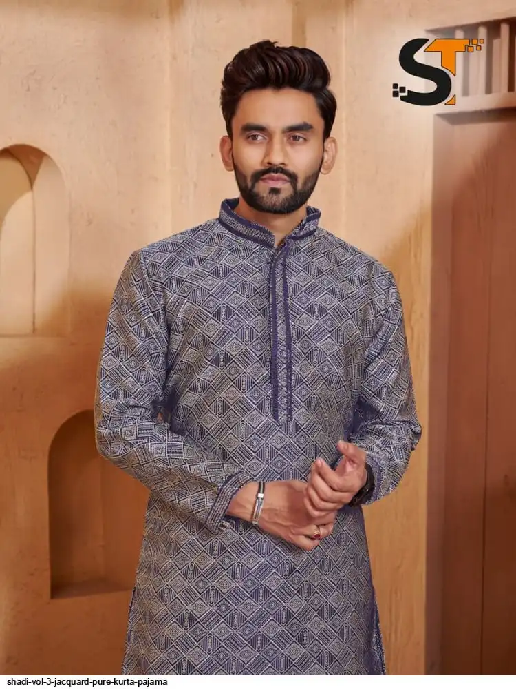 - *Kurta Fabric:* Luxurious jacquard with beautiful collar and tie design