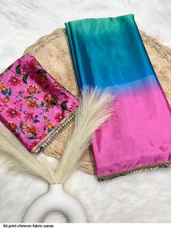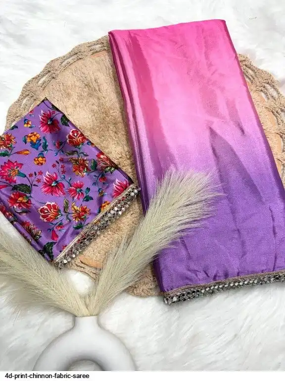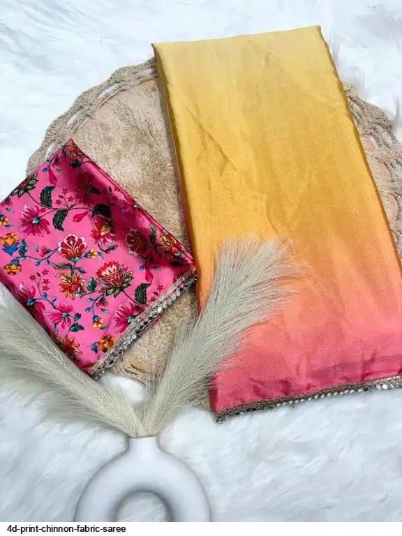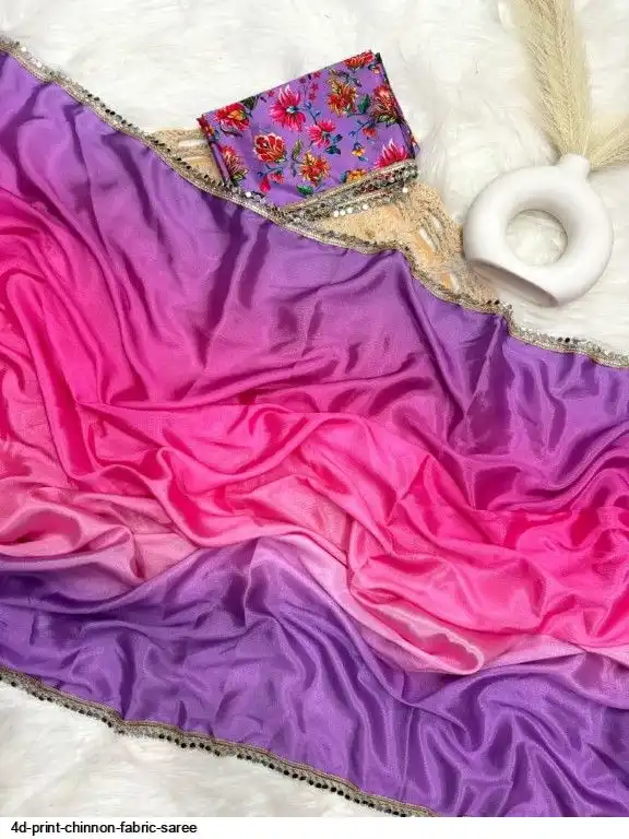 4D Print Chinnon fabric Saree with Beautiful Mirror lace fitting Border