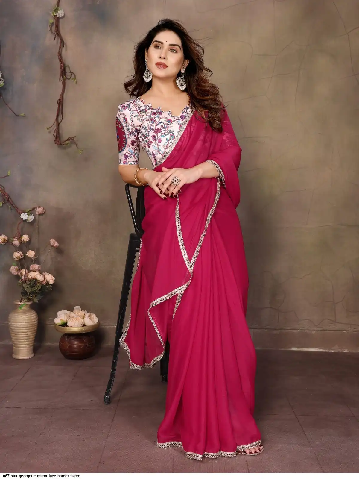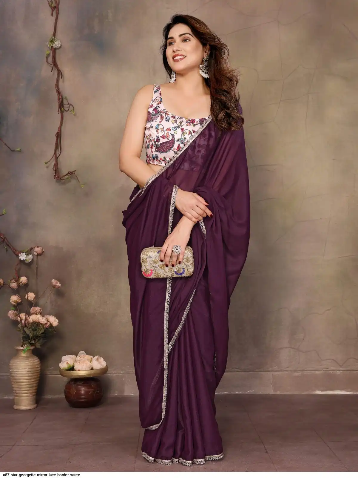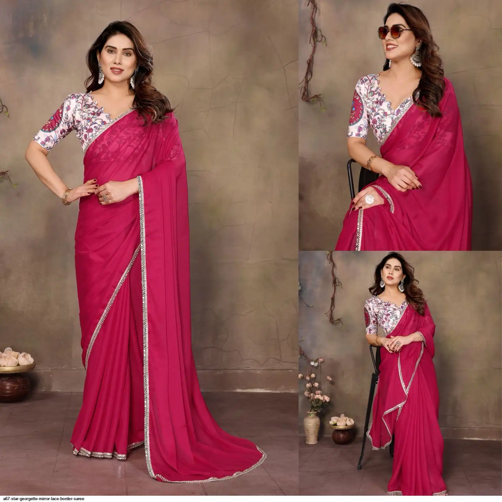 PATTERN-Solid Georgette silk Saree With Miorror lace Border
