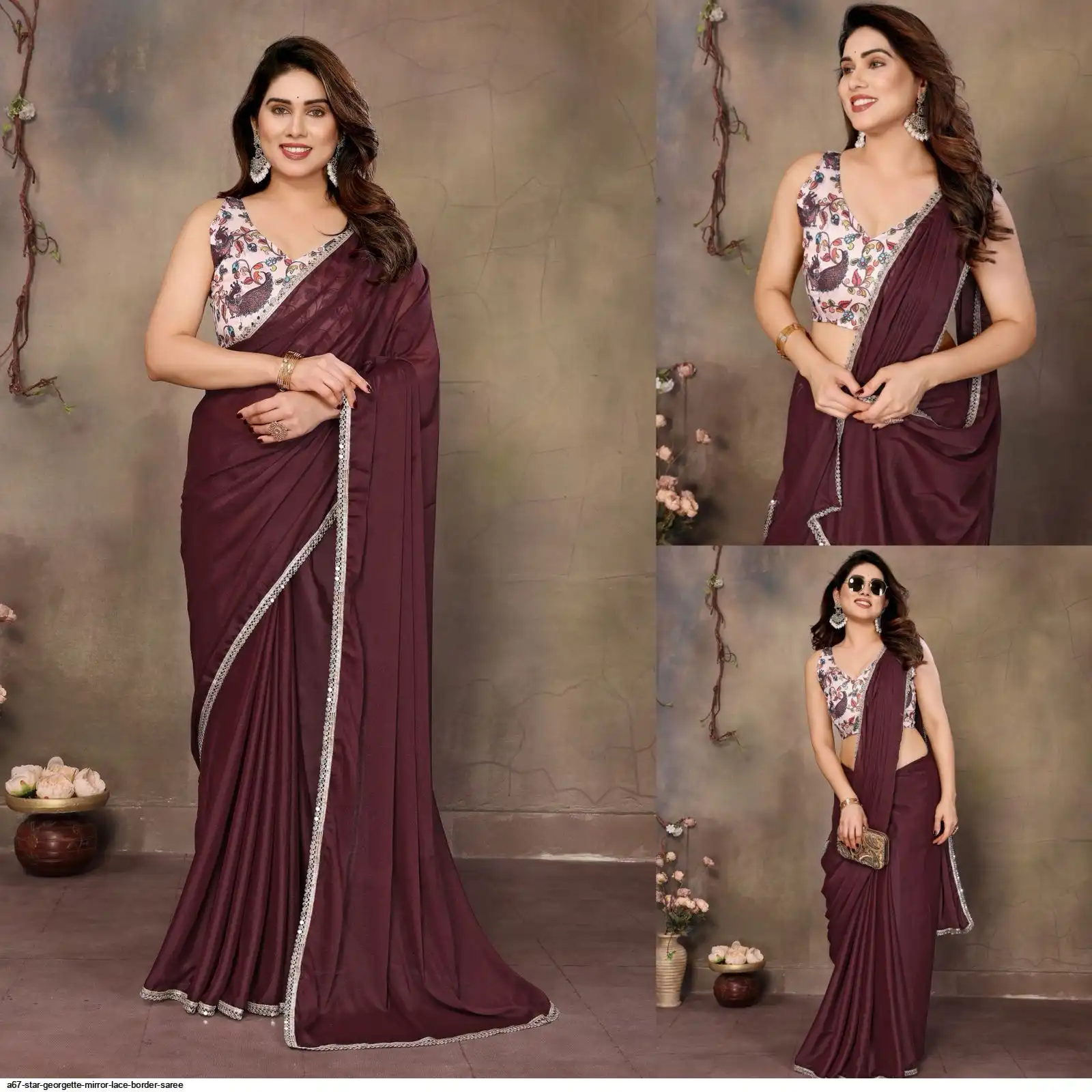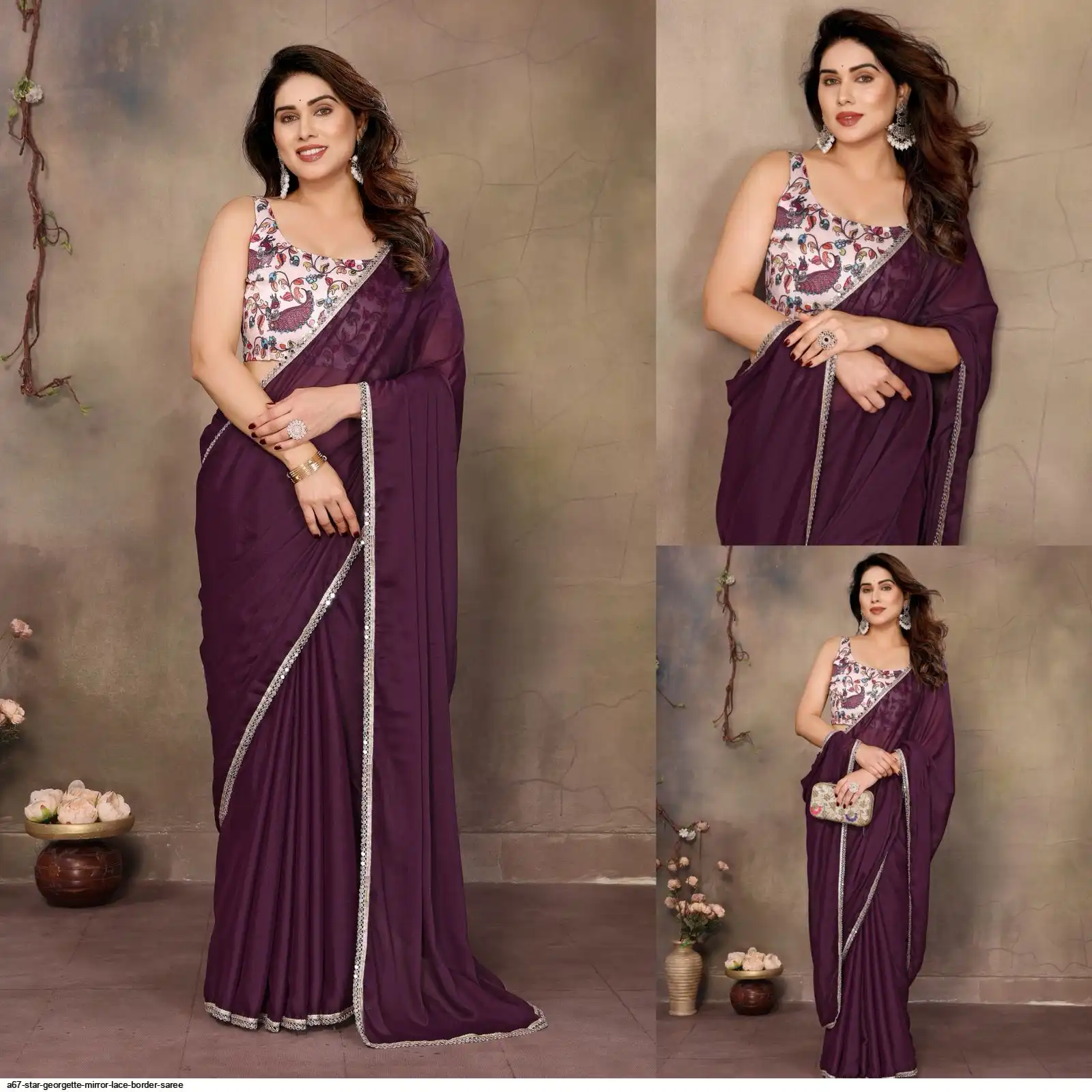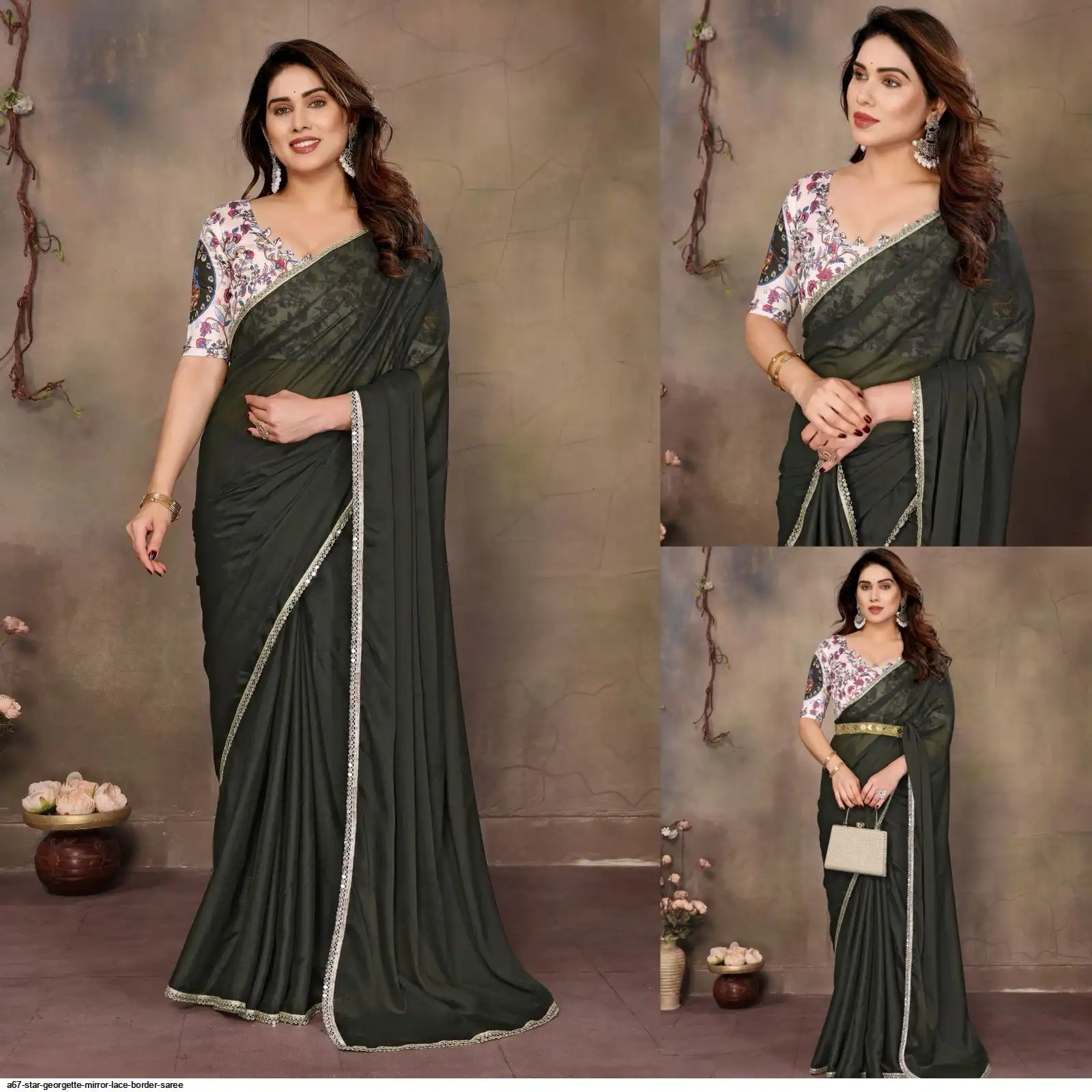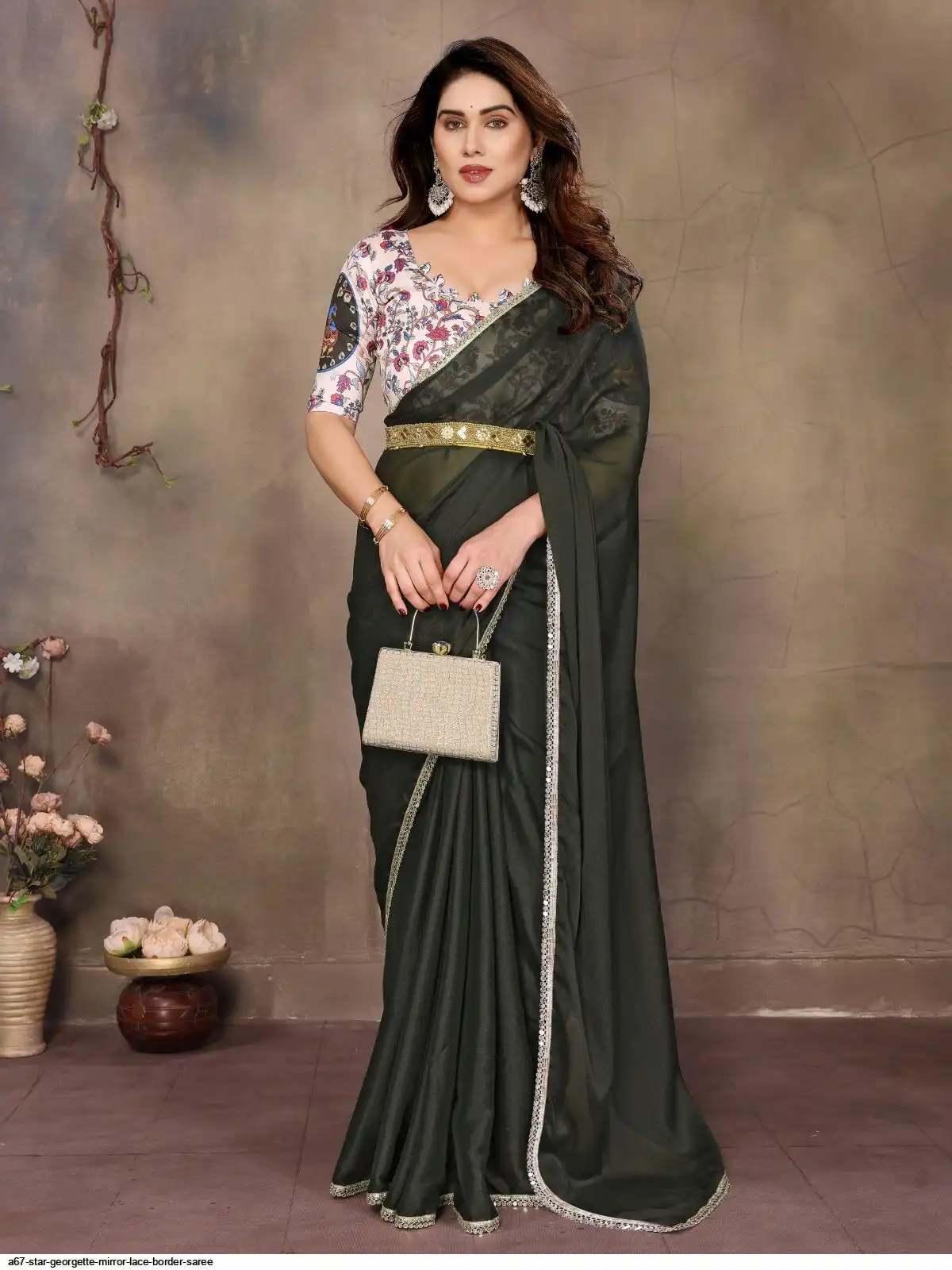 PATTERN-Solid Georgette silk Saree With Miorror lace Border