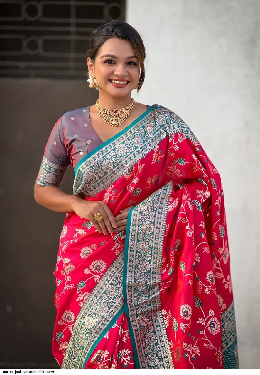 Premium Banarasi Soft Silk Sarees with rose gold zari meenakari jaal weaves all over the body, having rich zari woven contrast pallu and paired with brocade contrast Blouse