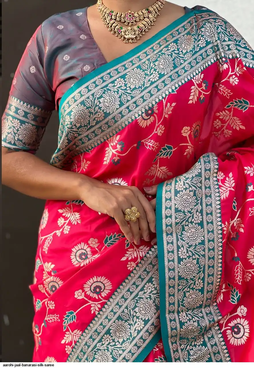 Work : Rose Gold Zari Meenakari Jaal Weaves All Over The Body, Having Rich Zari Woven Contrast Pallu And Paired Premium Saree