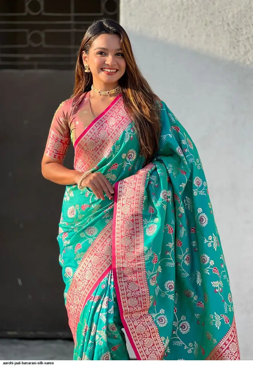 Premium Banarasi Soft Silk Sarees with rose gold zari meenakari jaal weaves all over the body, having rich zari woven contrast pallu and paired with brocade contrast Blouse