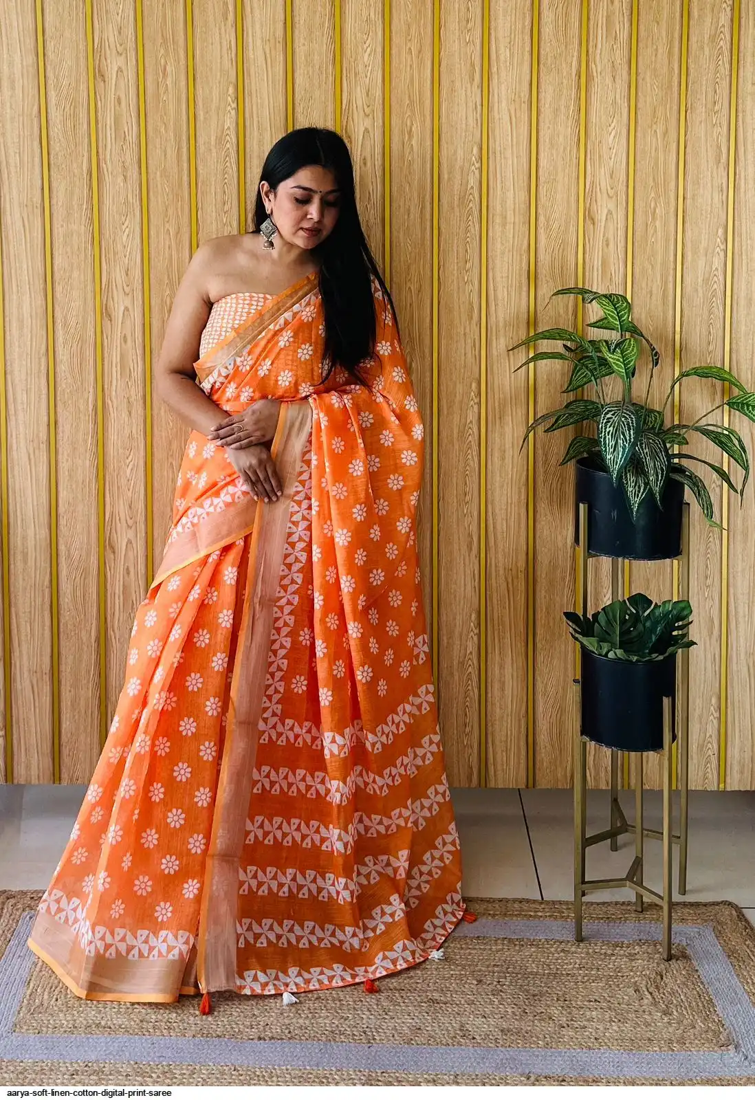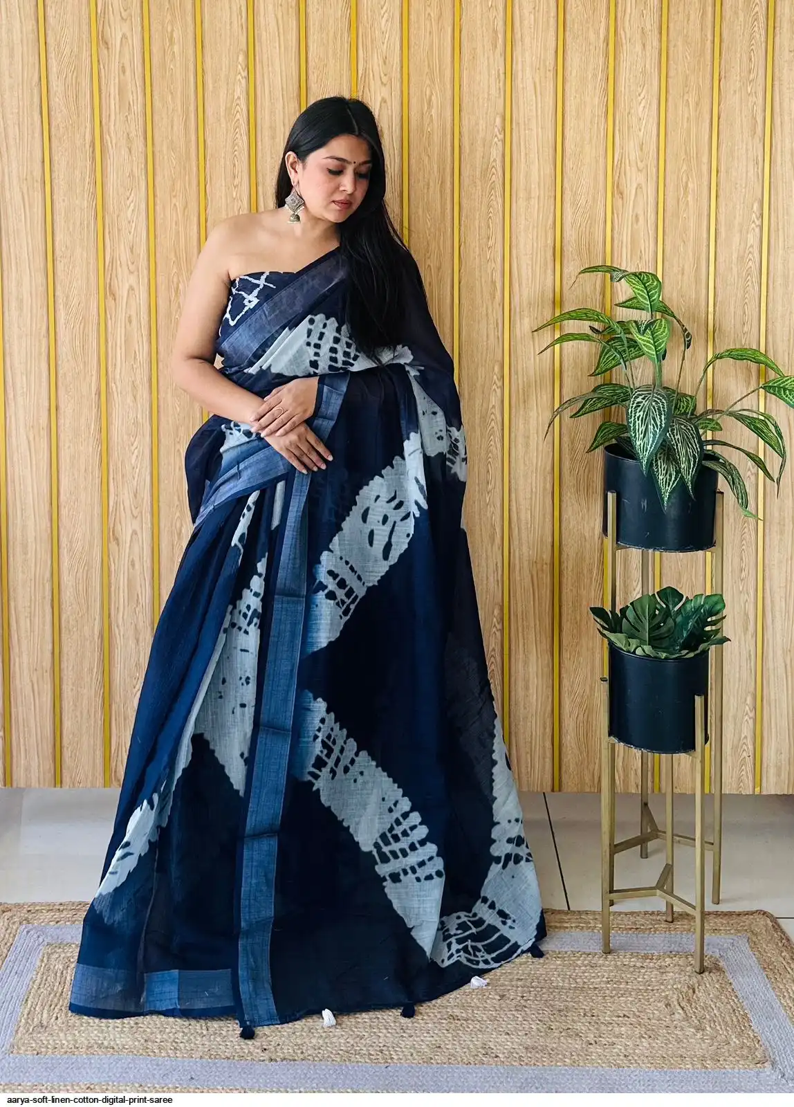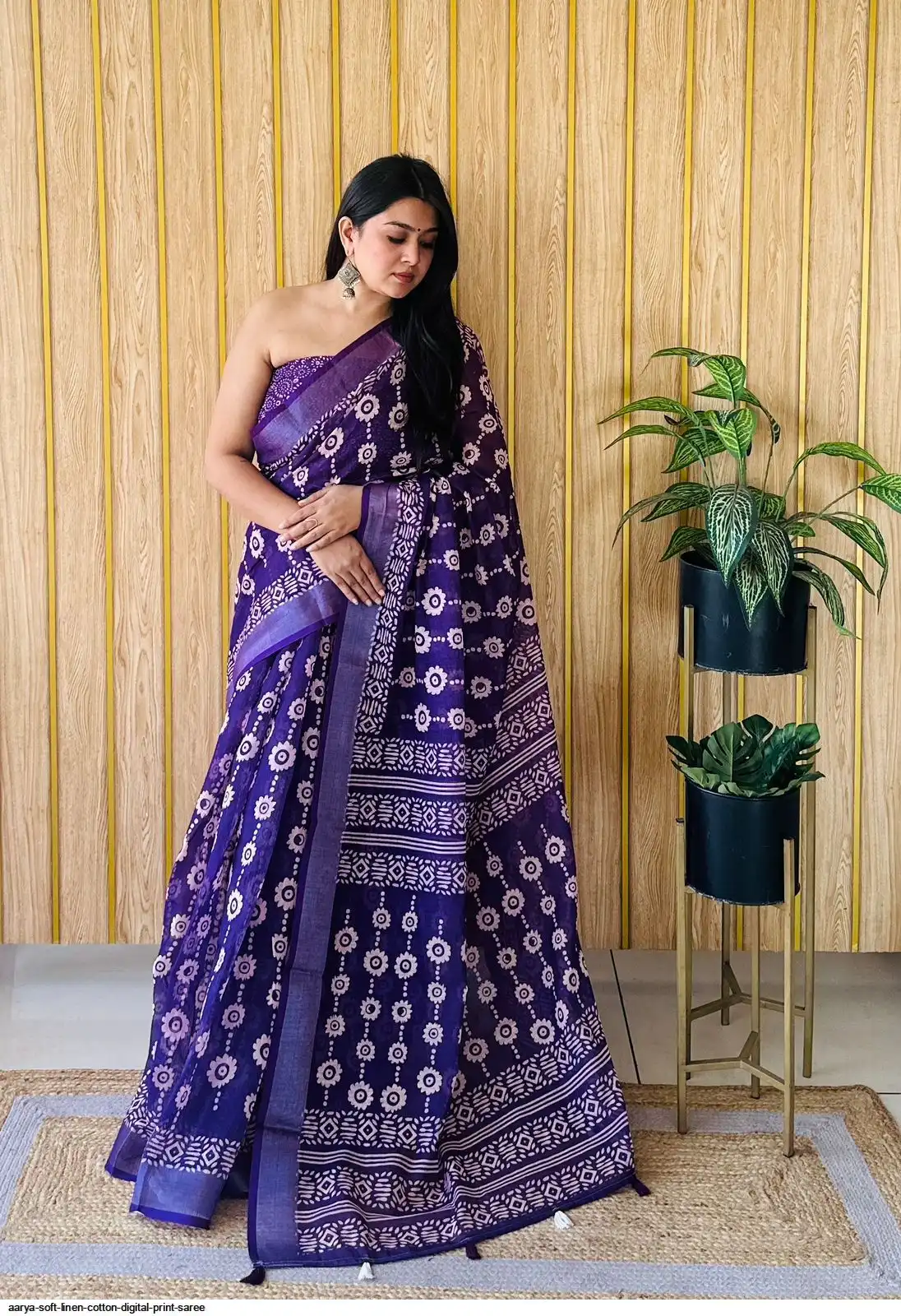 he Very Premium And Rich Quality Soft Linen Cotton Digital Print Sarees With Batik Print All Over The Body And Woven Silver Border And Printed Pallu