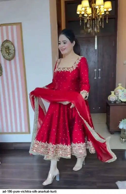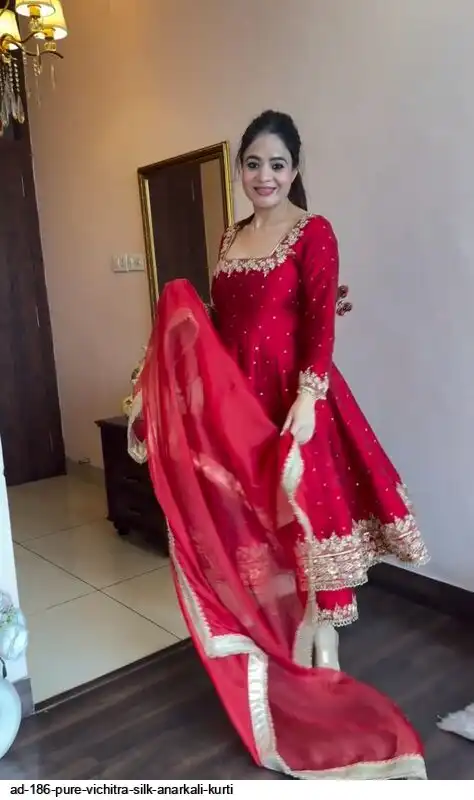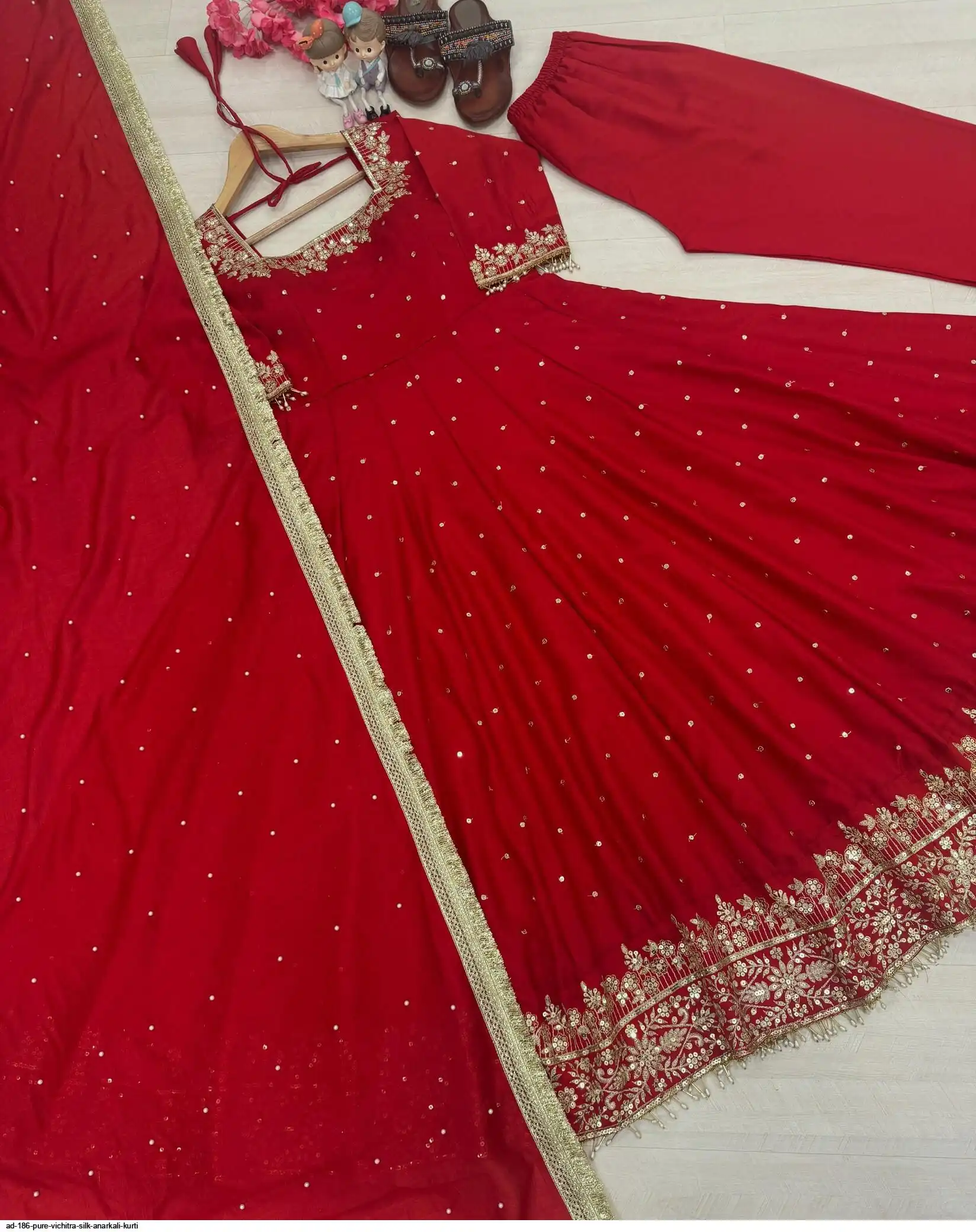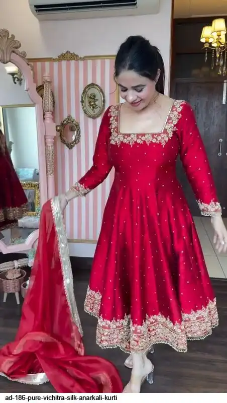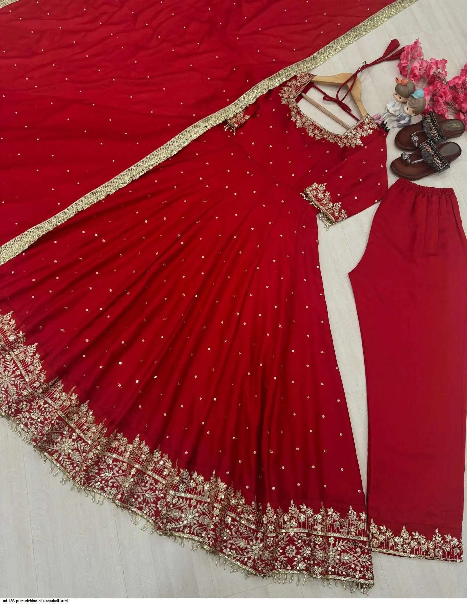 Anarkali Gown Fabric : Heavy Pure Vichitra Silk With Embroidery 5 mm Sequence Work With Fancy Latkan Border With Sleeve With Cups & Tassels