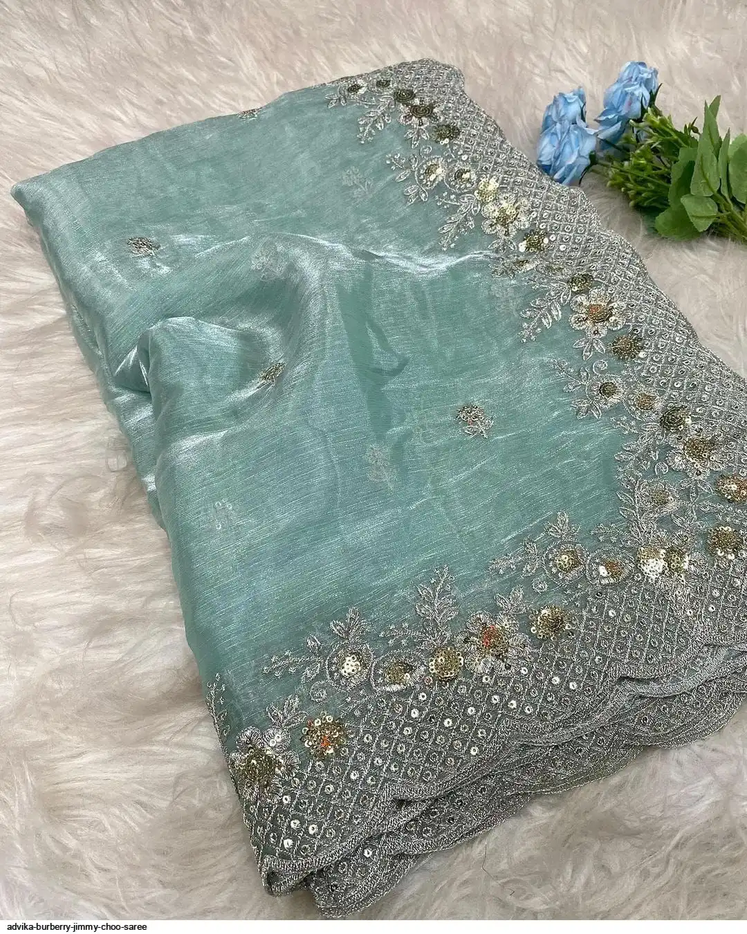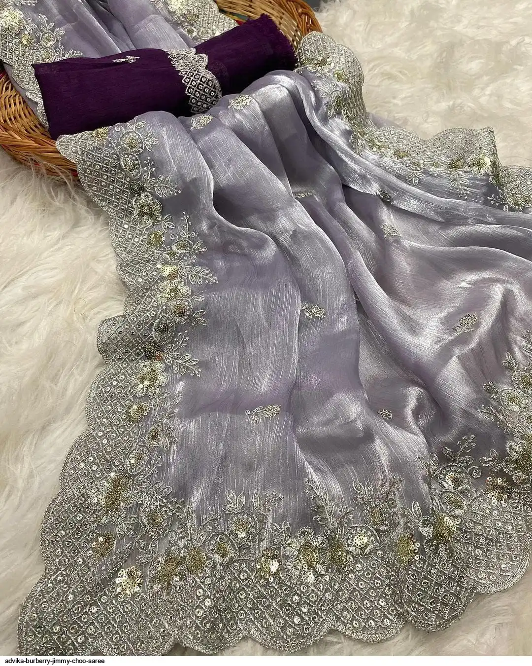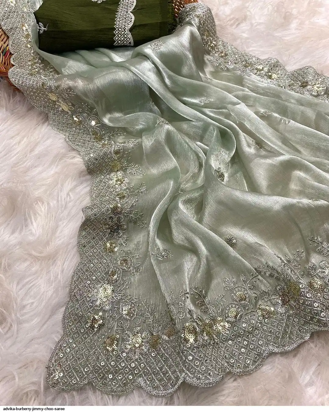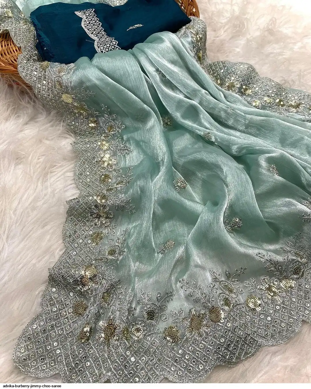 Saree:- Pure soft Burberry zimmy choo silk sarees with amazing 3 mm C Pallu sequence work with Cut work border