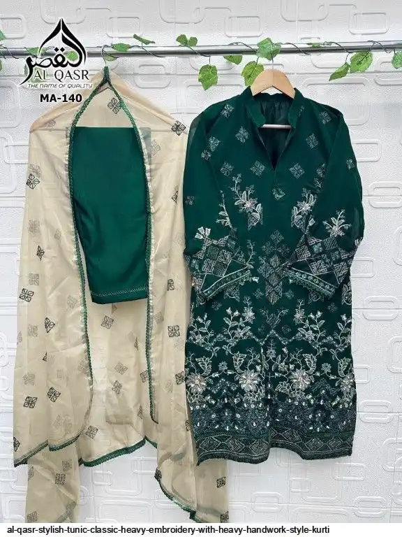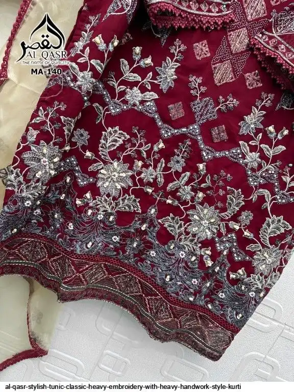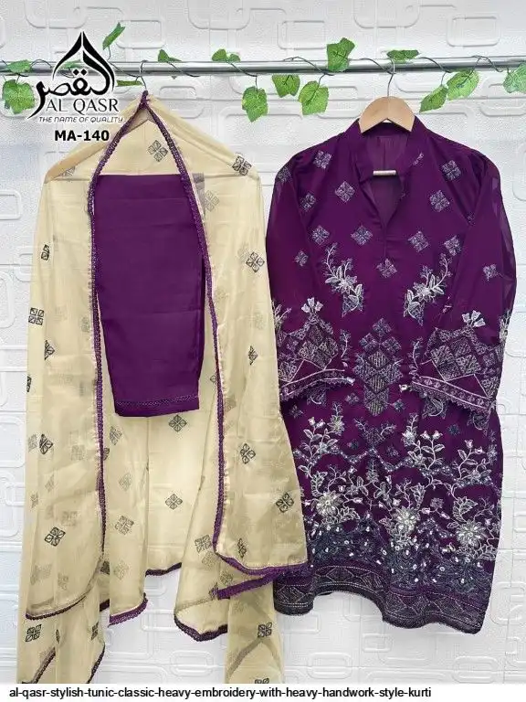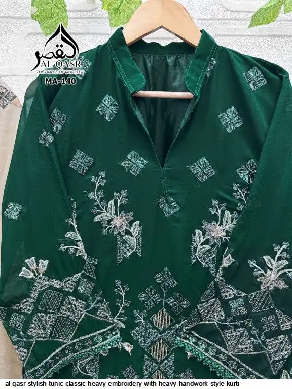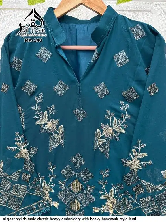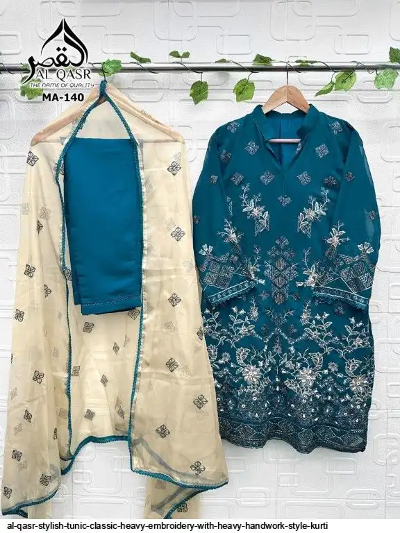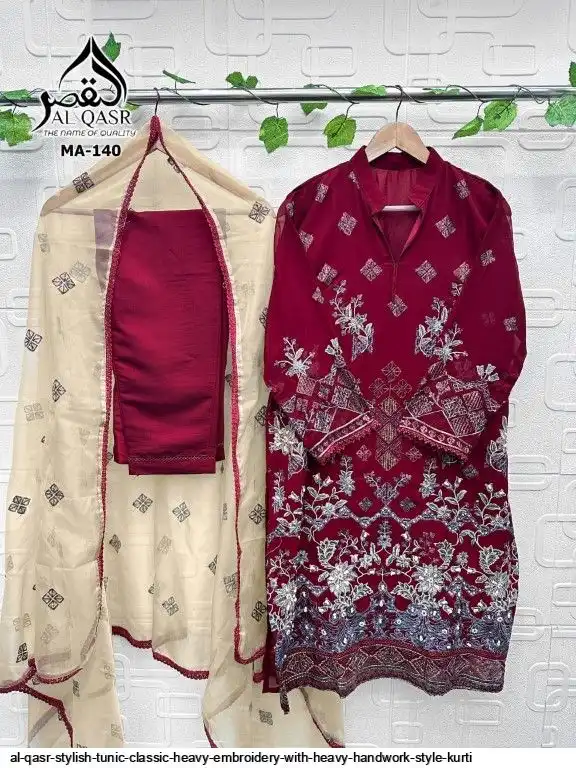 Designer stylish Tunic Classic Heavy Embroidery with Heavy Handwork , Style Kurti Paired With Inner ...with Glamour's * Embroidered sleeves ..& Pant With Organza Embroidery Dupatta