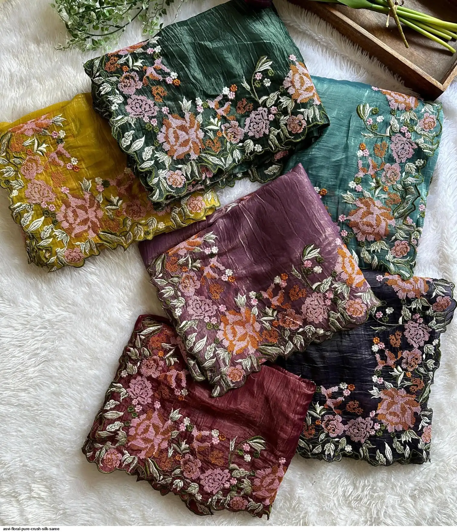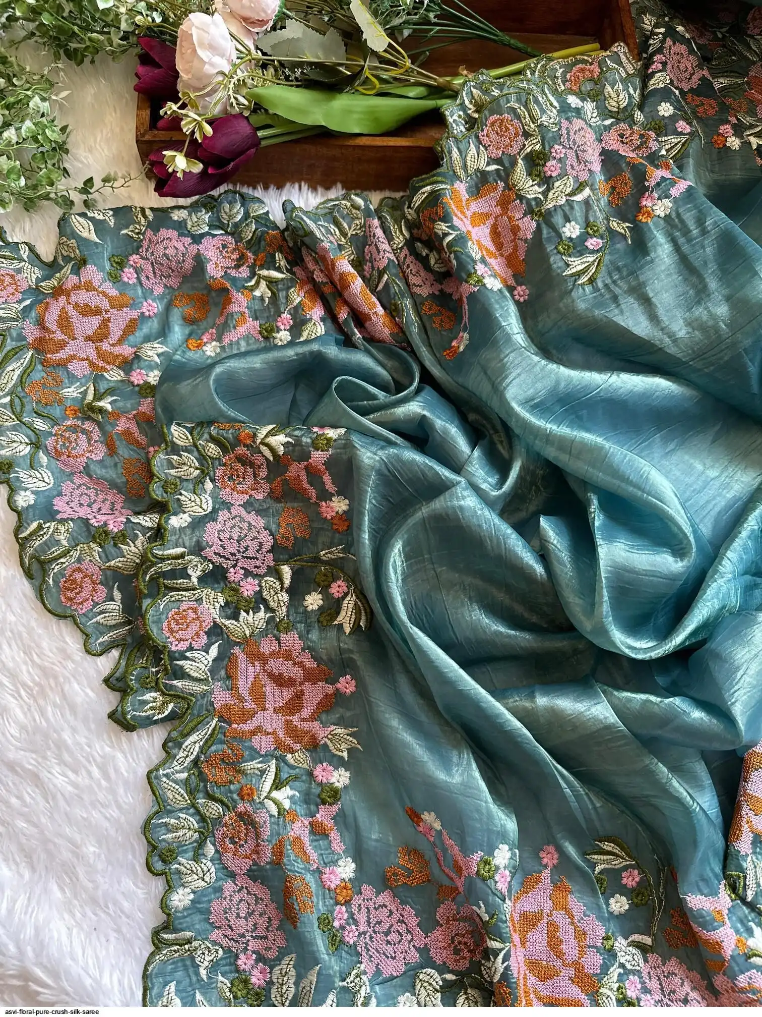 Heavy floral pattern saree with cut work all over the saree and pure silk crush saree with the cut work embroidered border
