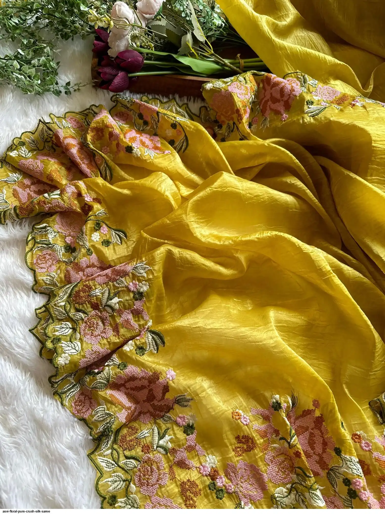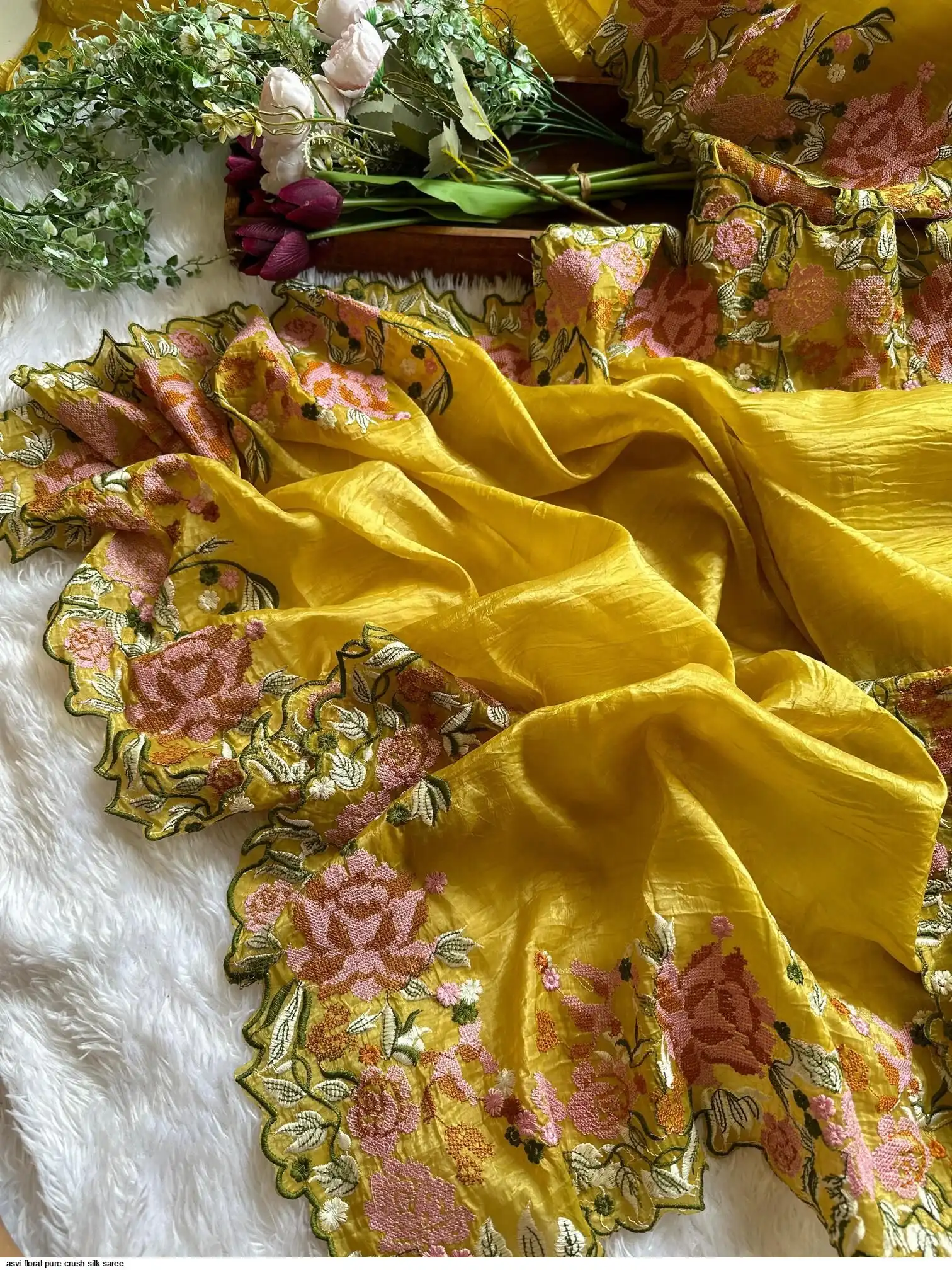 Heavy floral pattern saree with cut work all over the saree and pure silk crush saree with the cut work embroidered border