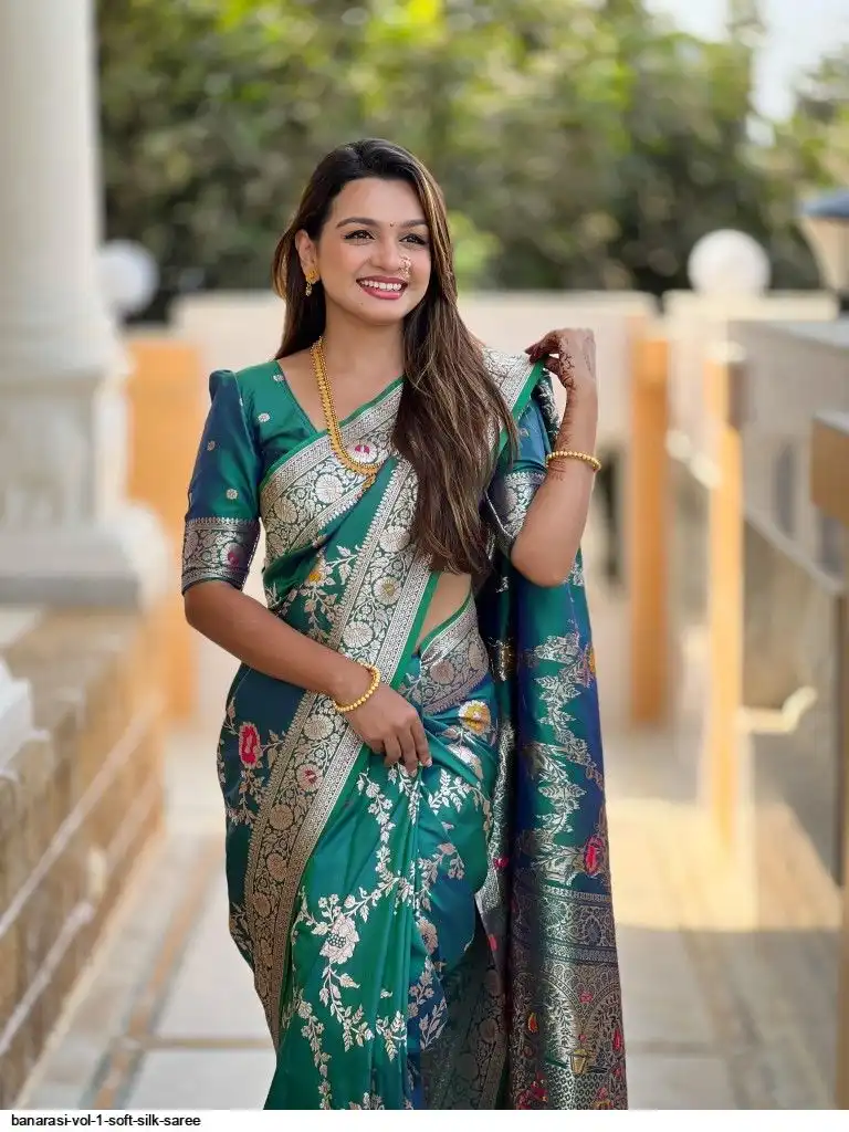 Saree :- Soft Banarasi silk saree with zari weaving Meenakari touchup design all over the saree & Meenakari weawing Rich pallu with Meenakari weawing border & Tassels attached at Pallu End.