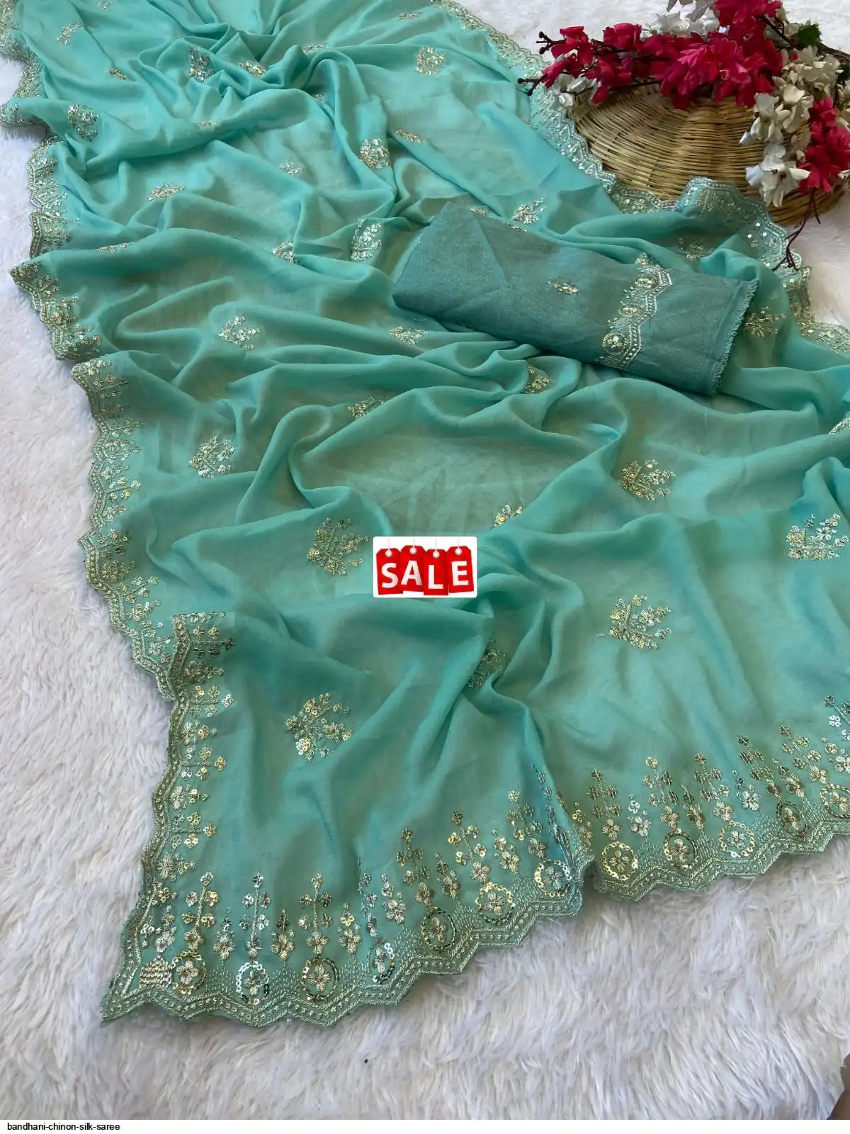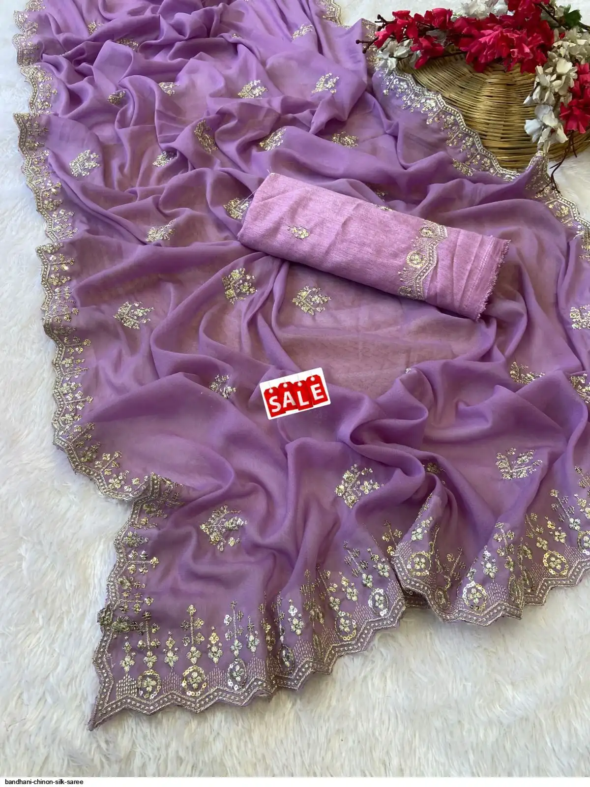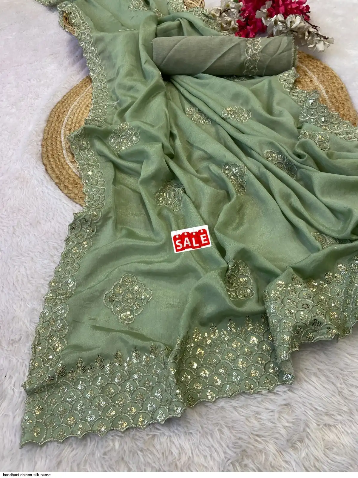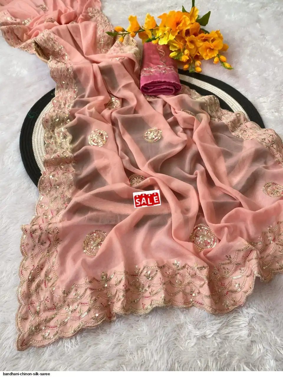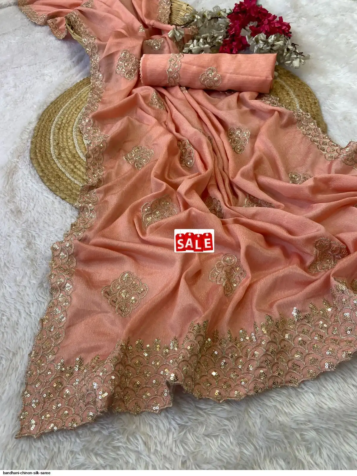 SAREE FABRIC CHINON SILK STAR GEORGETTE AND GEORGETTE BANDHANI PRINT ALL DESIGN HEAVY MULTI AND SEQUANCE C PALLU WORK DONE