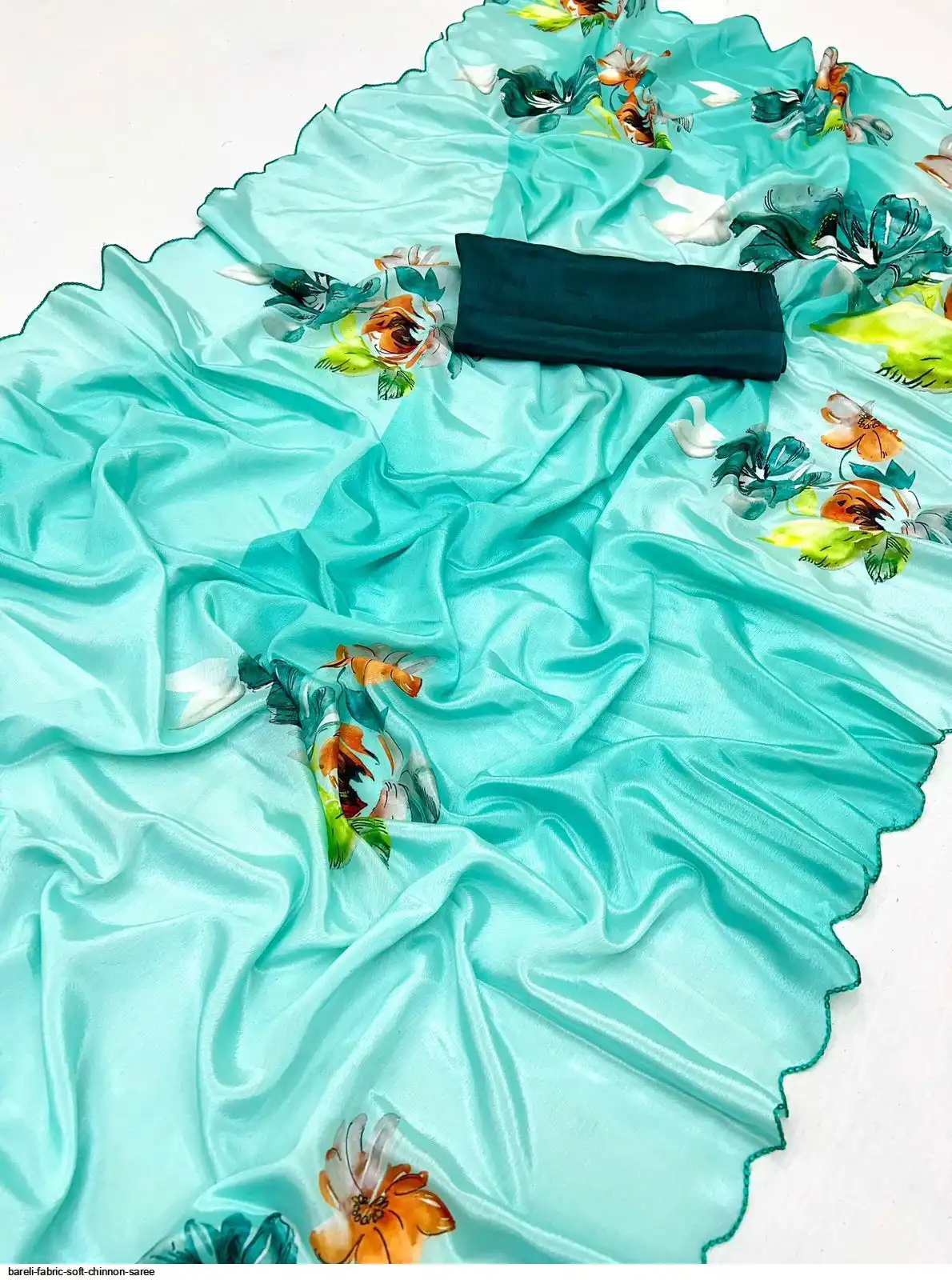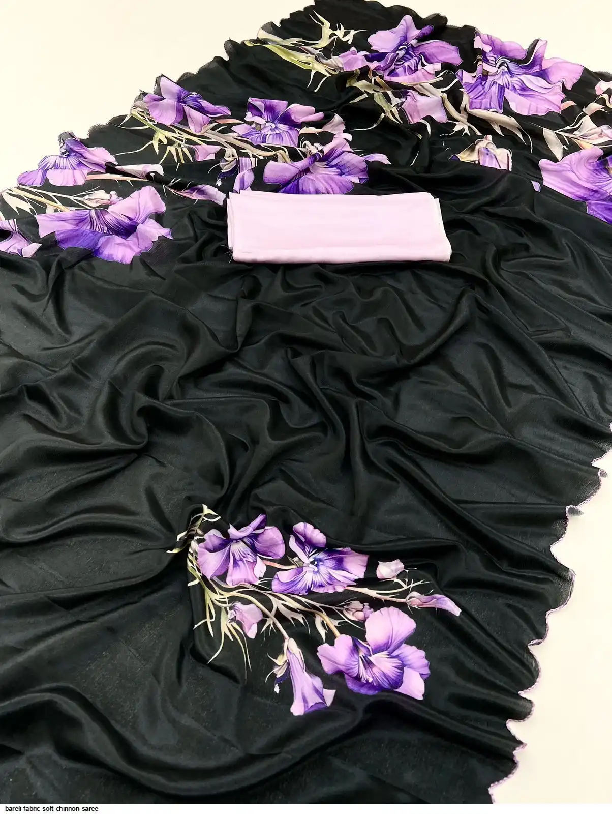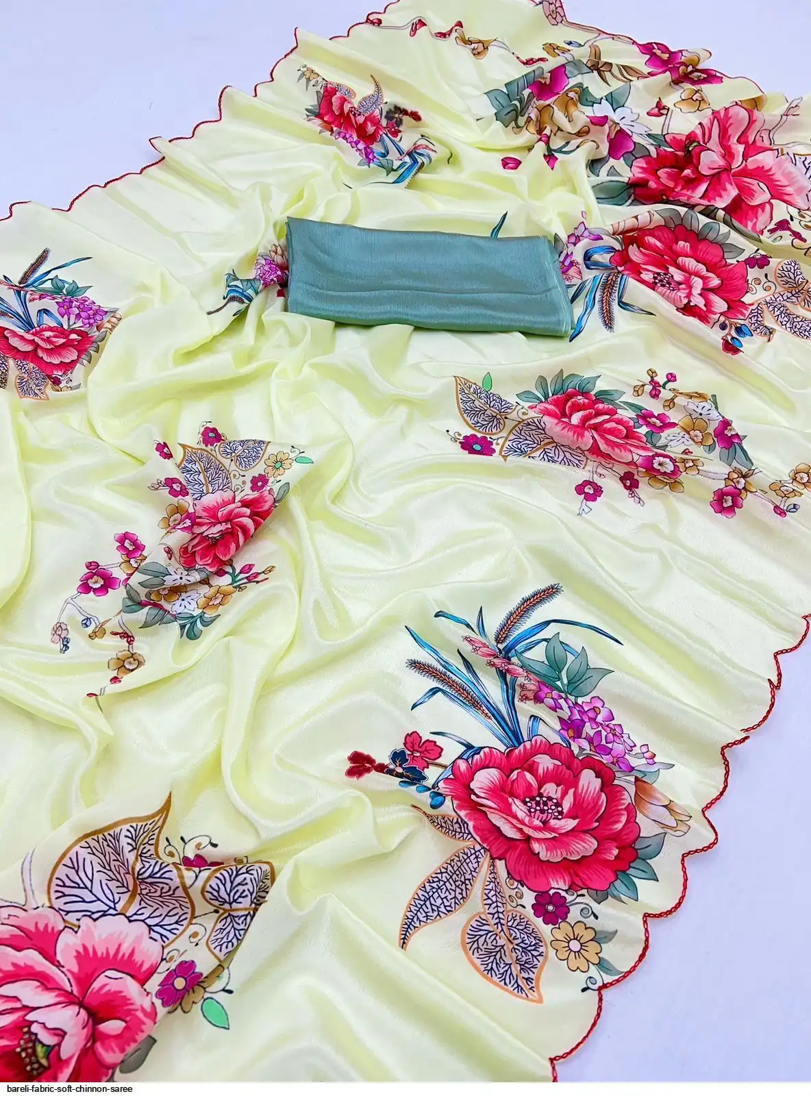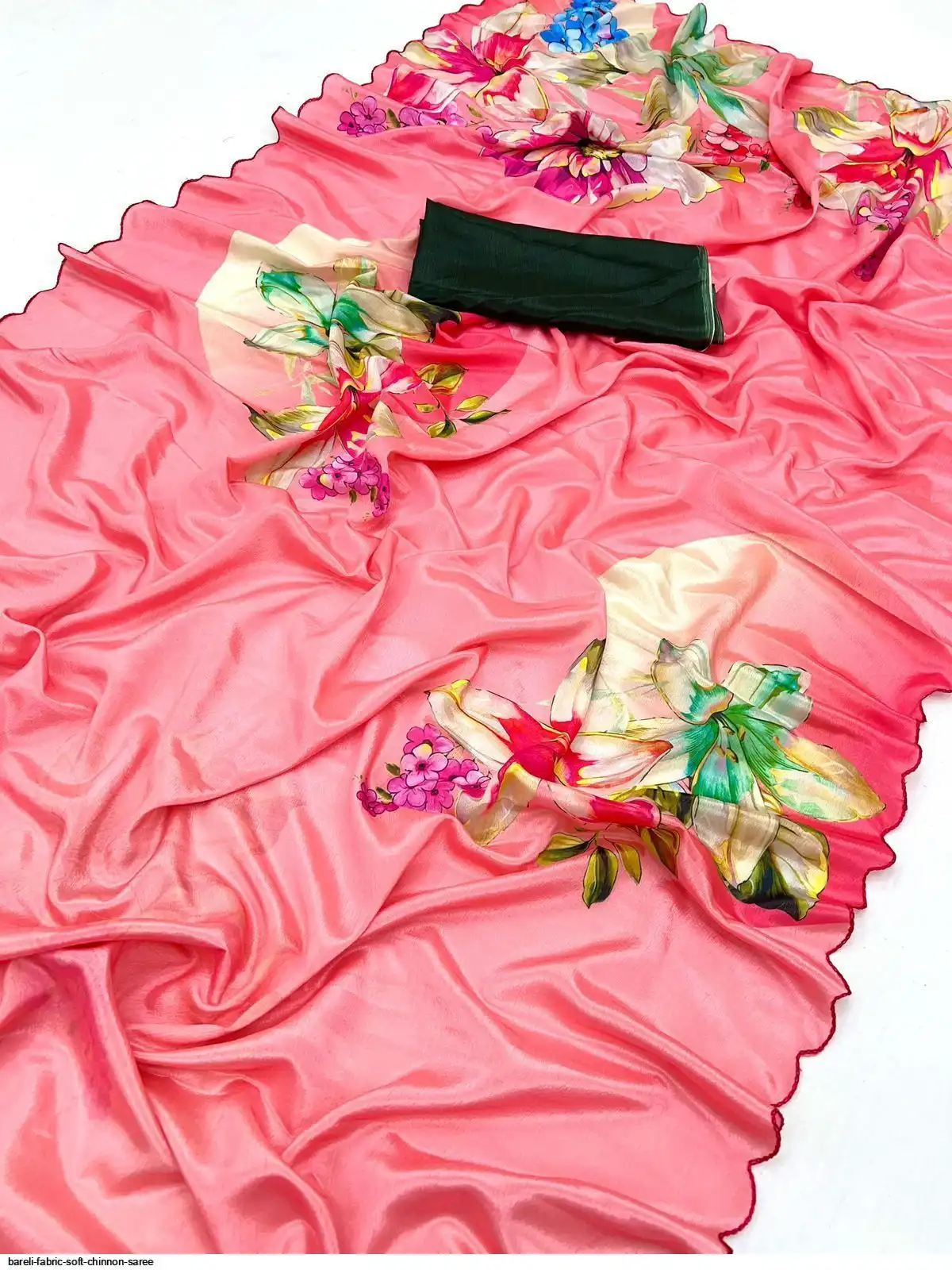 Fabric - Soft Shinon Fabric With Beautiful Floral Print And Contrast Arco Cutwork Bordar With Contrast Blouse