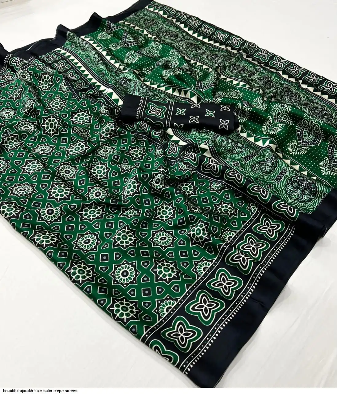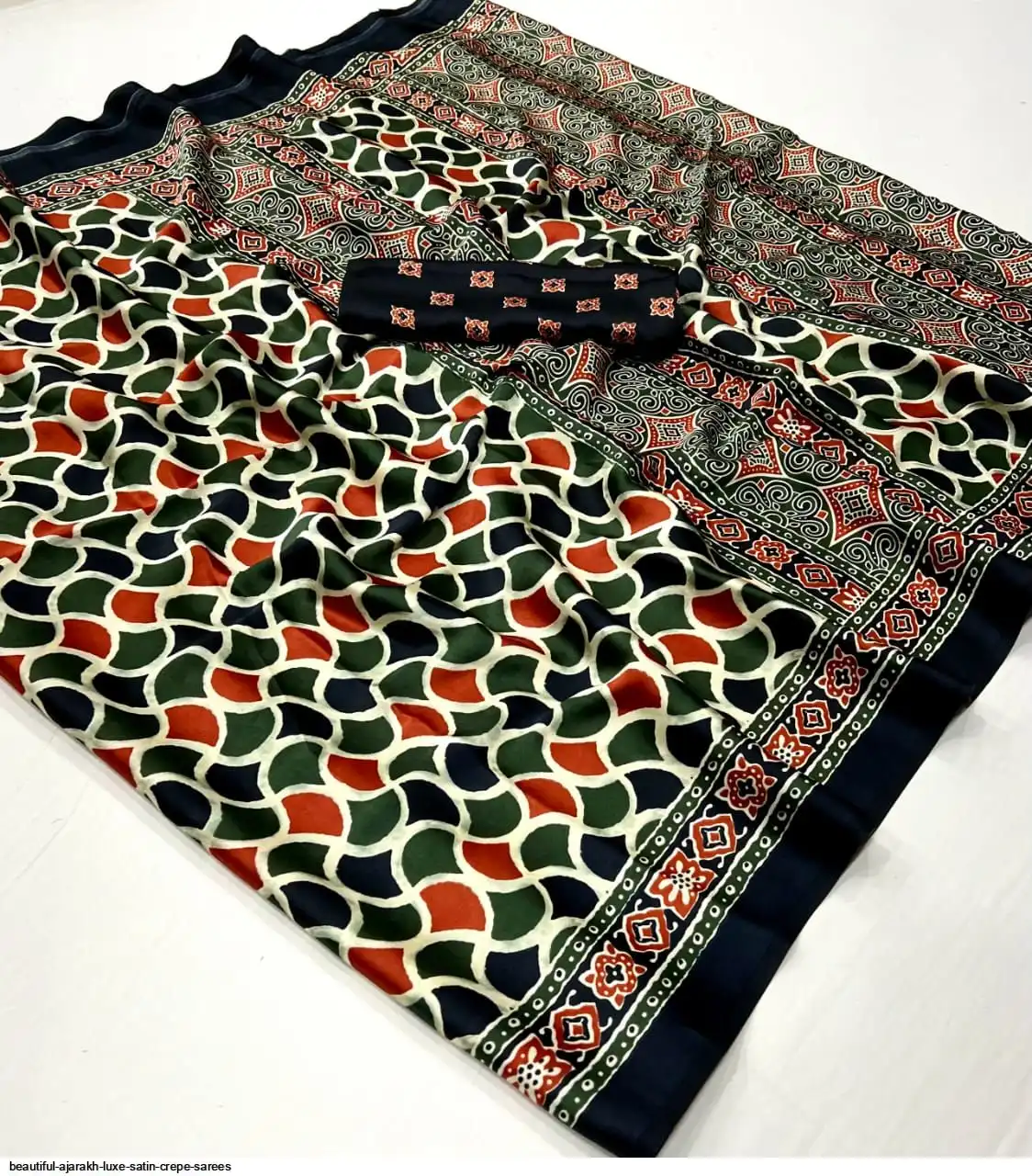 Fabric- PRINTED AJRAKH SATIN CREPE SAREES