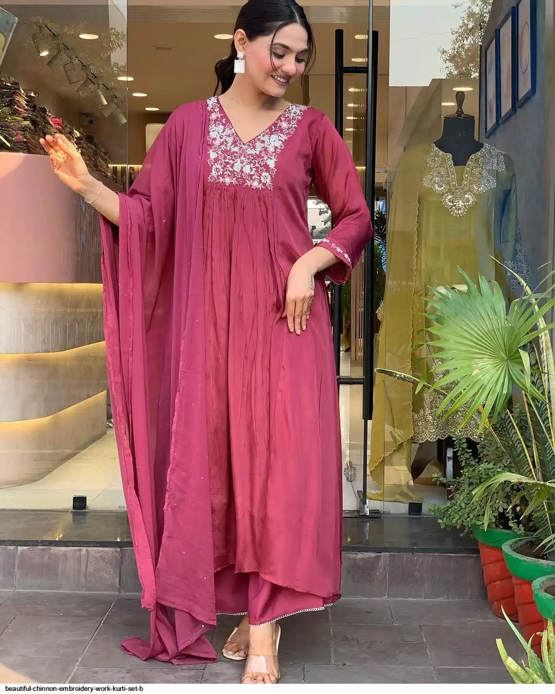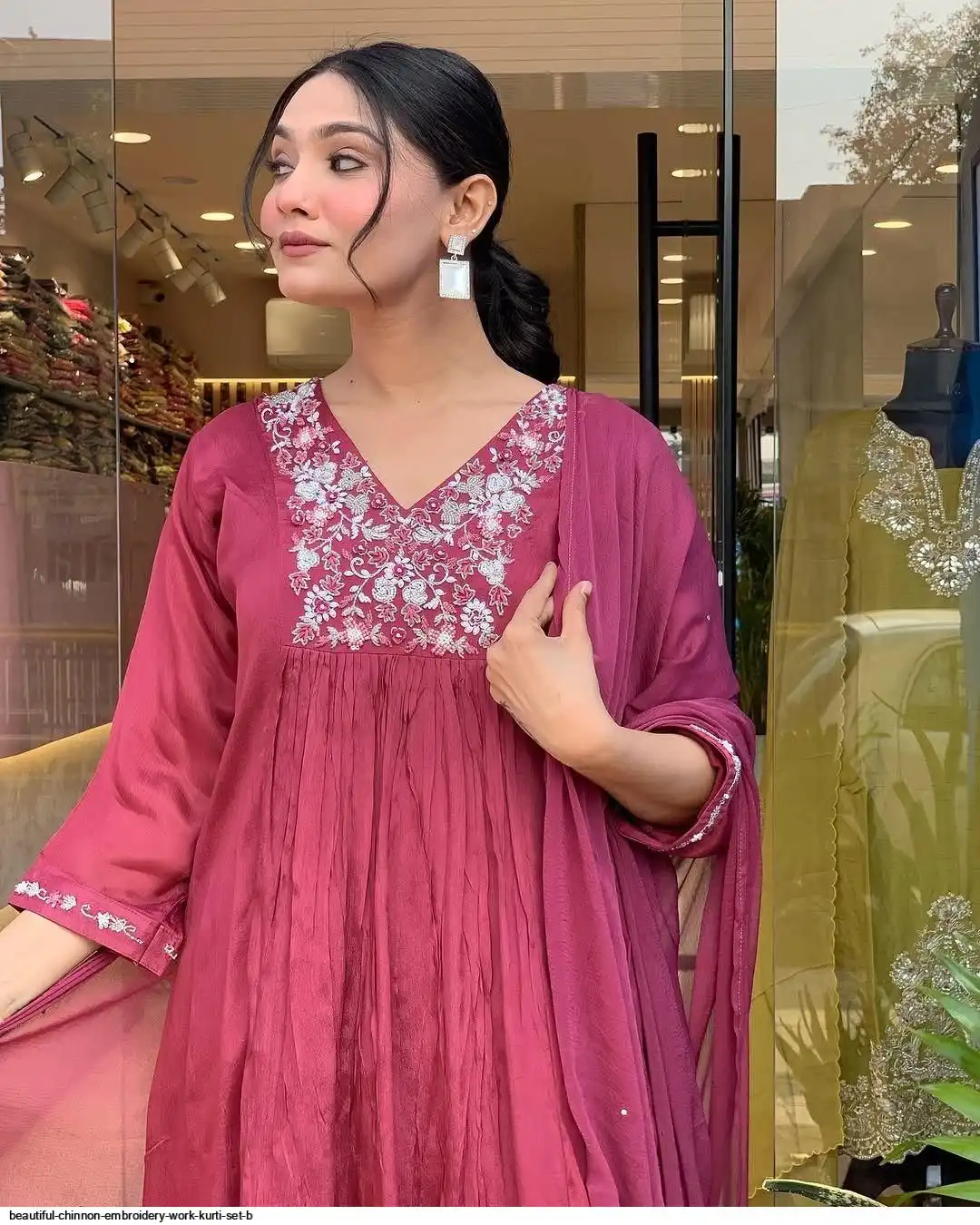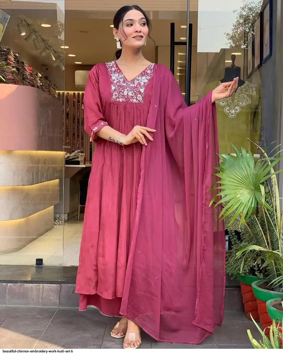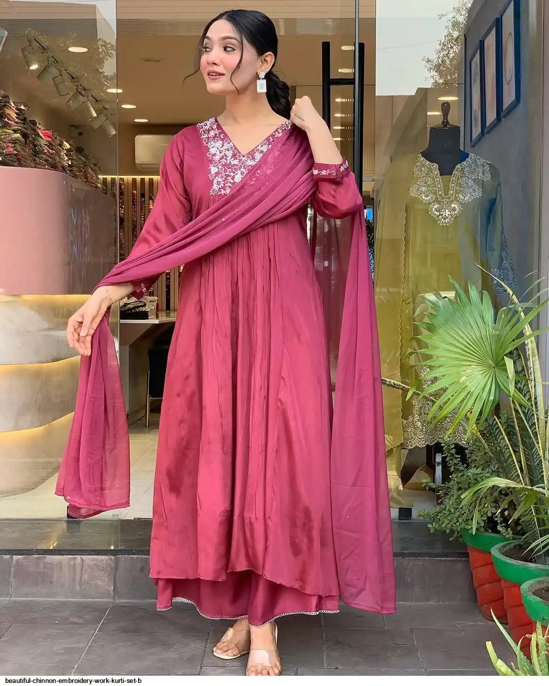 This outfit is a beautiful blend of traditional design with contemporary appeal, perfect for making a stylish statement. The kurti features an Anarkali-style flare from the yoke downwards, complete with full-length sleeves. The overall silhouette appears flowy and comfortable. Lightweight and flowy fabric, characteristic of Chinon. Intricate embroidery work enhances the neckline. Suitable for festive occasions, parties, or semi-formal gatherings.