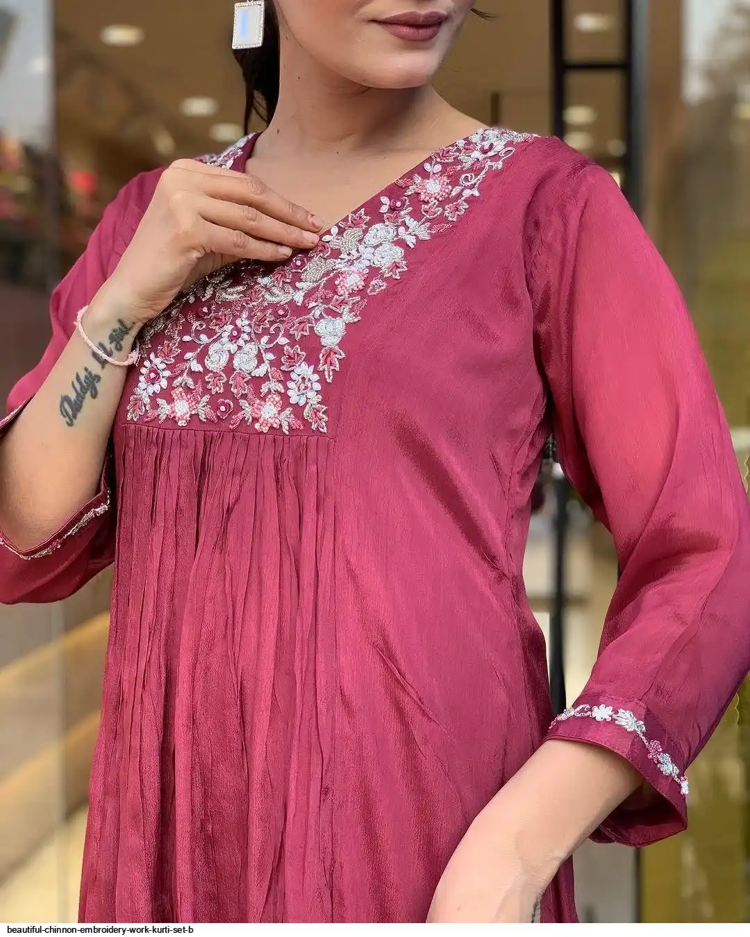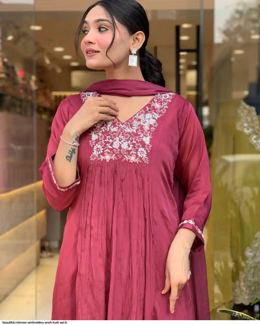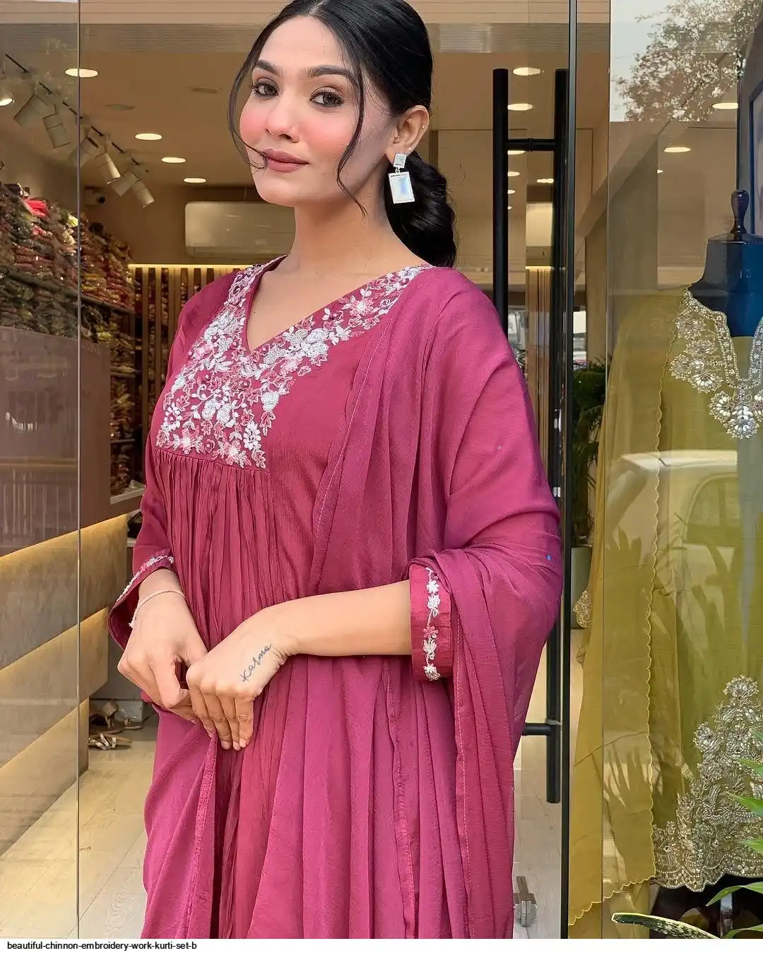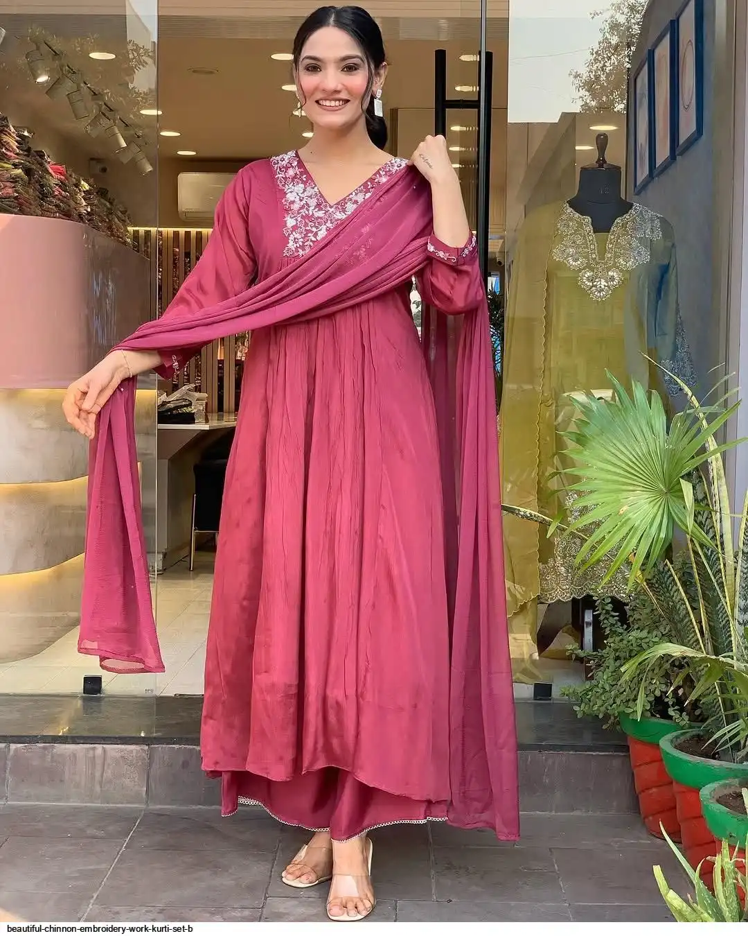 This outfit is a beautiful blend of traditional design with contemporary appeal, perfect for making a stylish statement. The kurti features an Anarkali-style flare from the yoke downwards, complete with full-length sleeves. The overall silhouette appears flowy and comfortable. Lightweight and flowy fabric, characteristic of Chinon. Intricate embroidery work enhances the neckline. Suitable for festive occasions, parties, or semi-formal gatherings.
