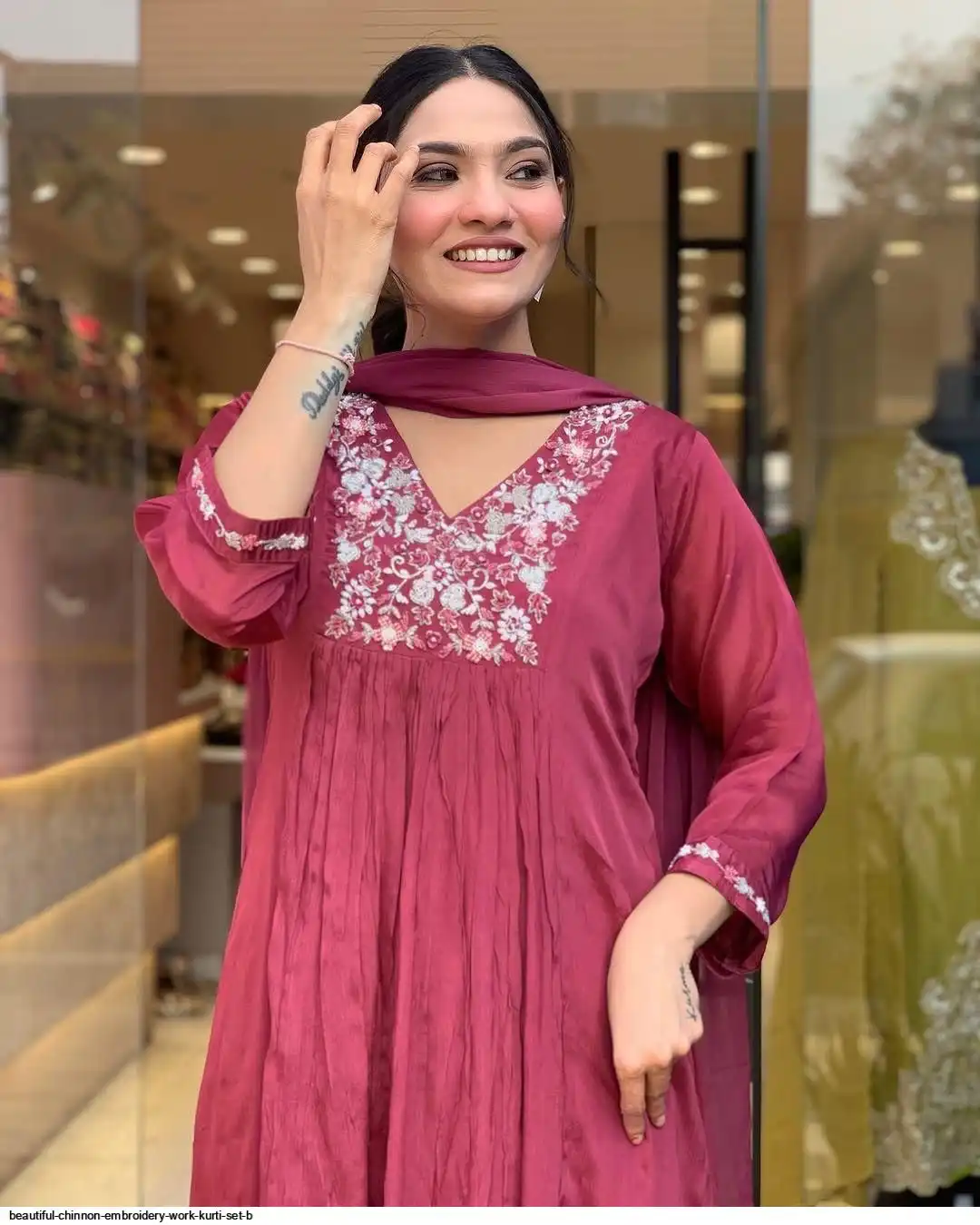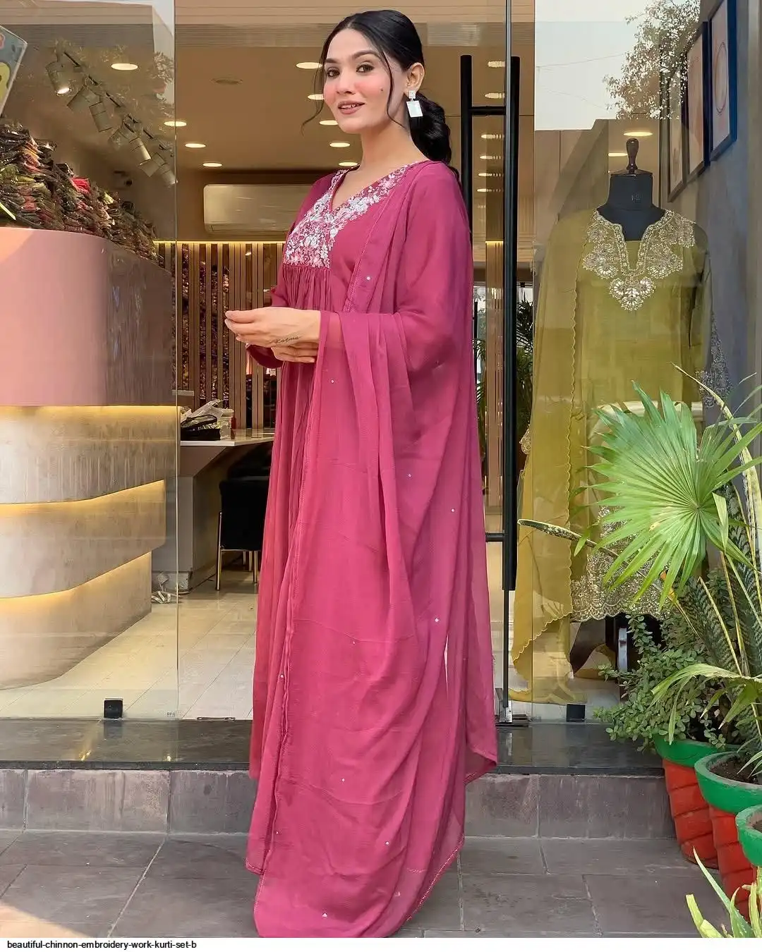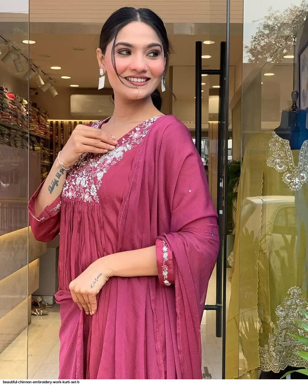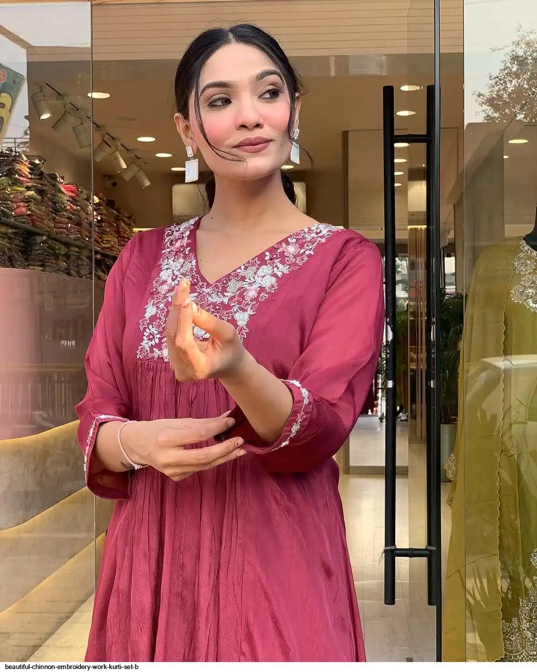 This outfit is a beautiful blend of traditional design with contemporary appeal, perfect for making a stylish statement. The kurti features an Anarkali-style flare from the yoke downwards, complete with full-length sleeves. The overall silhouette appears flowy and comfortable. Lightweight and flowy fabric, characteristic of Chinon. Intricate embroidery work enhances the neckline. Suitable for festive occasions, parties, or semi-formal gatherings.