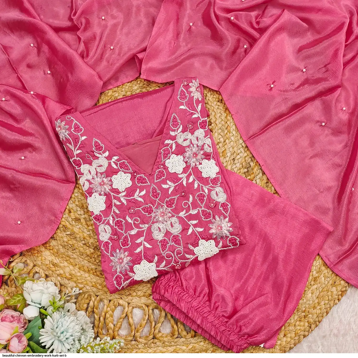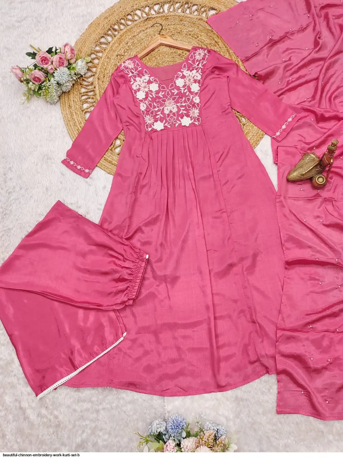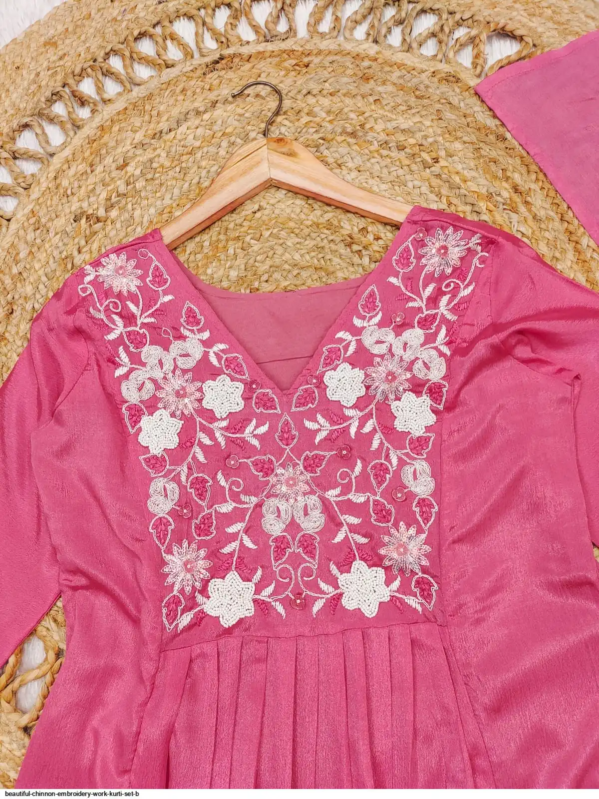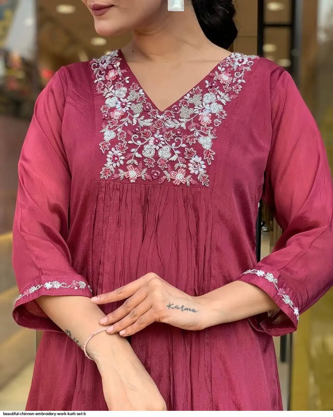 This outfit is a beautiful blend of traditional design with contemporary appeal, perfect for making a stylish statement. The kurti features an Anarkali-style flare from the yoke downwards, complete with full-length sleeves. The overall silhouette appears flowy and comfortable. Lightweight and flowy fabric, characteristic of Chinon. Intricate embroidery work enhances the neckline. Suitable for festive occasions, parties, or semi-formal gatherings.