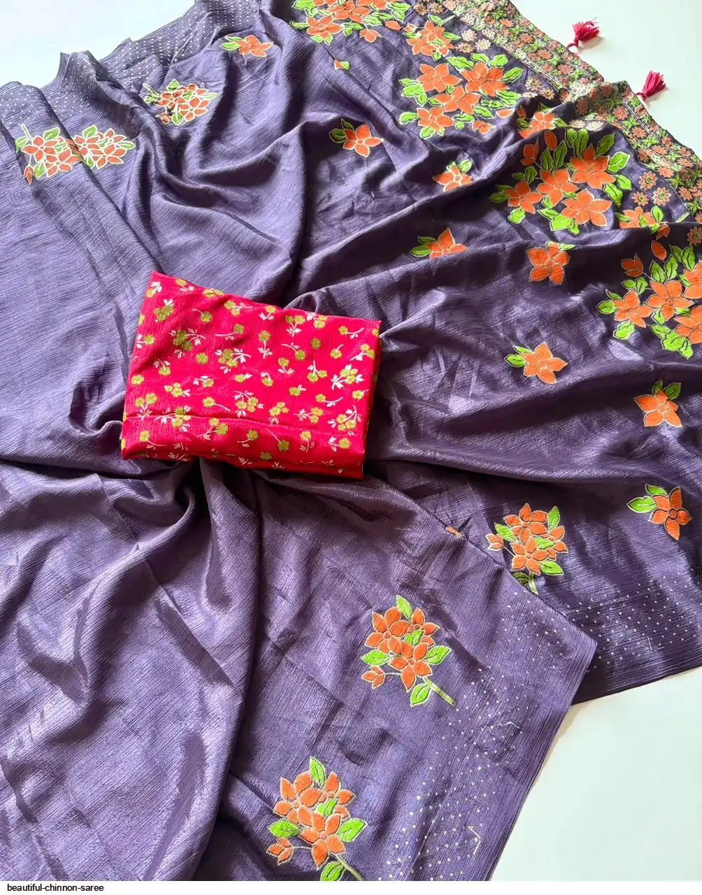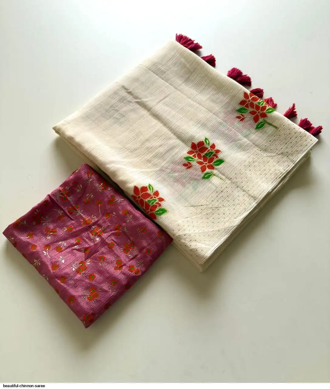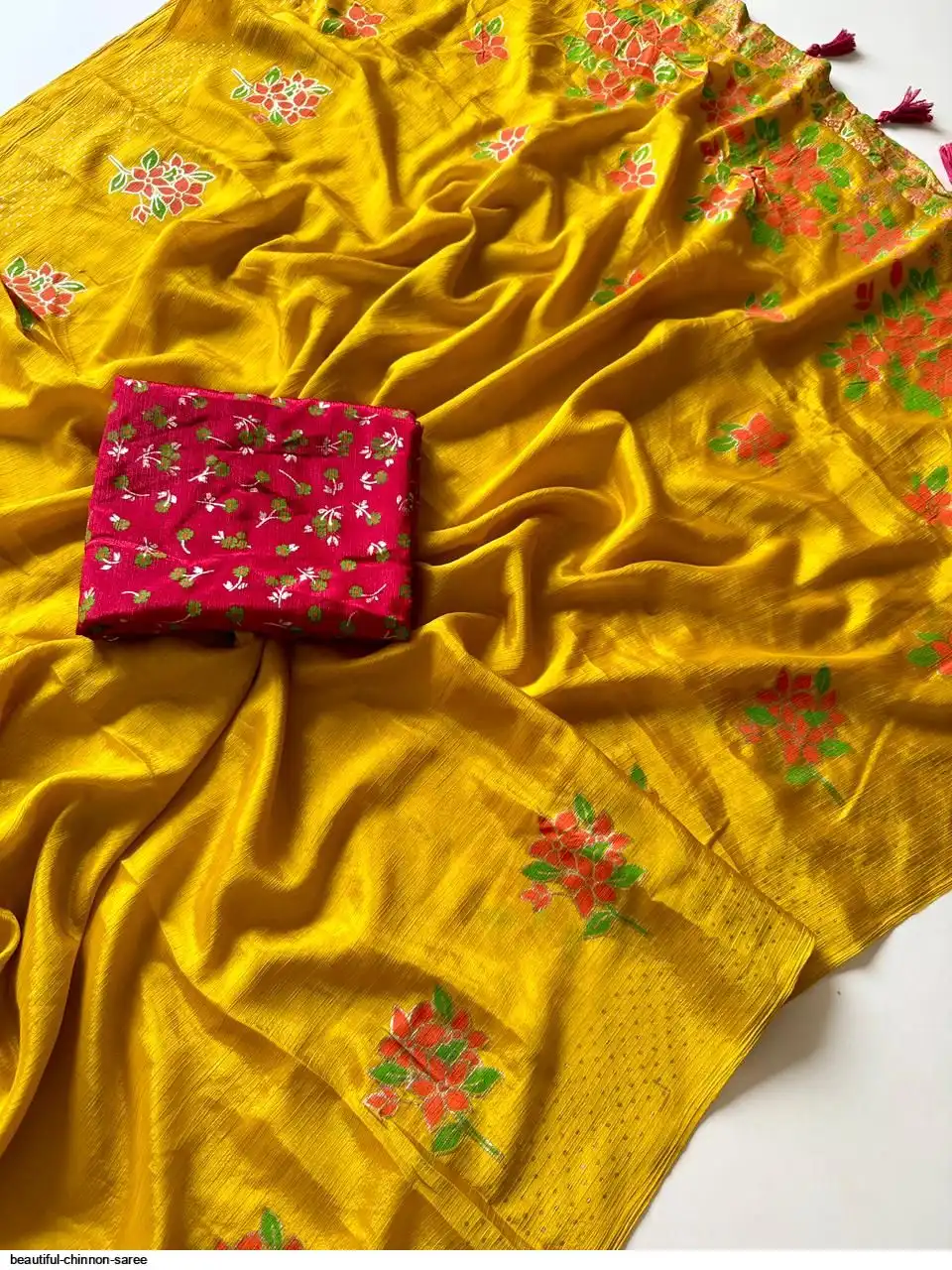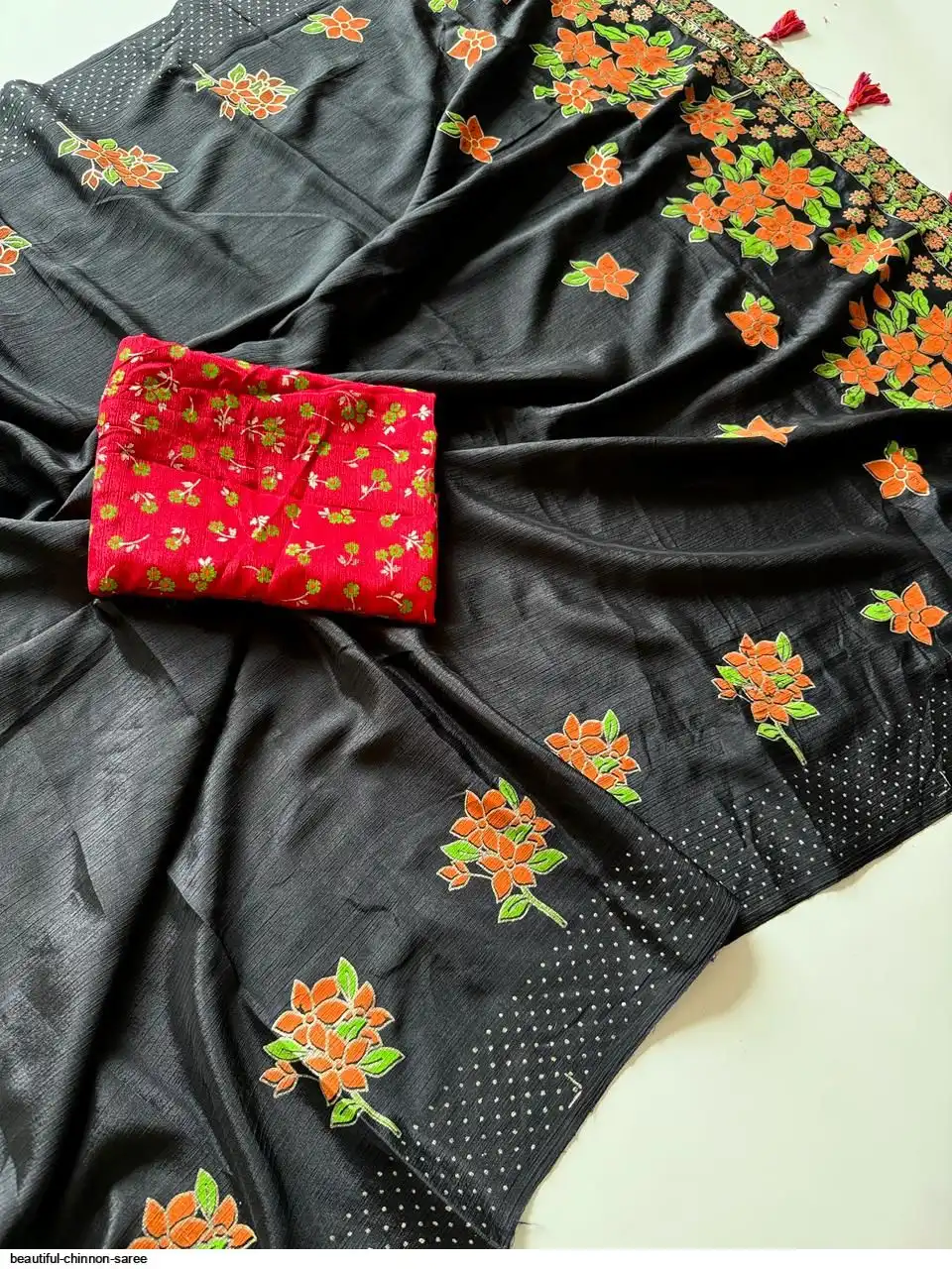 ▶️ Fabric - Heavy Shinon Fabric With Beautiful Floral Table Foil Print And Contrast Matching Blouse