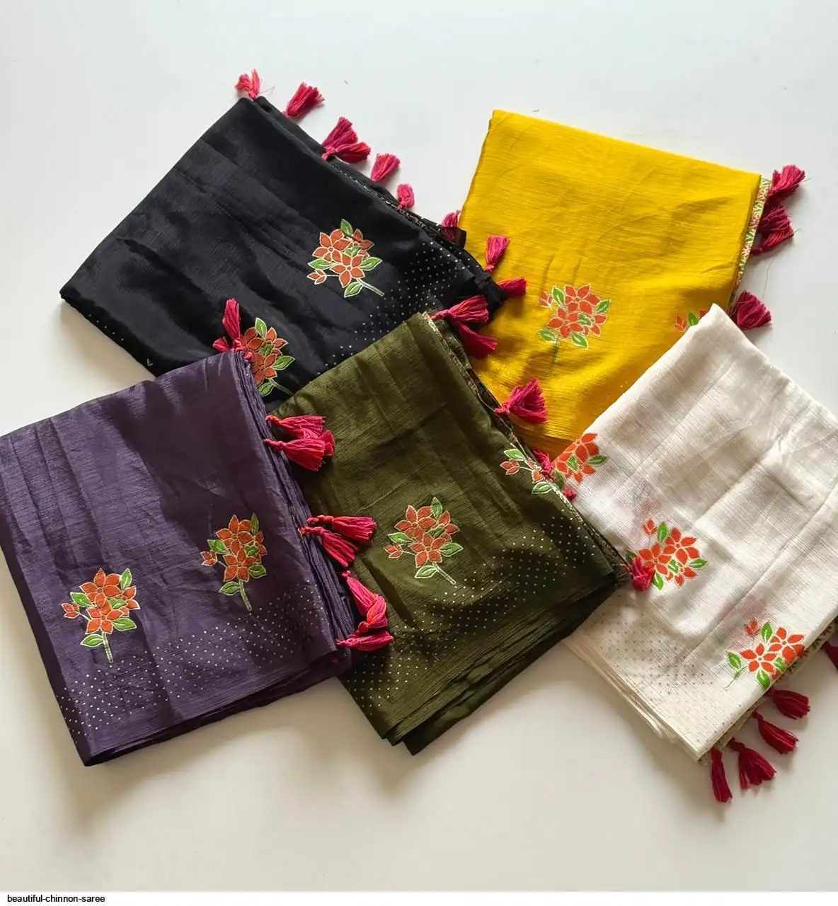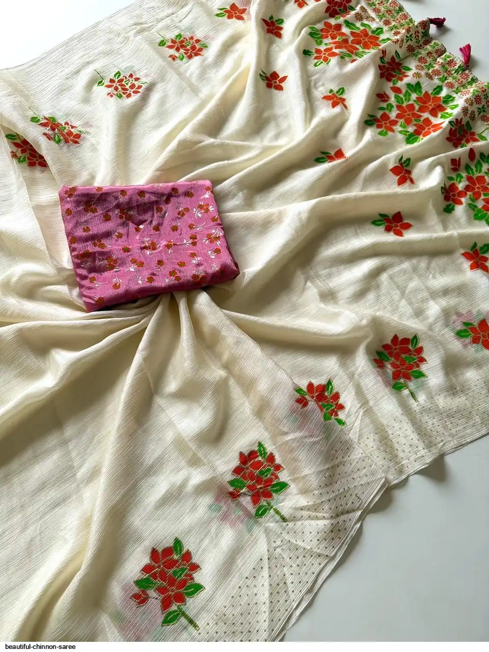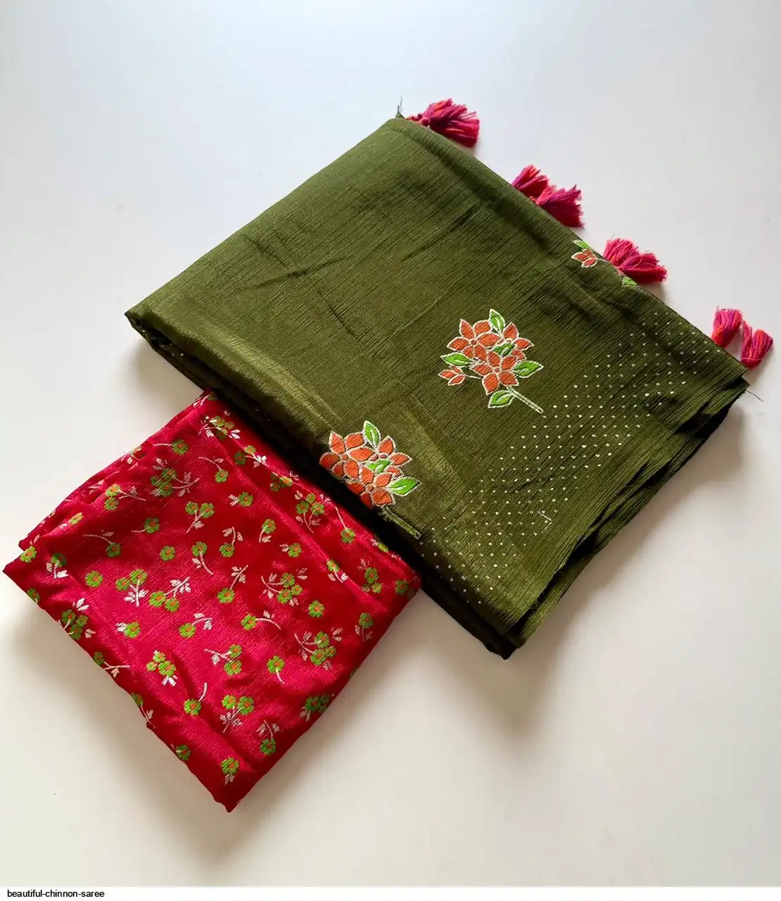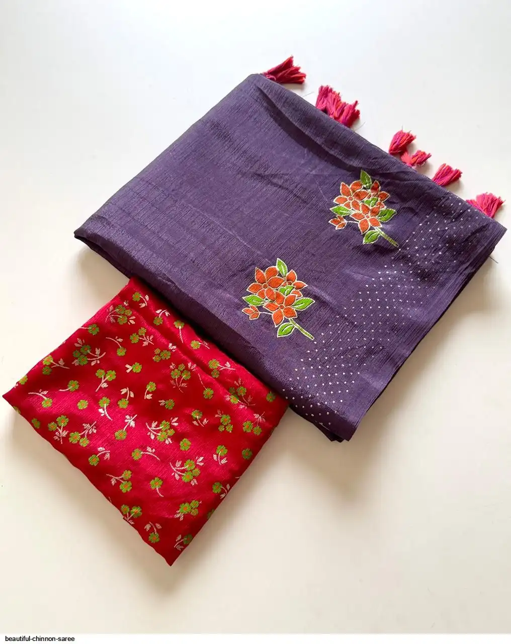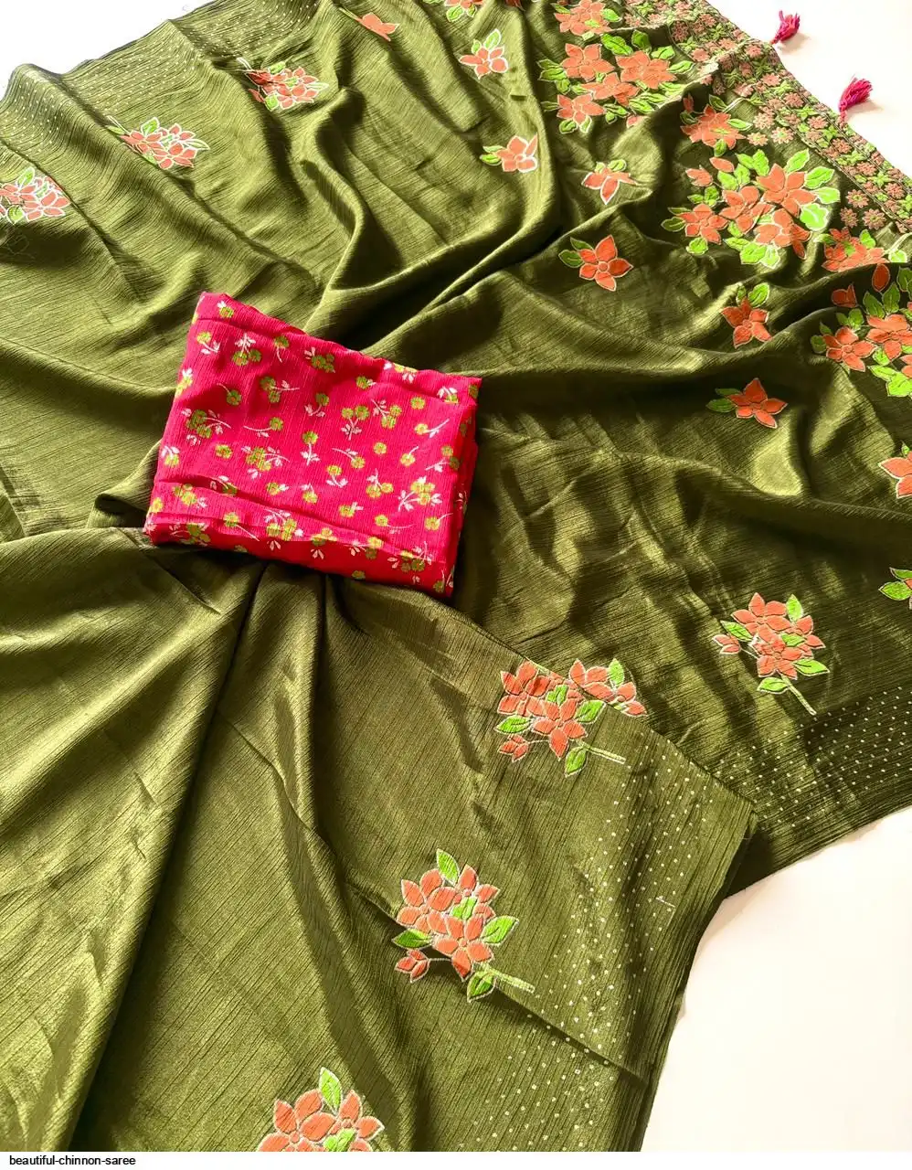 ▶️ Fabric - Heavy Shinon Fabric With Beautiful Floral Table Foil Print And Contrast Matching Blouse