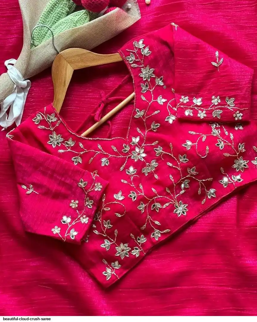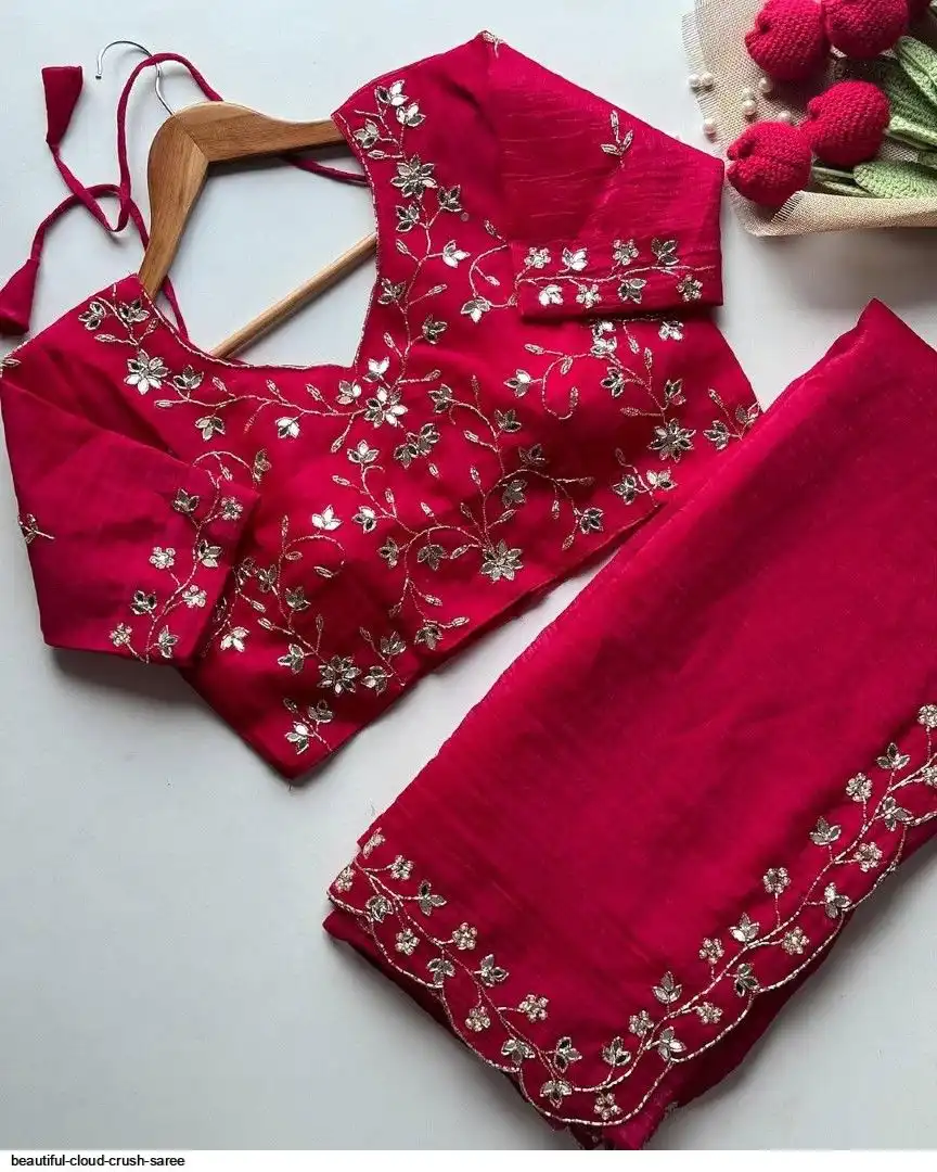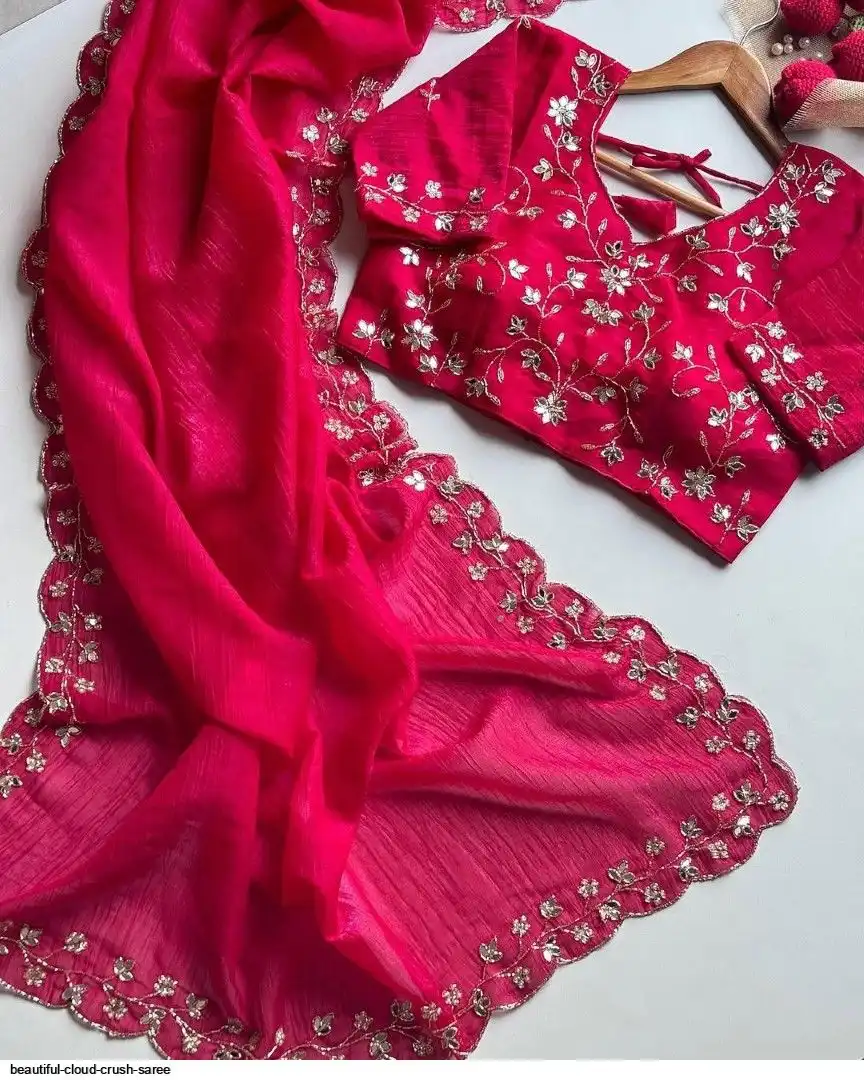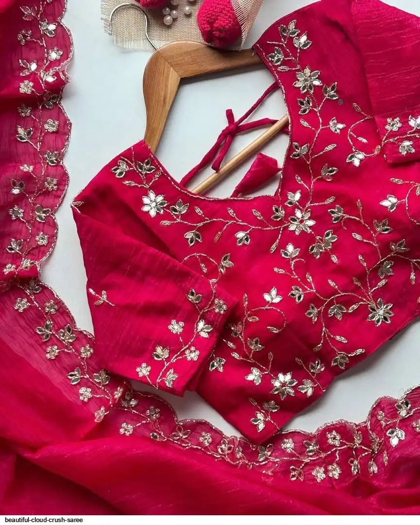 Beautiful handwork all over cloud crush saree and running unstitch blouse with handwork