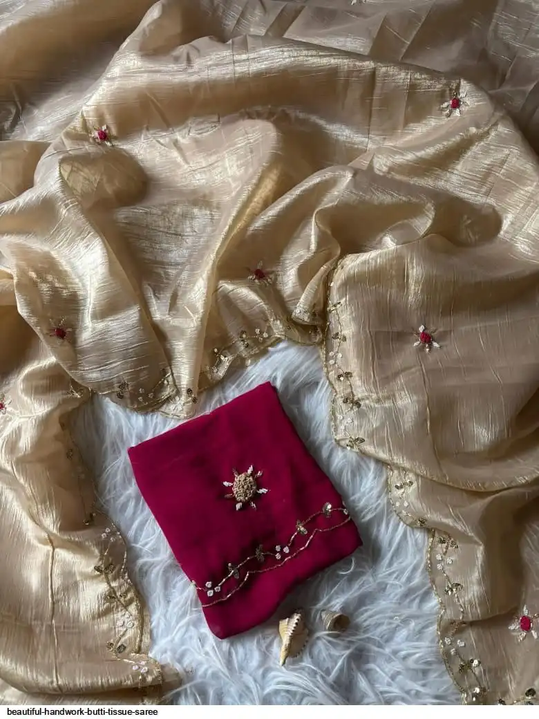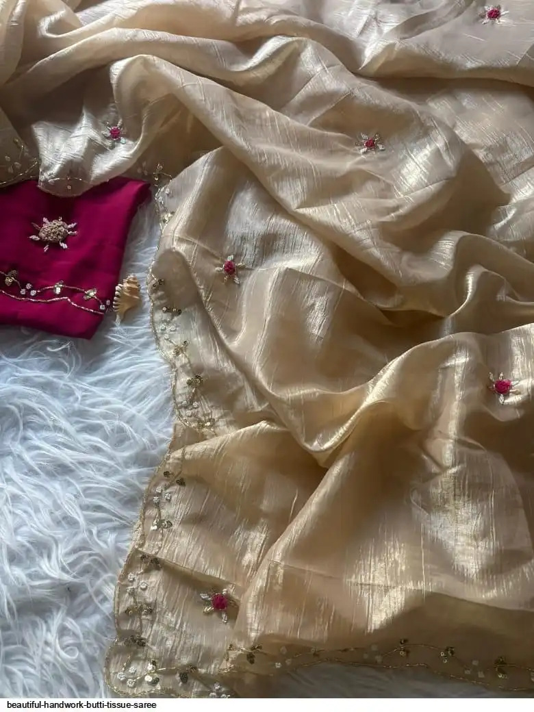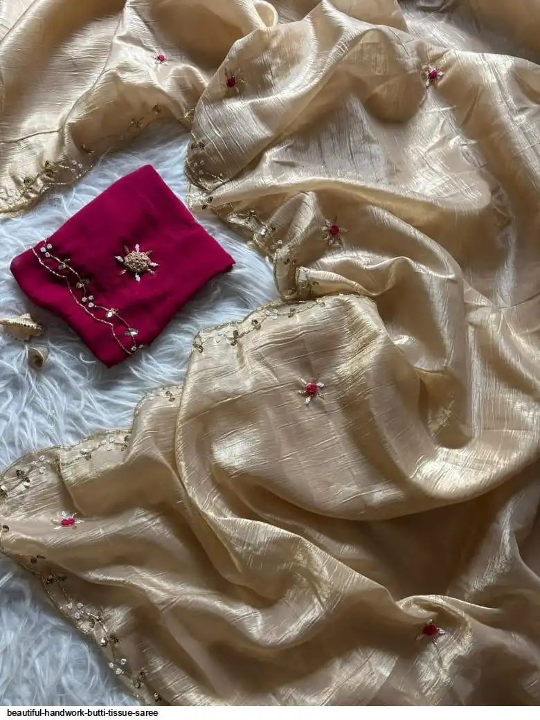 Premium Candy Crush Tissue Saree having beautiful handwork butti (khatliwork)and Sequins work allover saree with cutdana and moti work with aarco border