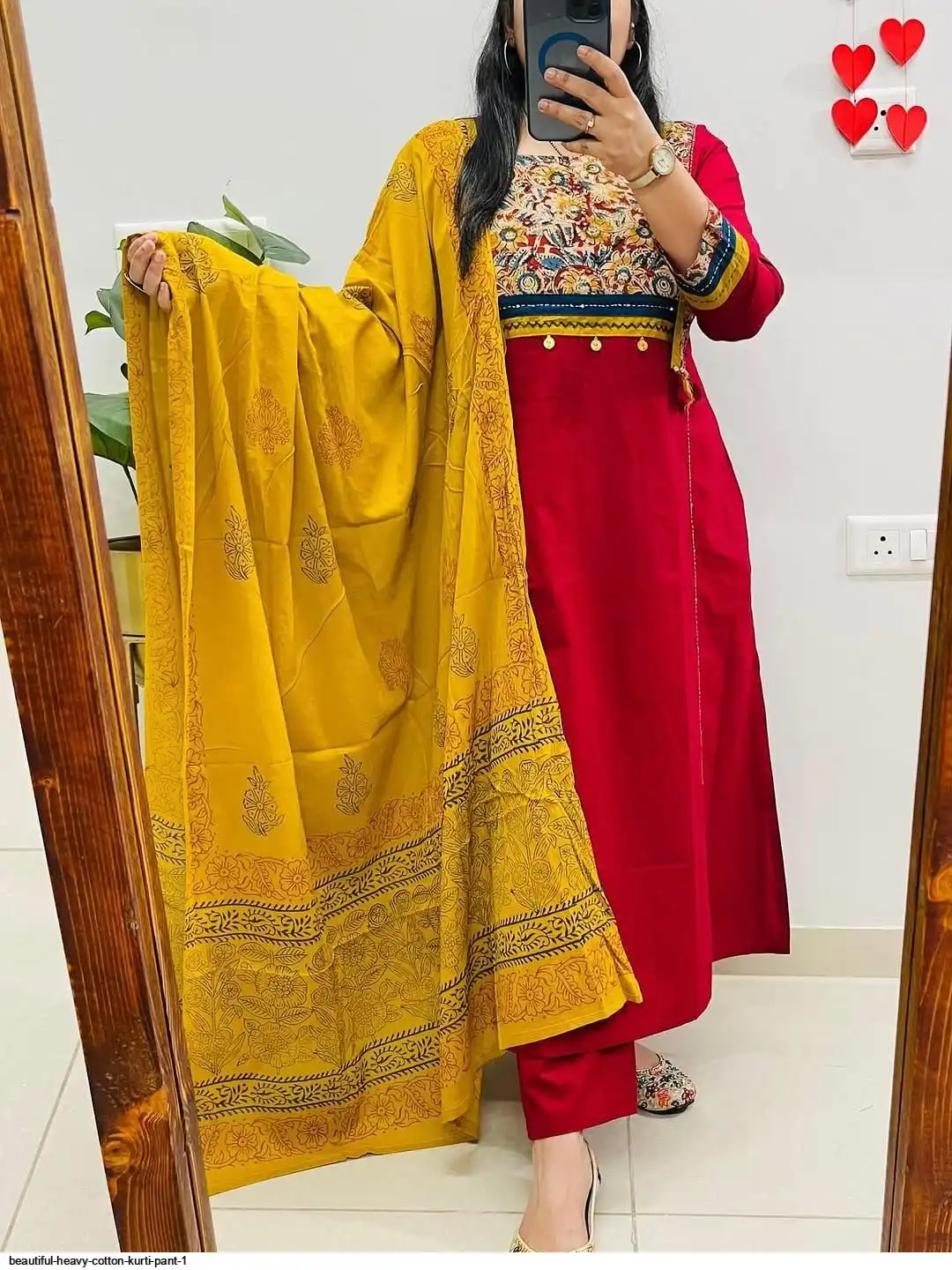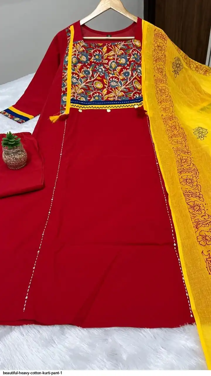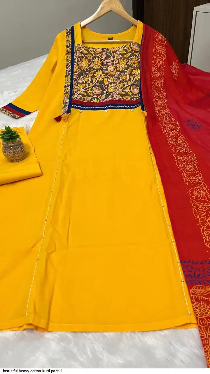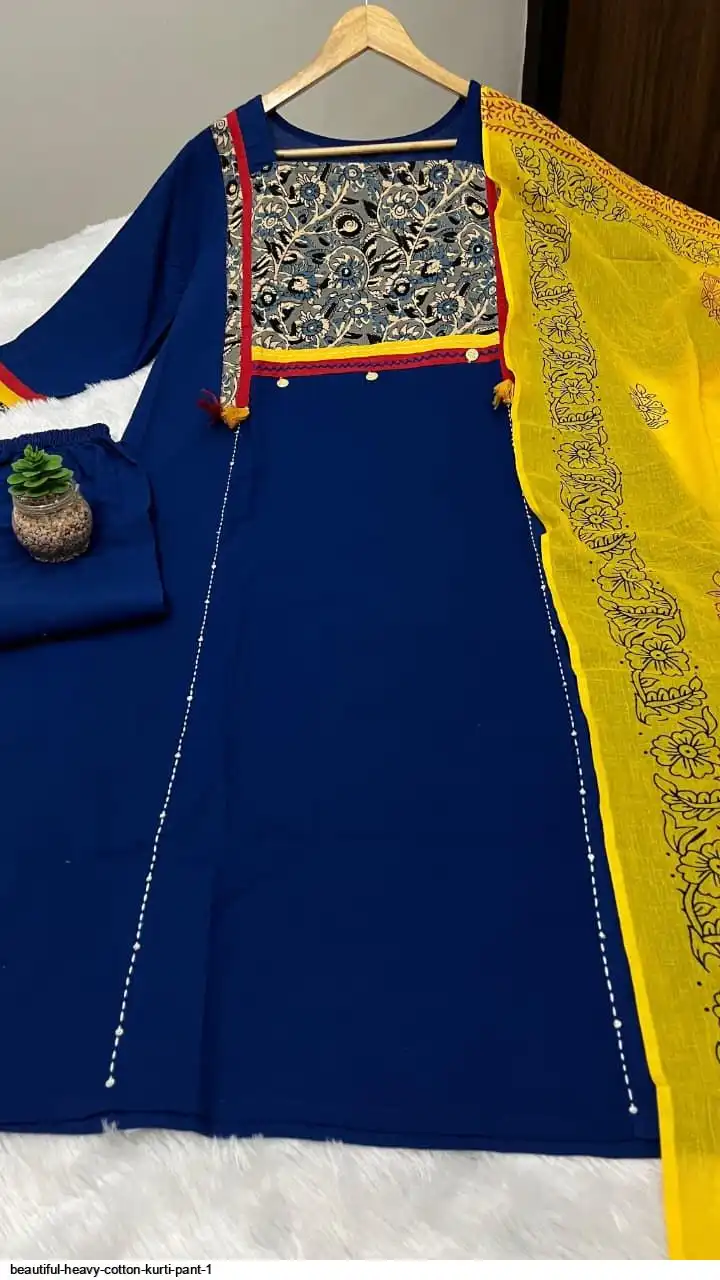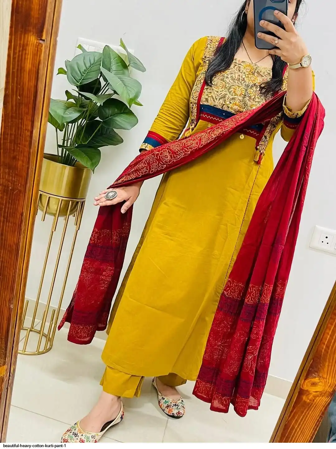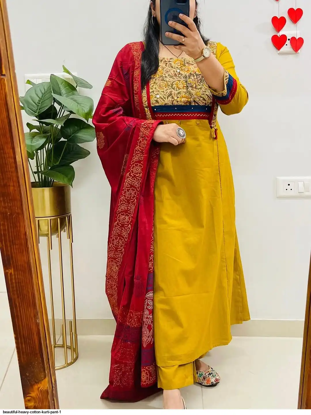 Pure fine Cotton fabric 🪡🧶 heavy yog work and sika work Kurti with Pant with cotton 100-100 Dupatta