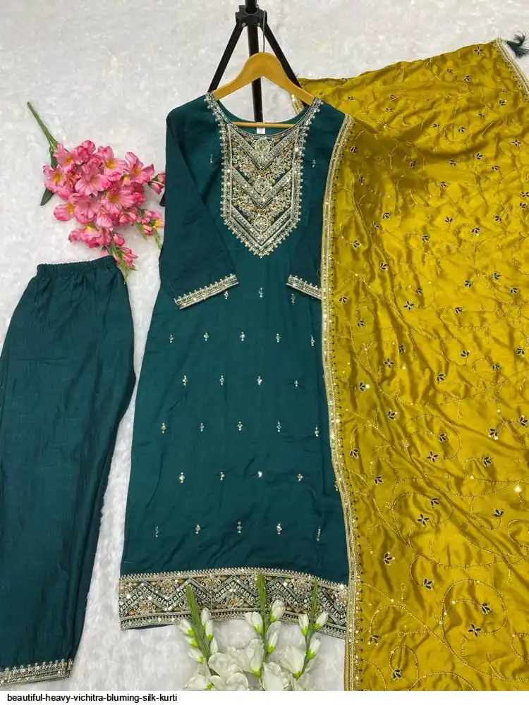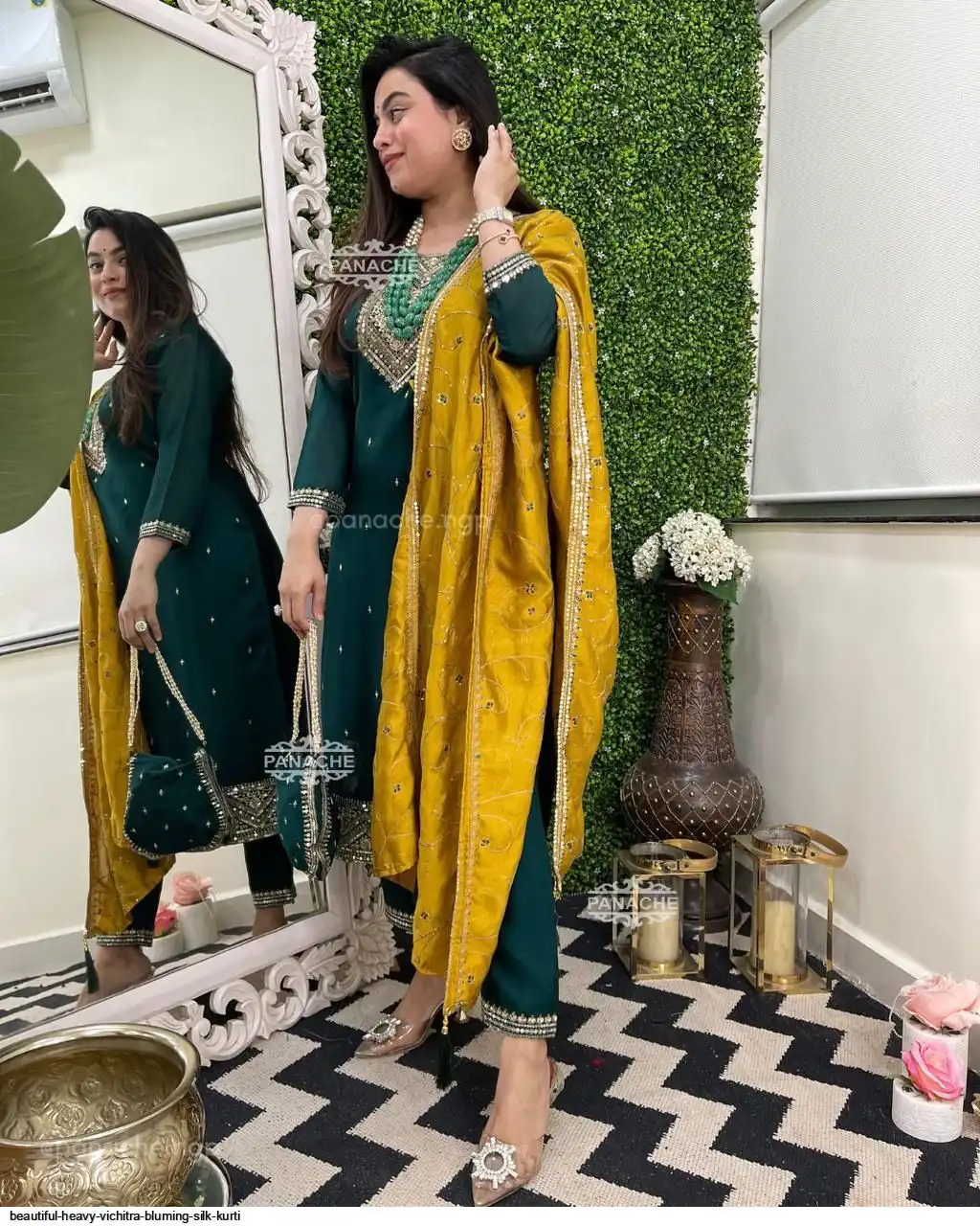 Presenting Beautiful Heavy VICHITRA BLUMING Silk Fabric designer festive wear kurti pant and duppta with Coding work with lining