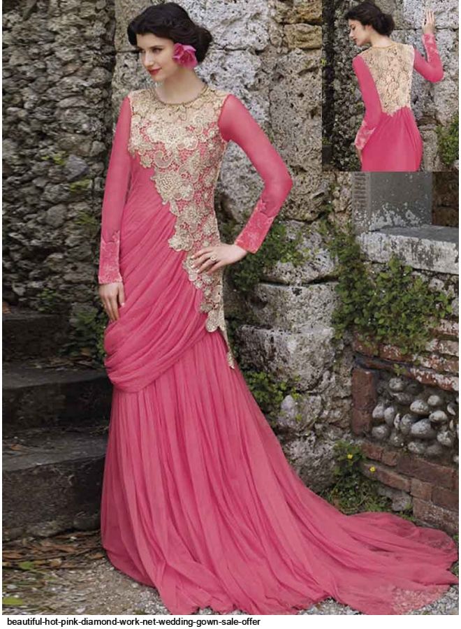 Beautiful Hot Pink Cut Work Diamond Work Net Wedding Gown.This beautiful gown is showing Embroidery work done on neck with cut Work and Diamond Work. The suit is designed with different fabrics, like; net top,santoon inner and bottom,Net sleeves with work and net dupatta.