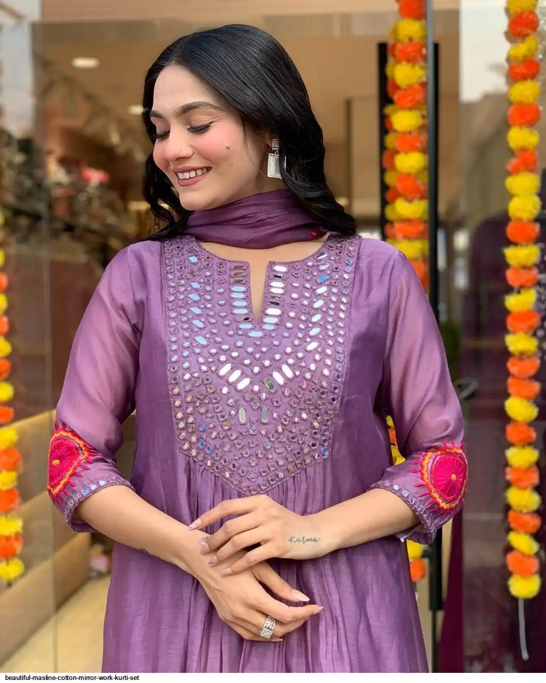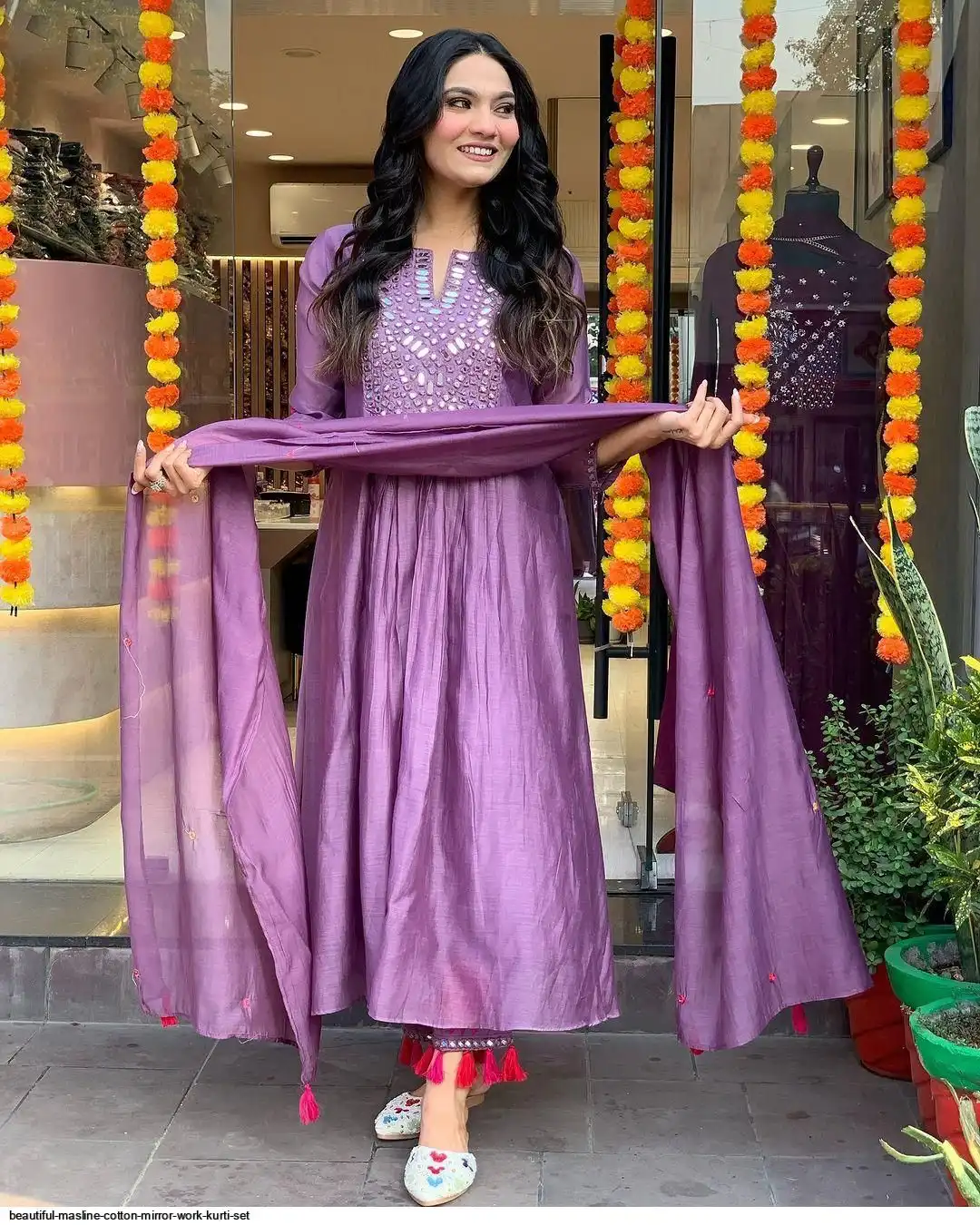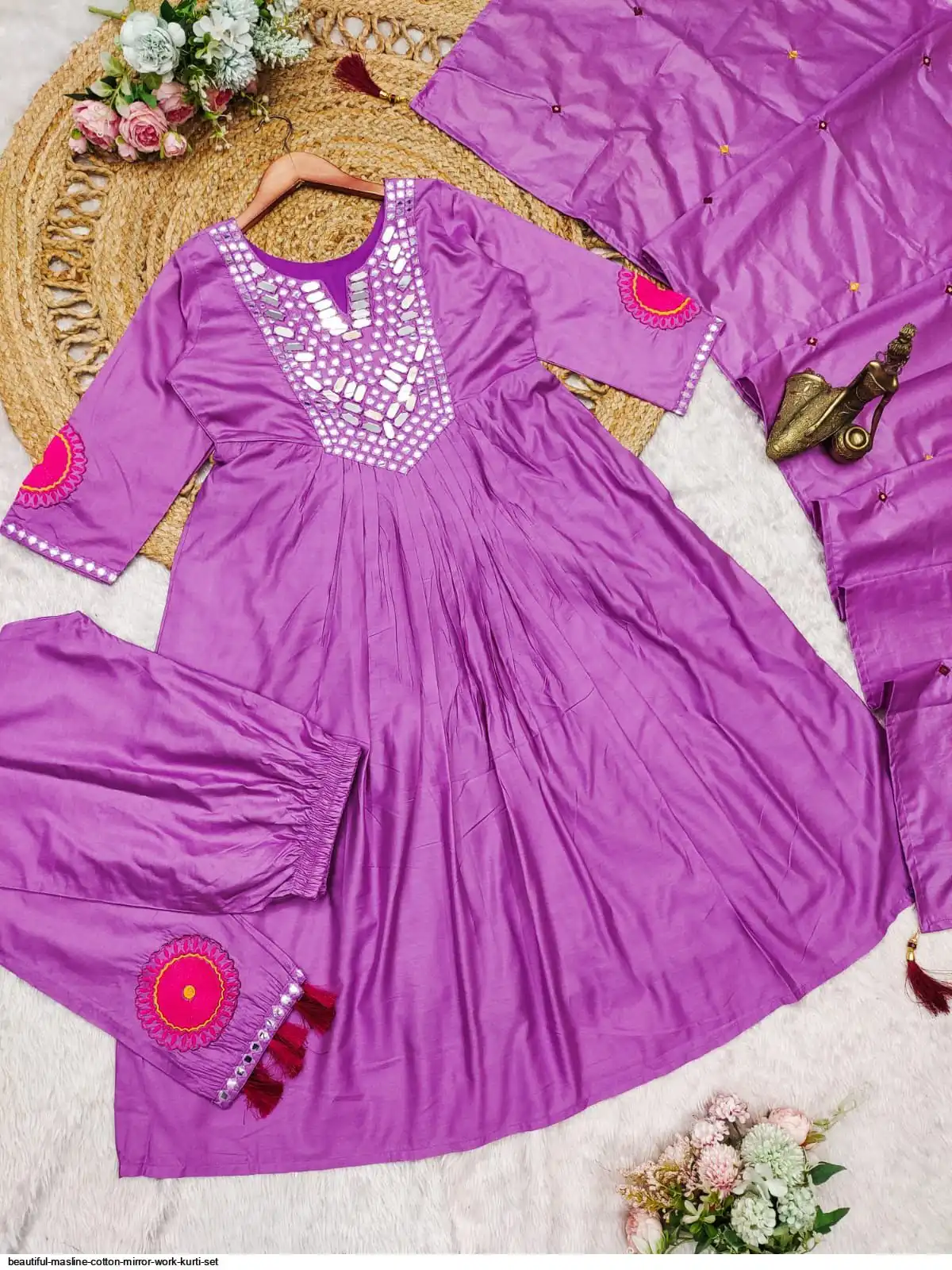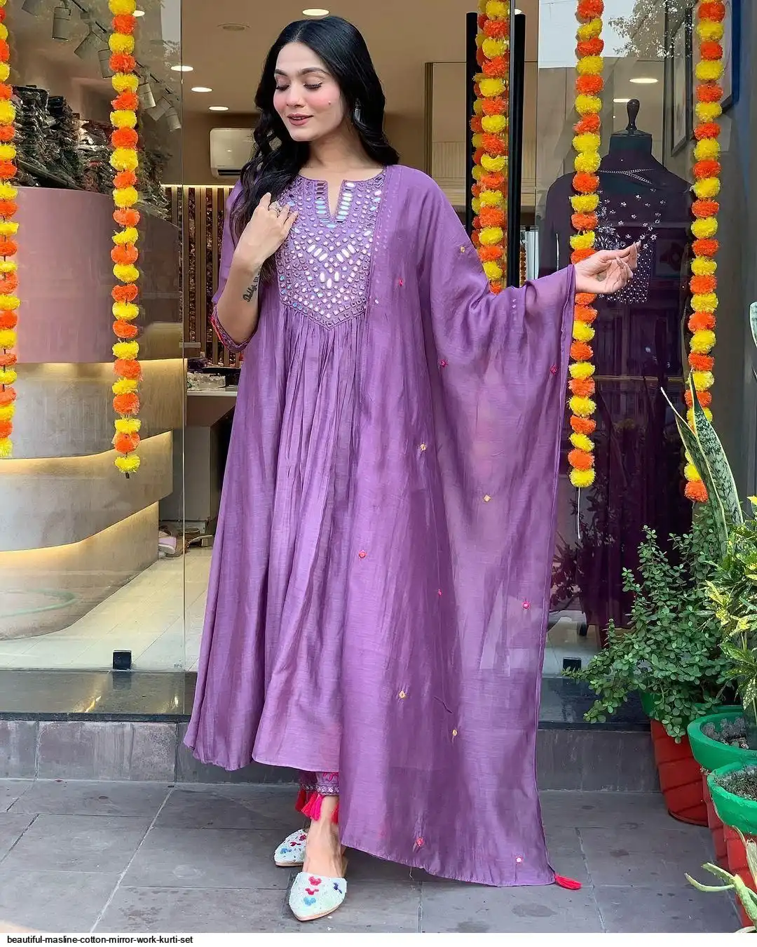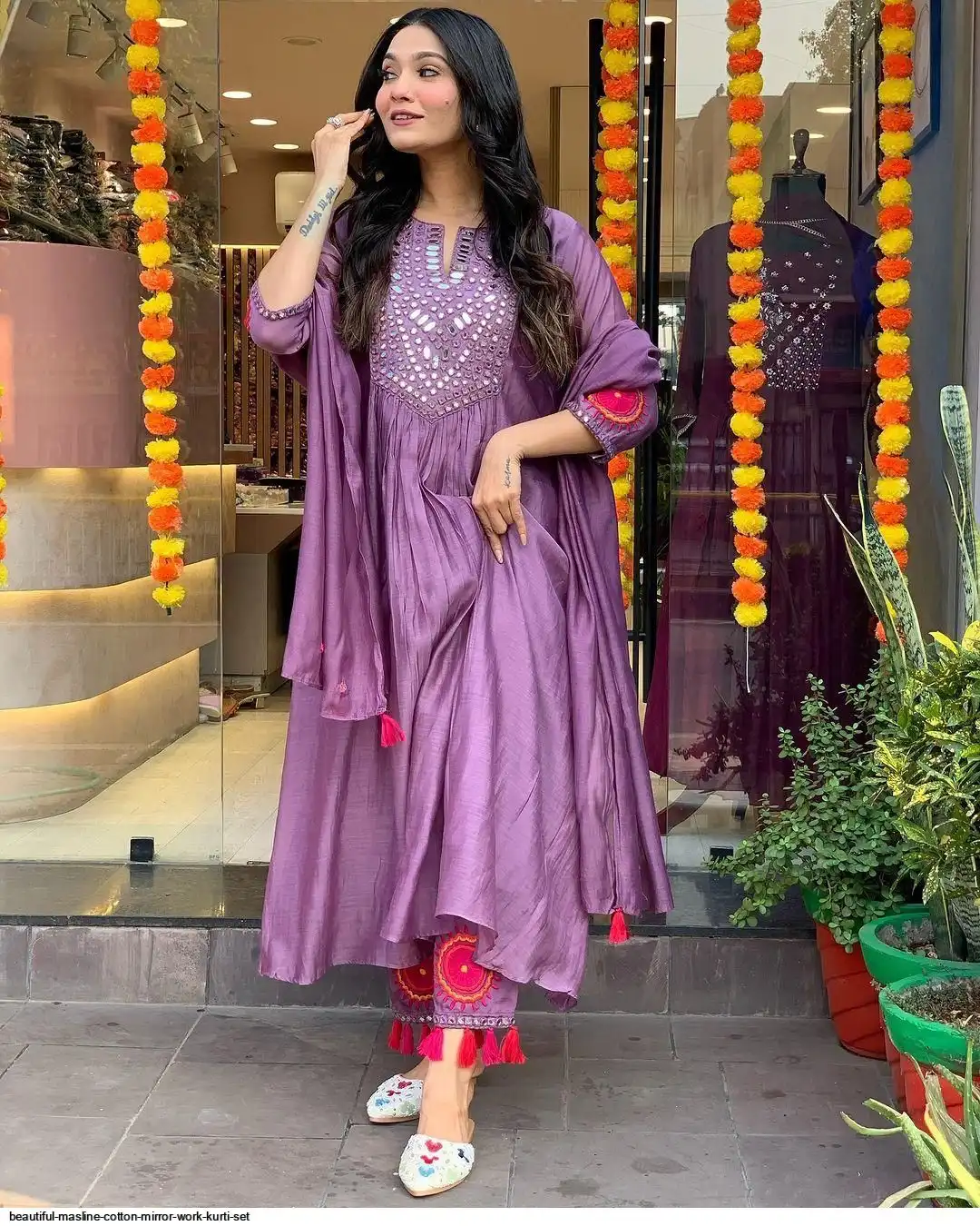 The outfit is made of Masleen cotton giving it a smooth and luxurious feel. The set includes a long kurti, matching pants, and a dupatta. Embroidery & Mirror Work in kurti features intricate mirror work on the neckline, adding a striking appeal. The sleeves have embroidery and mirror work near the cuffs, 🪻enhancing the design. The pants have embroidery and mirror work on the bottom side, making them visually appealing. The outfit is in a beautiful purple & pinkish-red shade, perfect for festive and ethnic occasions.