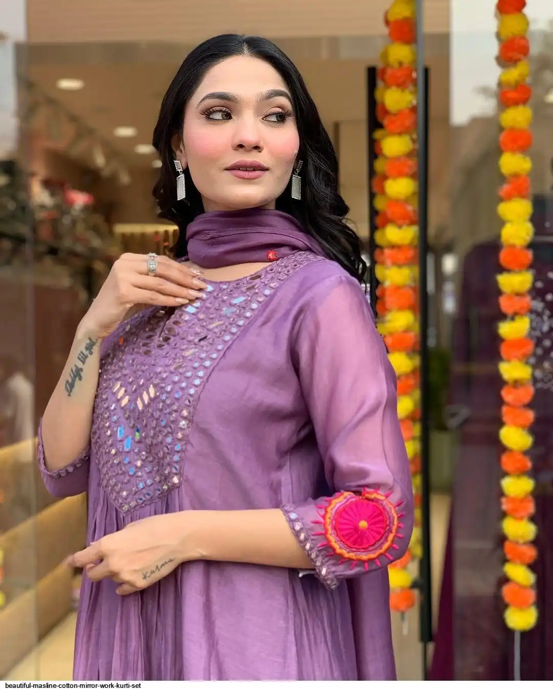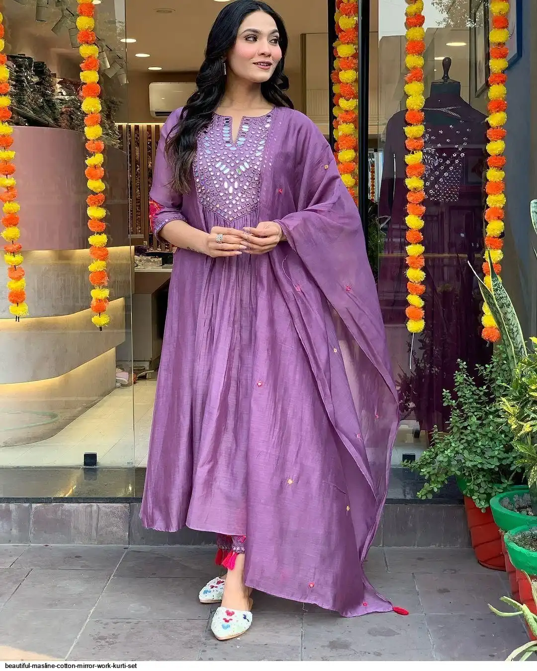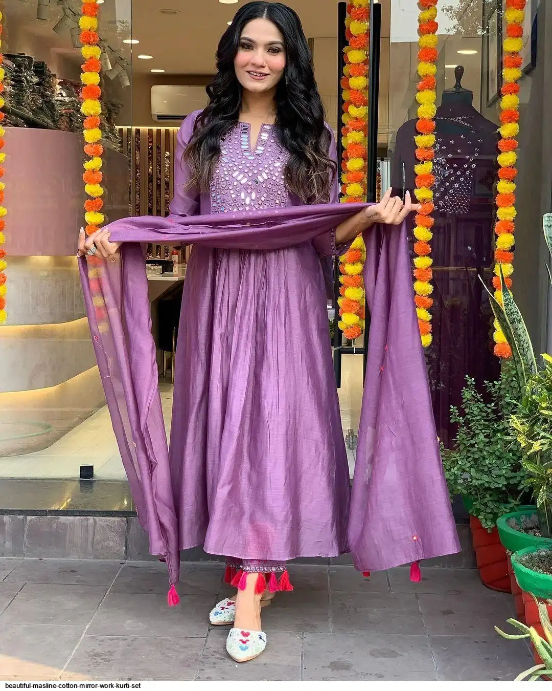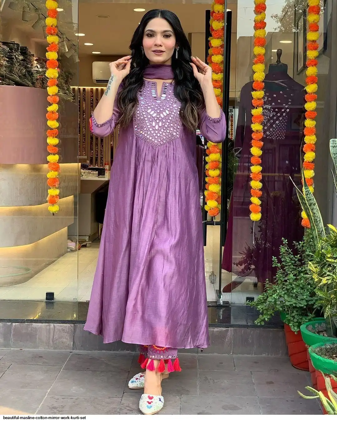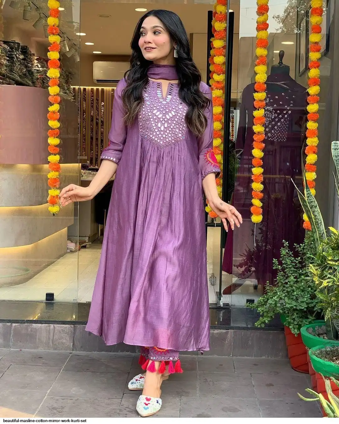The outfit is made of Masleen cotton giving it a smooth and luxurious feel. The set includes a long kurti, matching pants, and a dupatta. Embroidery & Mirror Work in kurti features intricate mirror work on the neckline, adding a striking appeal. The sleeves have embroidery and mirror work near the cuffs, 🪻enhancing the design. The pants have embroidery and mirror work on the bottom side, making them visually appealing. The outfit is in a beautiful purple & pinkish-red shade, perfect for festive and ethnic occasions.