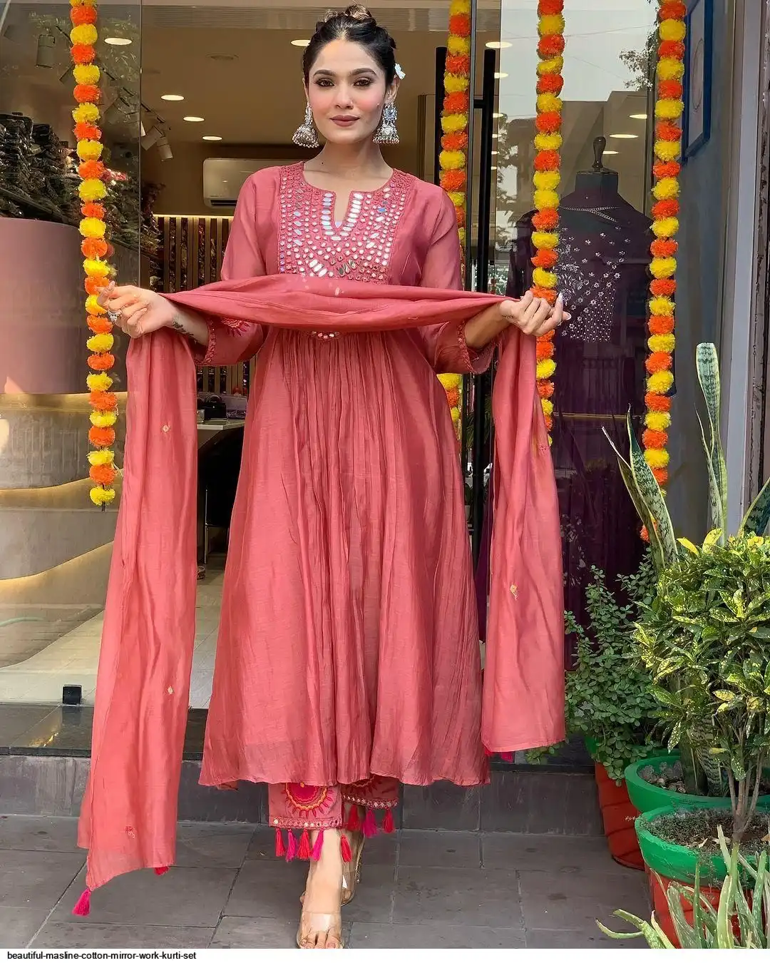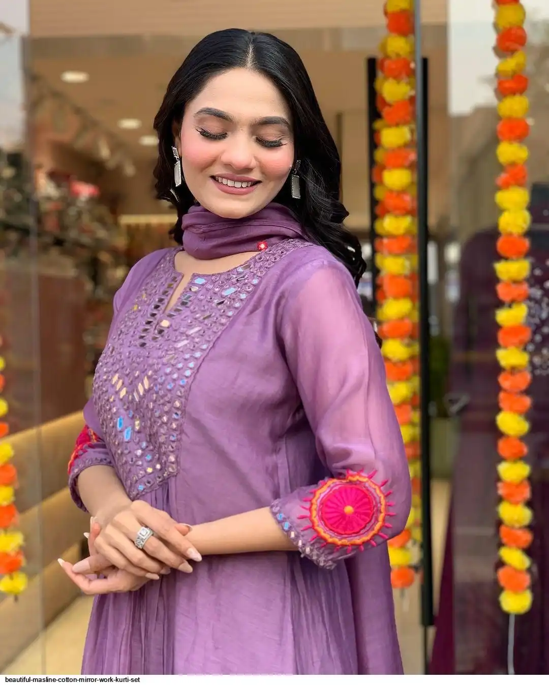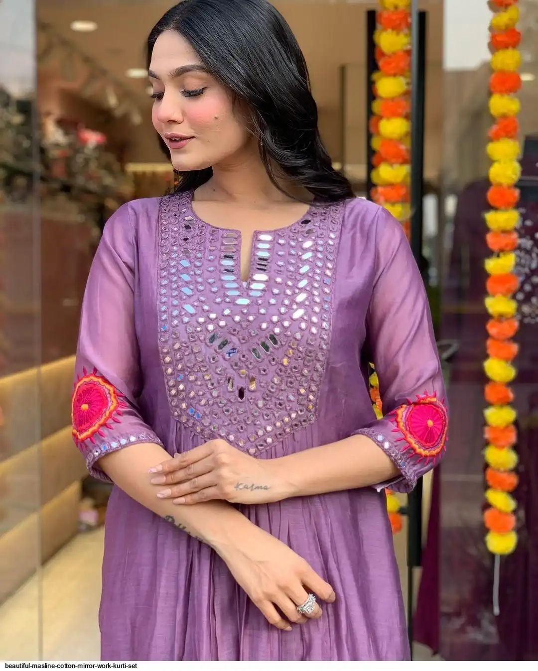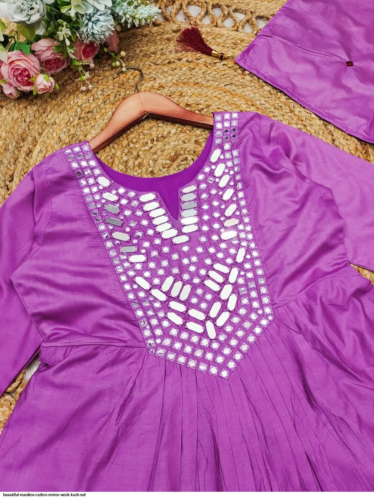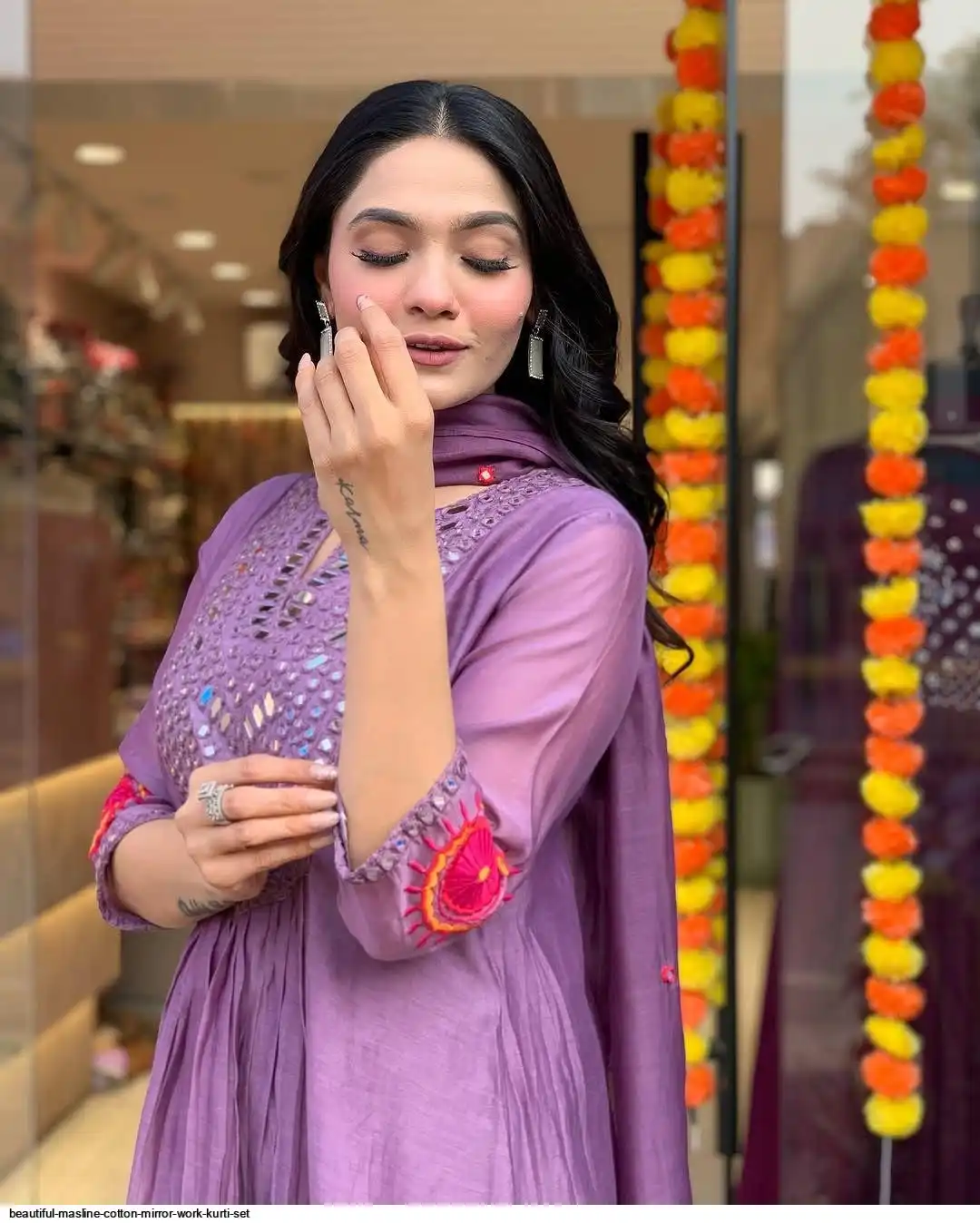The outfit is made of Masleen cotton giving it a smooth and luxurious feel. The set includes a long kurti, matching pants, and a dupatta. Embroidery & Mirror Work in kurti features intricate mirror work on the neckline, adding a striking appeal. The sleeves have embroidery and mirror work near the cuffs, 🪻enhancing the design. The pants have embroidery and mirror work on the bottom side, making them visually appealing. The outfit is in a beautiful purple & pinkish-red shade, perfect for festive and ethnic occasions.