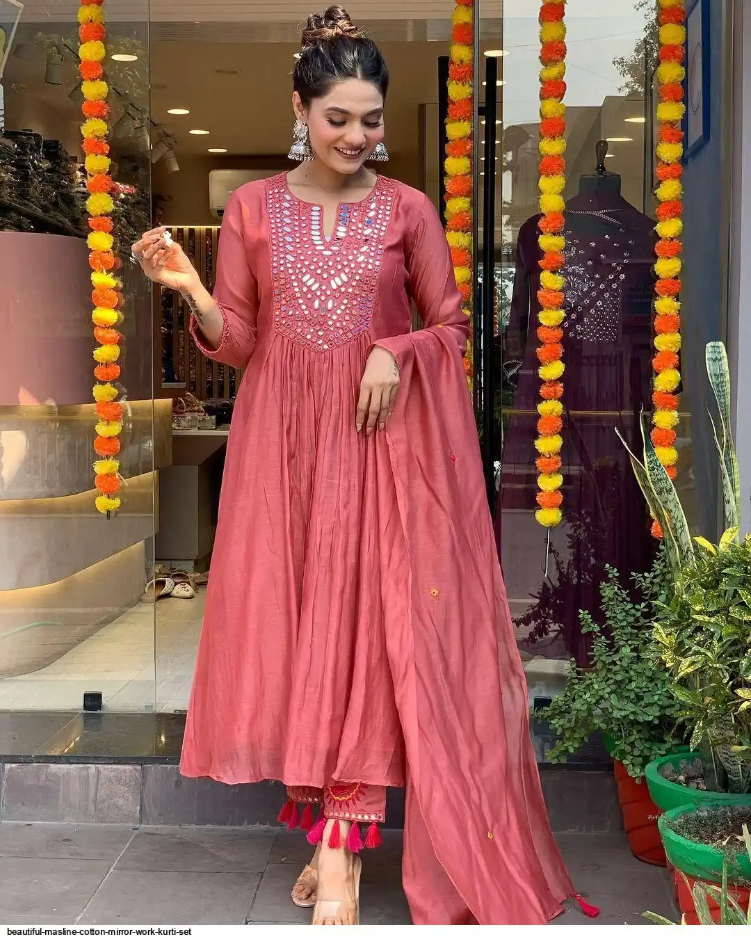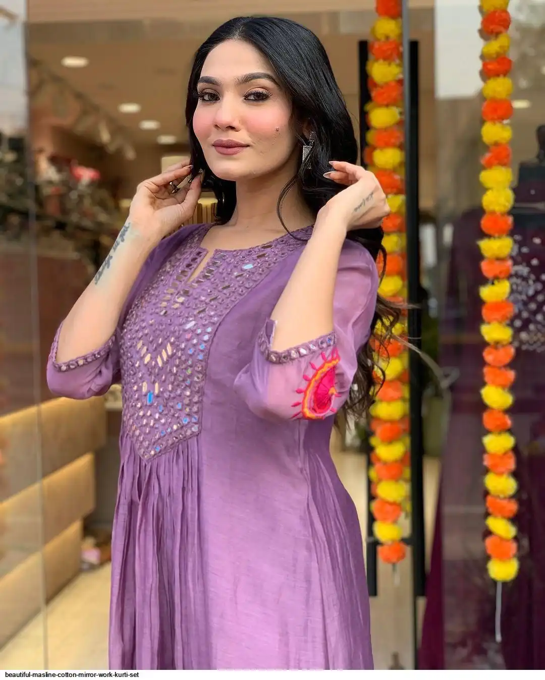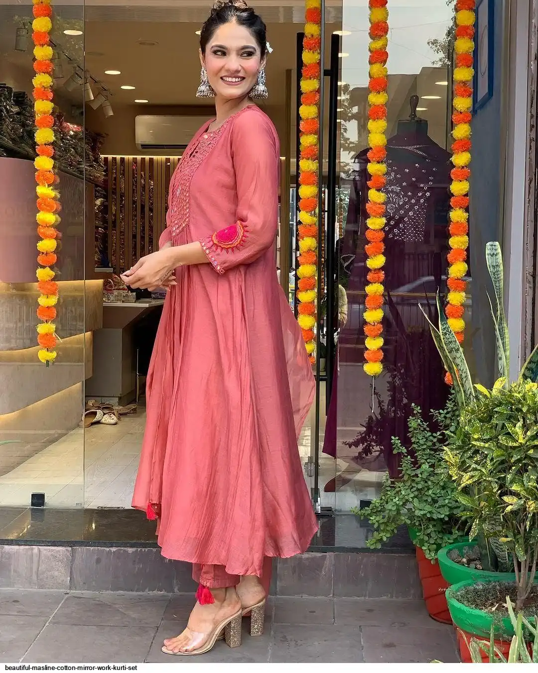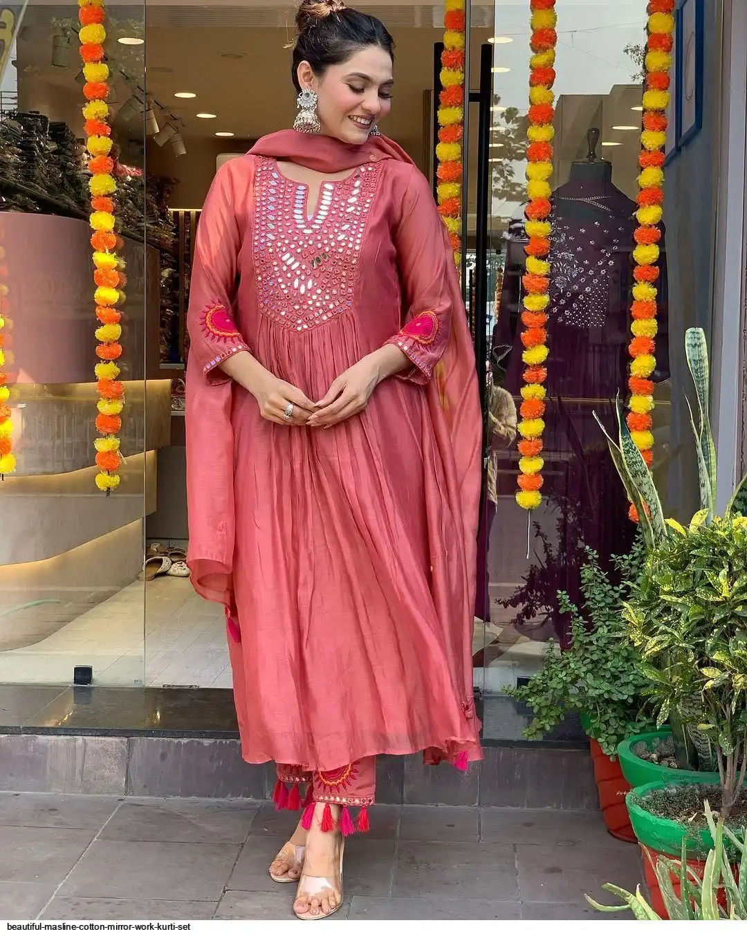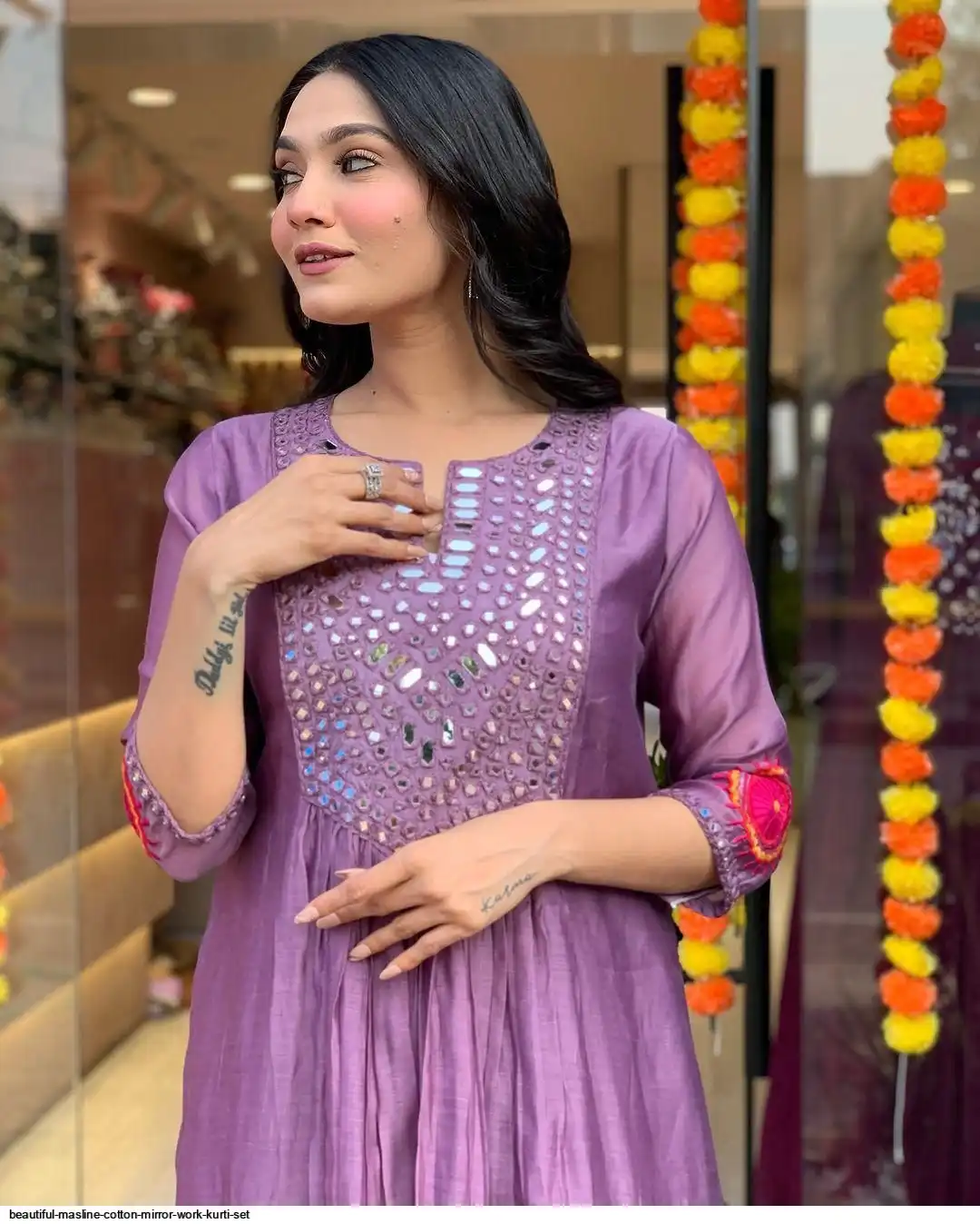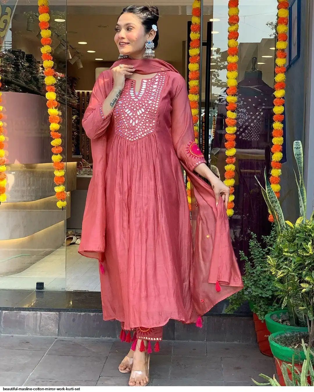 The outfit is made of Masleen cotton giving it a smooth and luxurious feel. The set includes a long kurti, matching pants, and a dupatta. Embroidery & Mirror Work in kurti features intricate mirror work on the neckline, adding a striking appeal. The sleeves have embroidery and mirror work near the cuffs, 🪻enhancing the design. The pants have embroidery and mirror work on the bottom side, making them visually appealing. The outfit is in a beautiful purple & pinkish-red shade, perfect for festive and ethnic occasions.