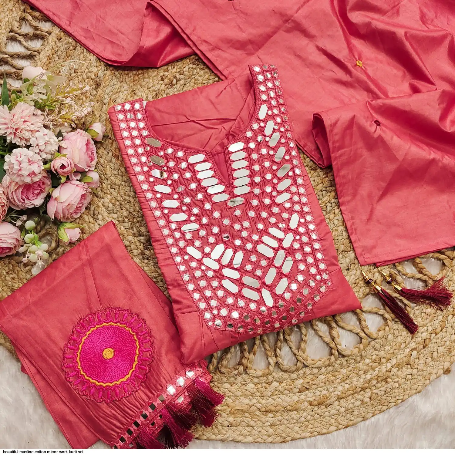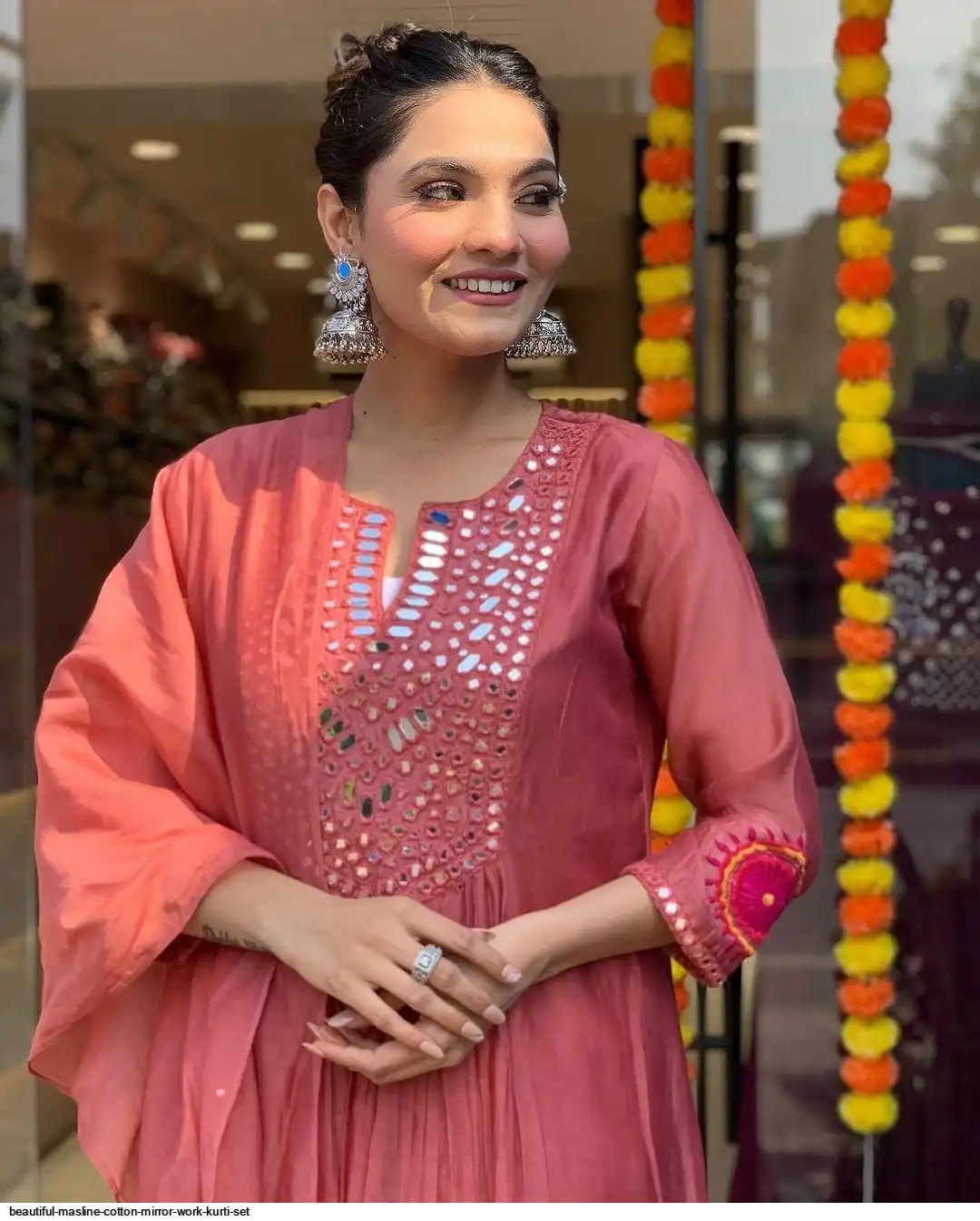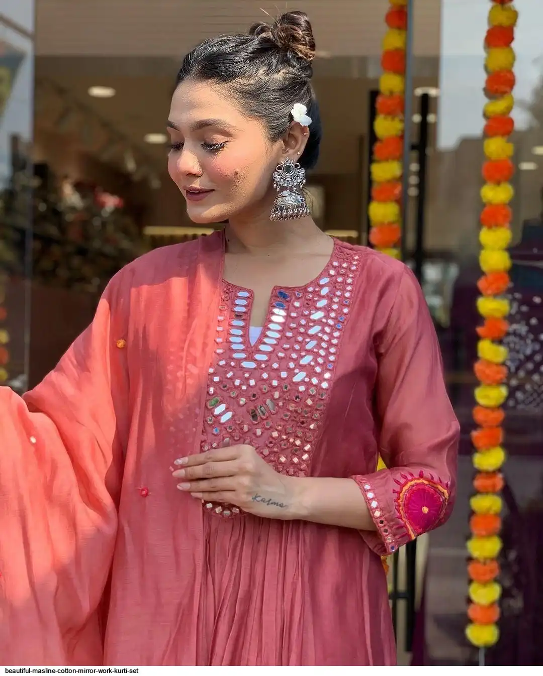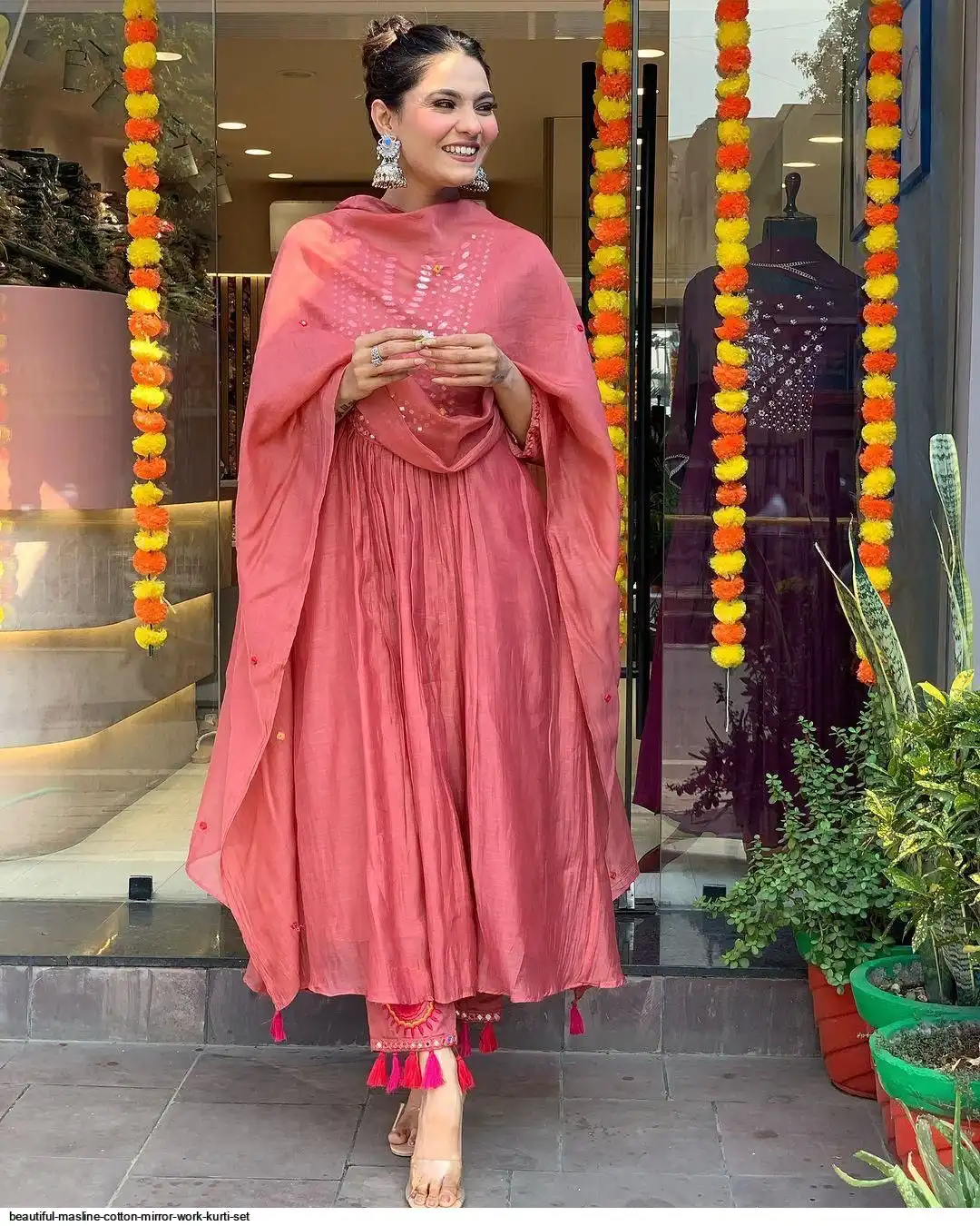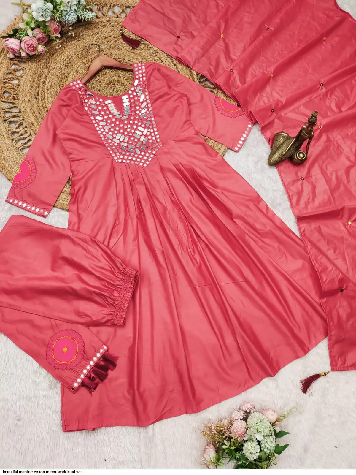 The outfit is made of Masleen cotton giving it a smooth and luxurious feel. The set includes a long kurti, matching pants, and a dupatta. Embroidery & Mirror Work in kurti features intricate mirror work on the neckline, adding a striking appeal. The sleeves have embroidery and mirror work near the cuffs, 🪻enhancing the design. The pants have embroidery and mirror work on the bottom side, making them visually appealing. The outfit is in a beautiful purple & pinkish-red shade, perfect for festive and ethnic occasions.