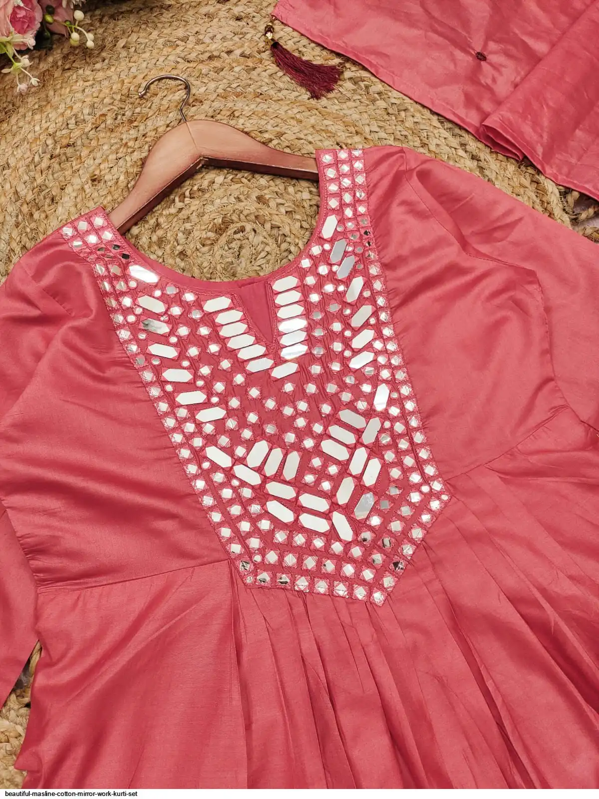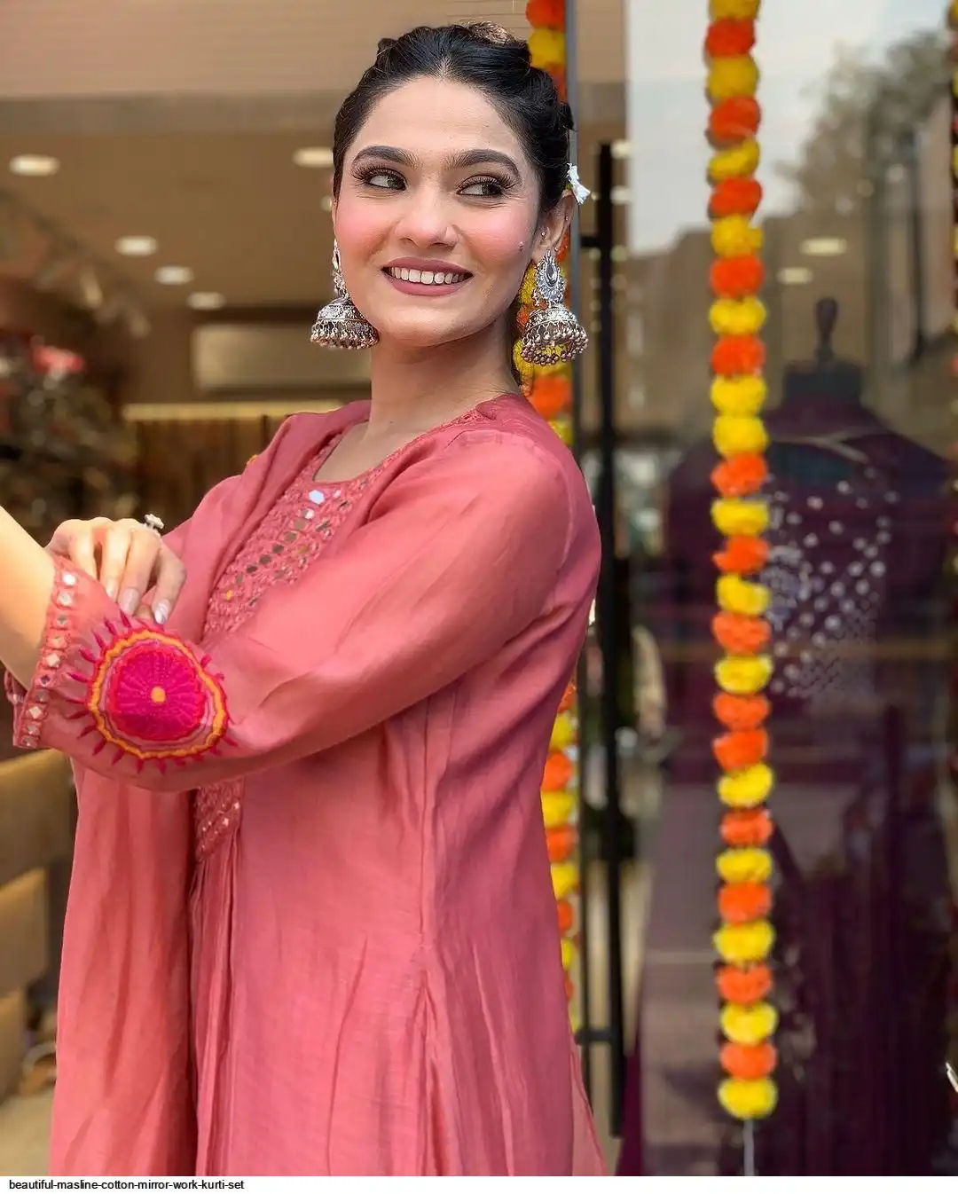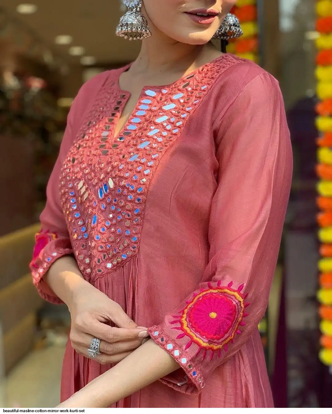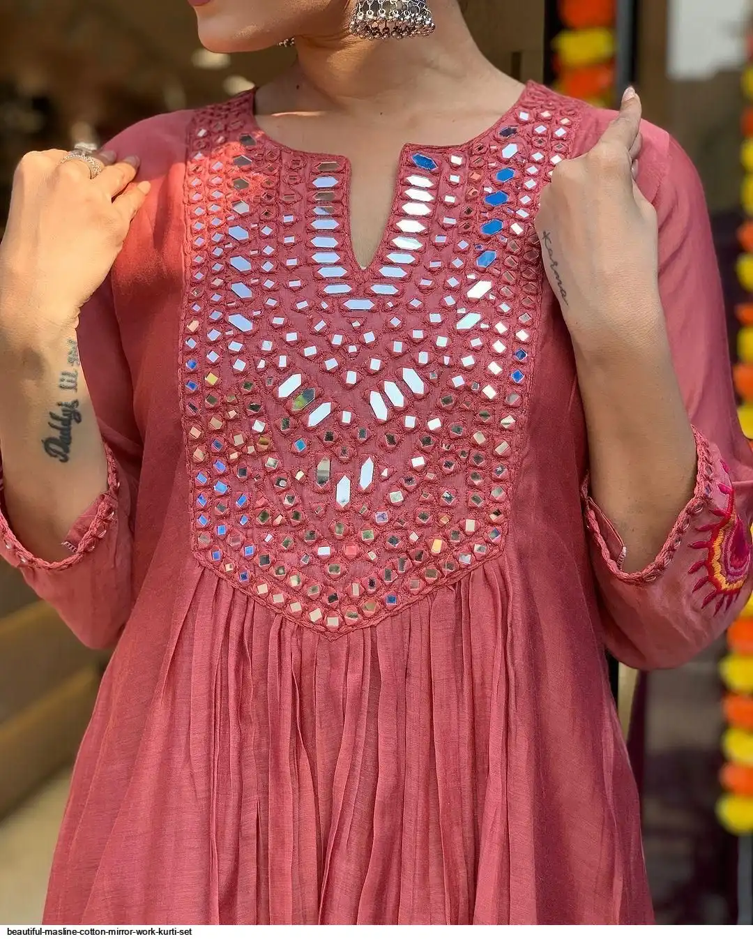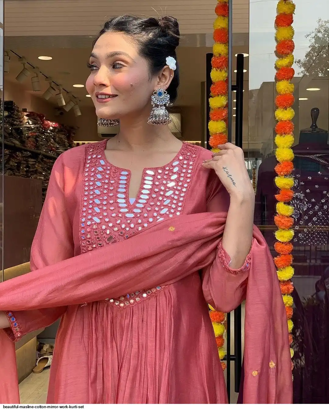 The outfit is made of Masleen cotton giving it a smooth and luxurious feel. The set includes a long kurti, matching pants, and a dupatta. Embroidery & Mirror Work in kurti features intricate mirror work on the neckline, adding a striking appeal. The sleeves have embroidery and mirror work near the cuffs, 🪻enhancing the design. The pants have embroidery and mirror work on the bottom side, making them visually appealing. The outfit is in a beautiful purple & pinkish-red shade, perfect for festive and ethnic occasions.