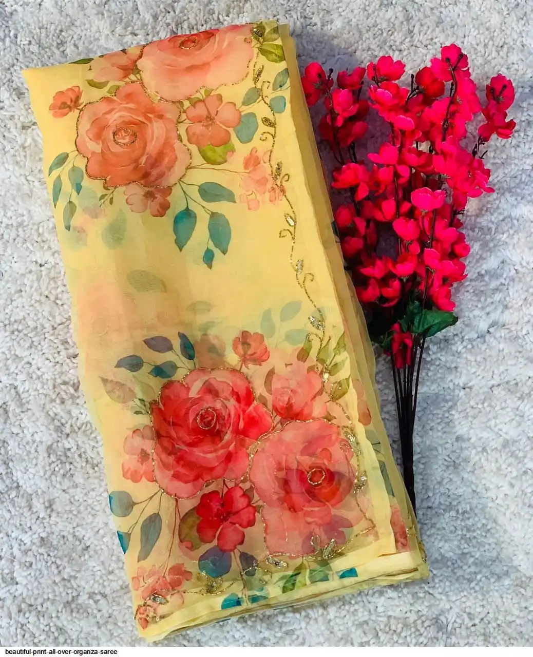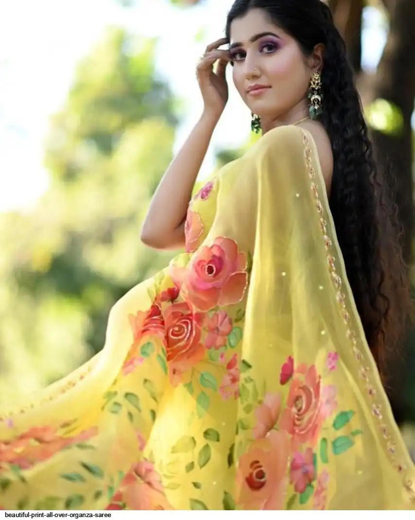 Beautiful print all over organza fabric with heavy handcrafted work all over and yellow silk blouse