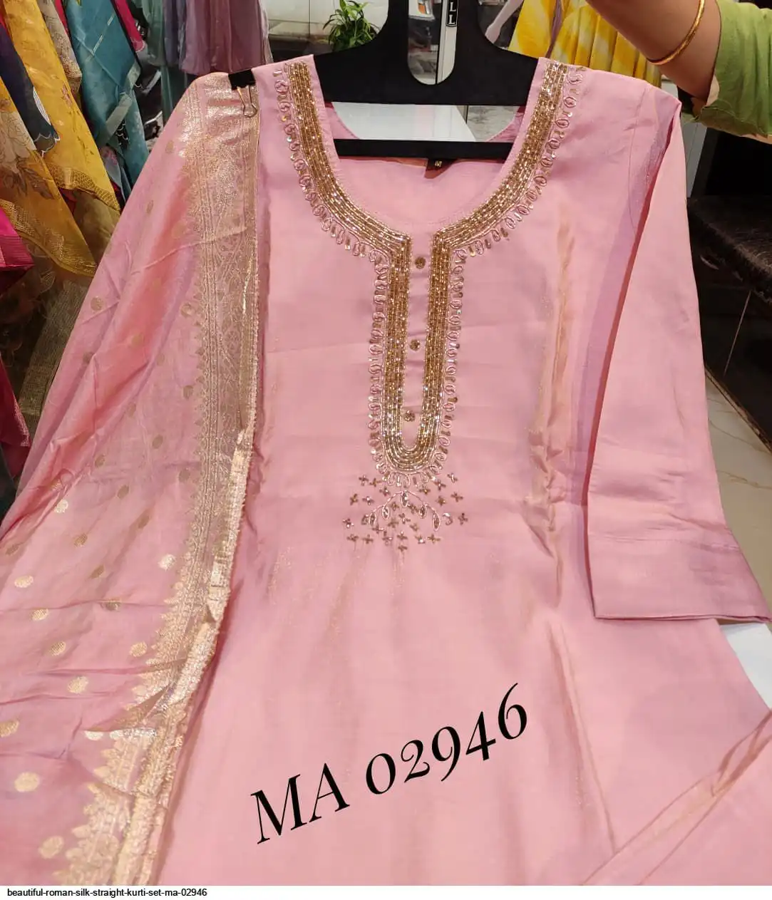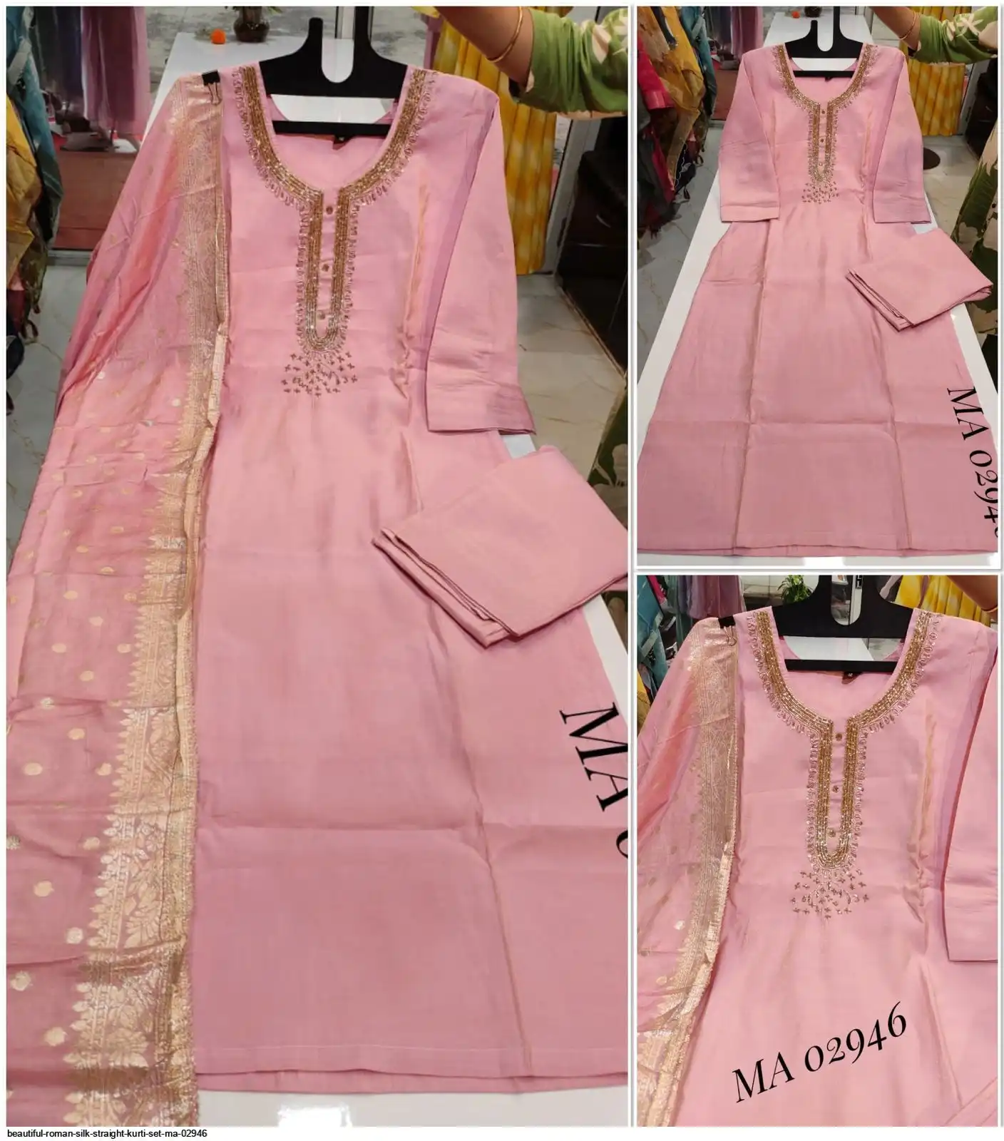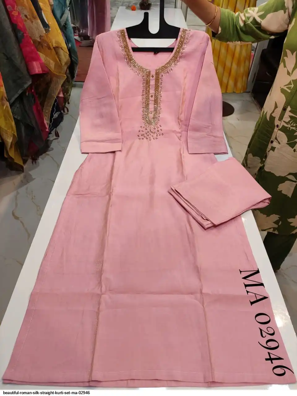 top - roman silk straight kurti with cutdana work on yoke.