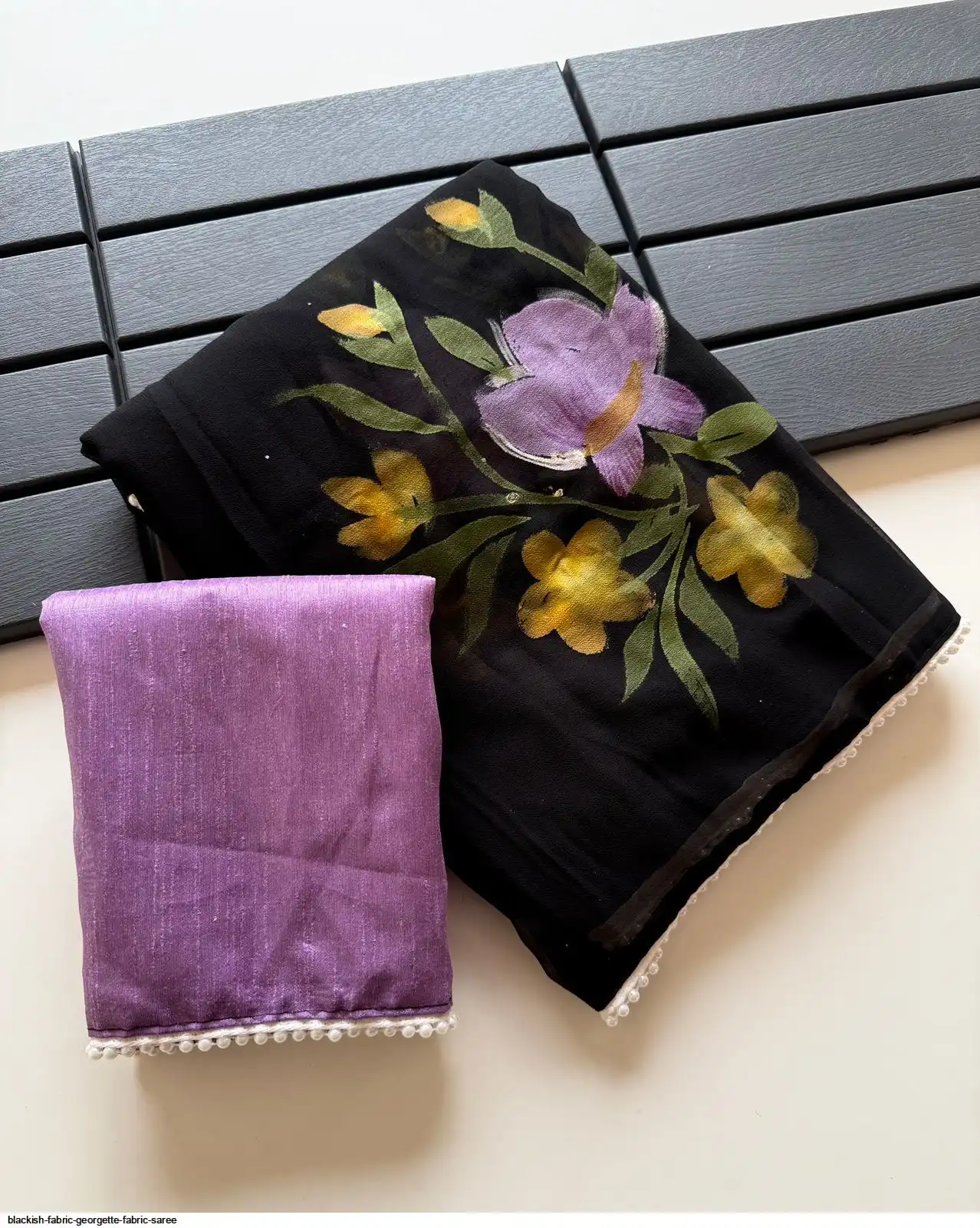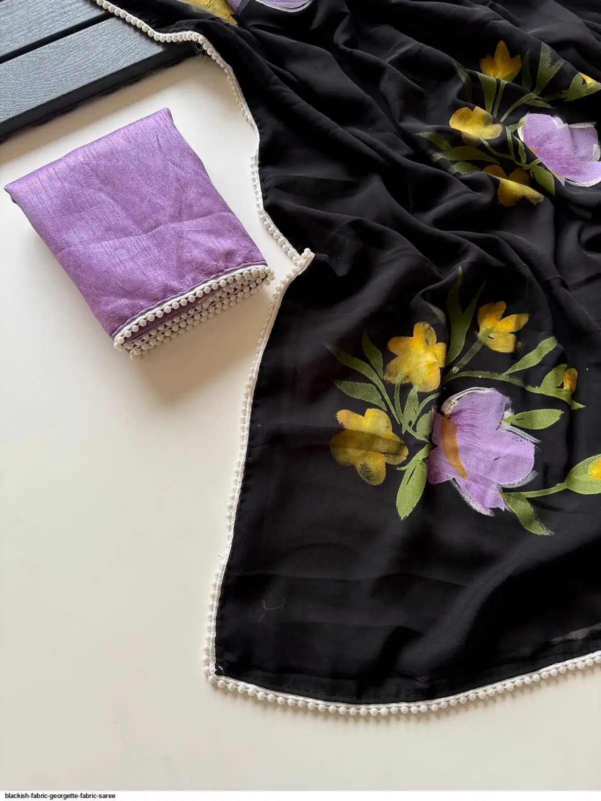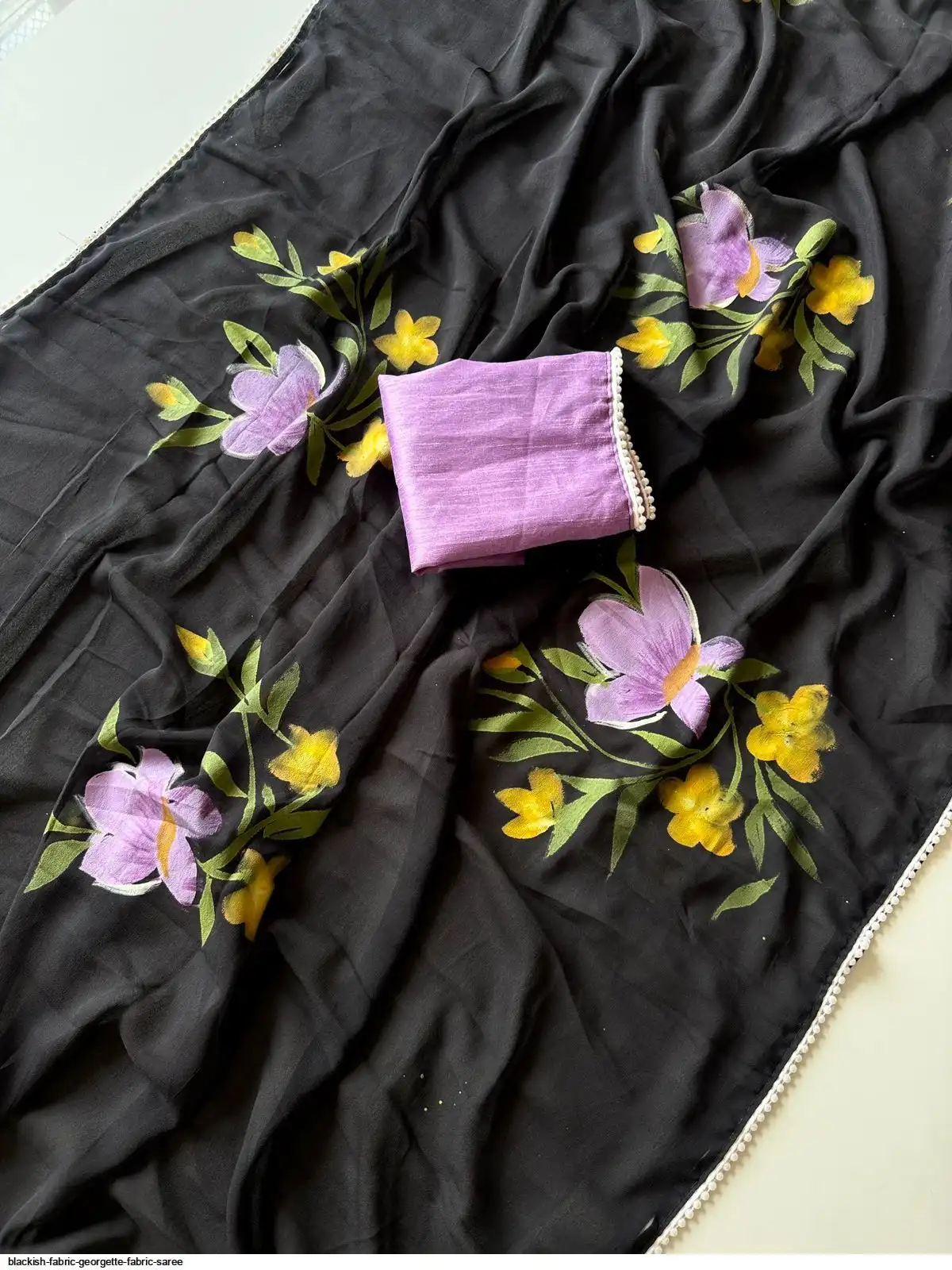 Fabric - Georgette Fabric With Beautiful Floral Handbrush Print And Fancy Pearl (Moti 📿) Lace Bordar With Contrast Art Silk Blouse