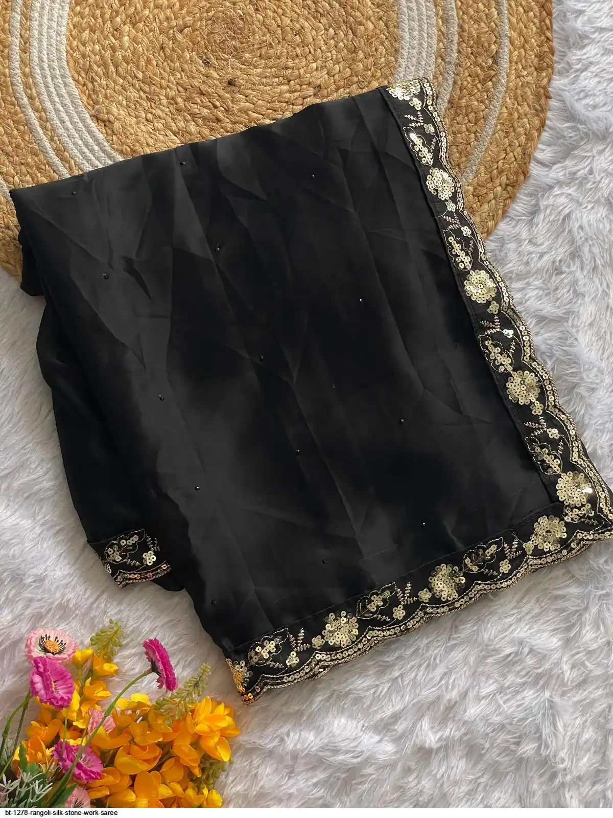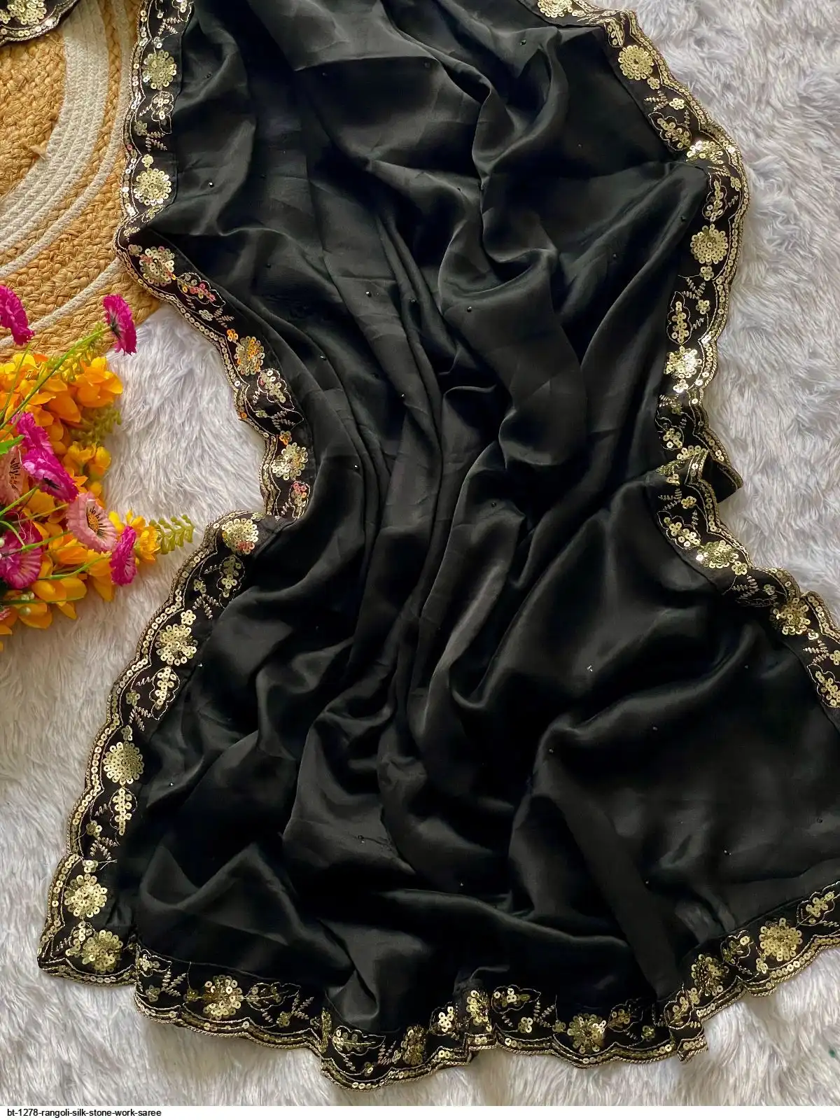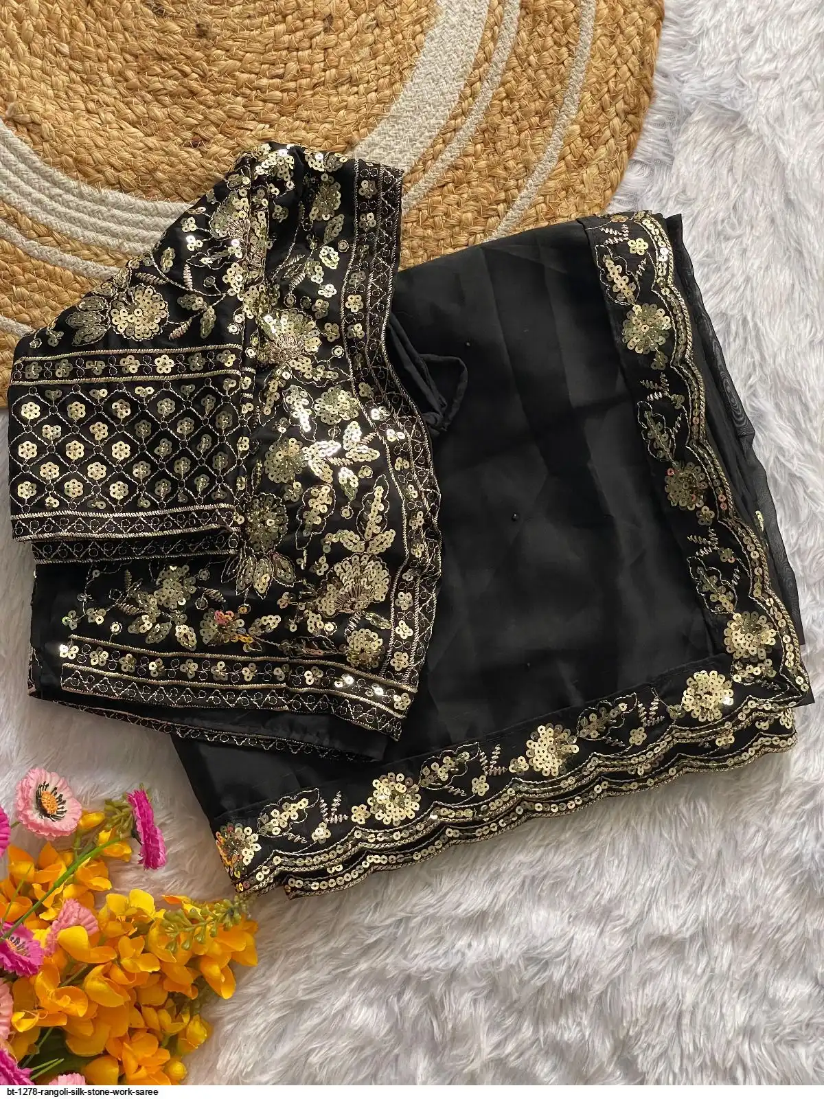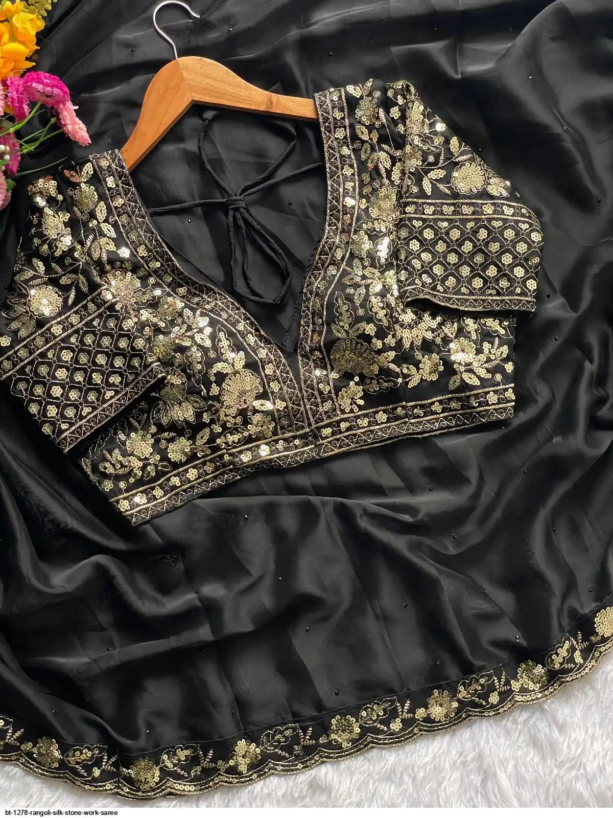 BLOUSE : HEAVY SOFT BLACK RANGOLI SLIK FABRIC ON EMBRODERY ZARI AND SEQUENCE WORK ALL OVER BLOUSE