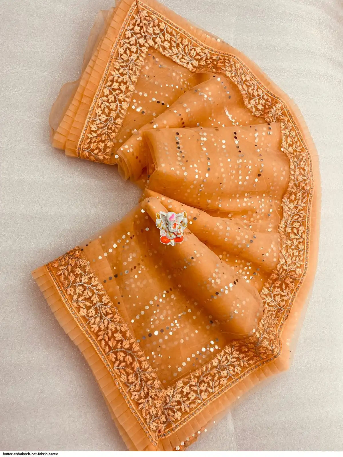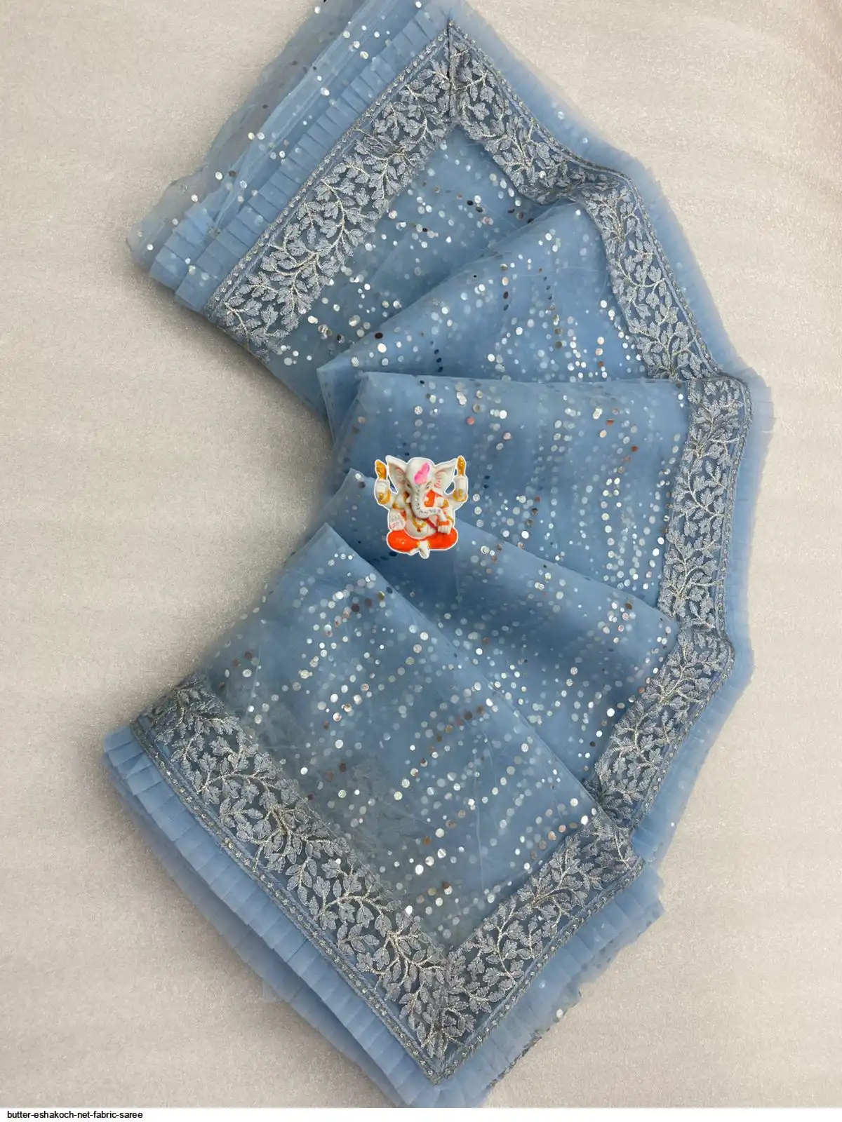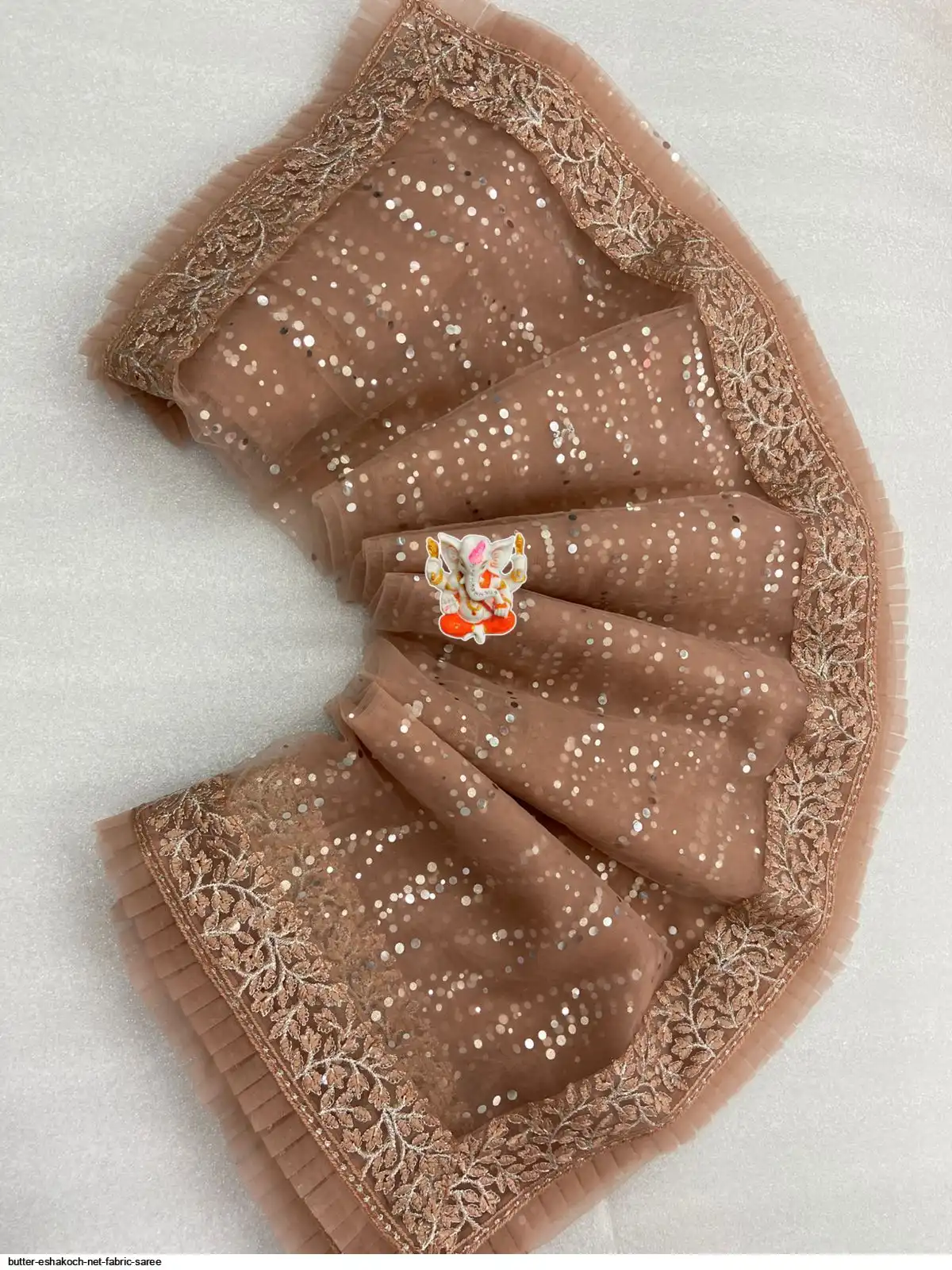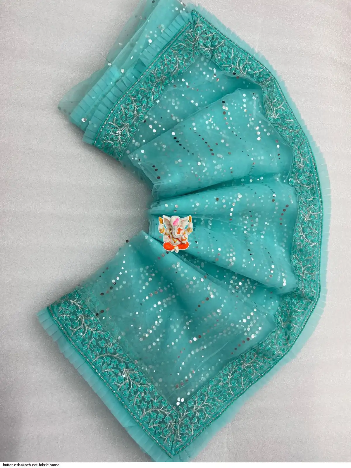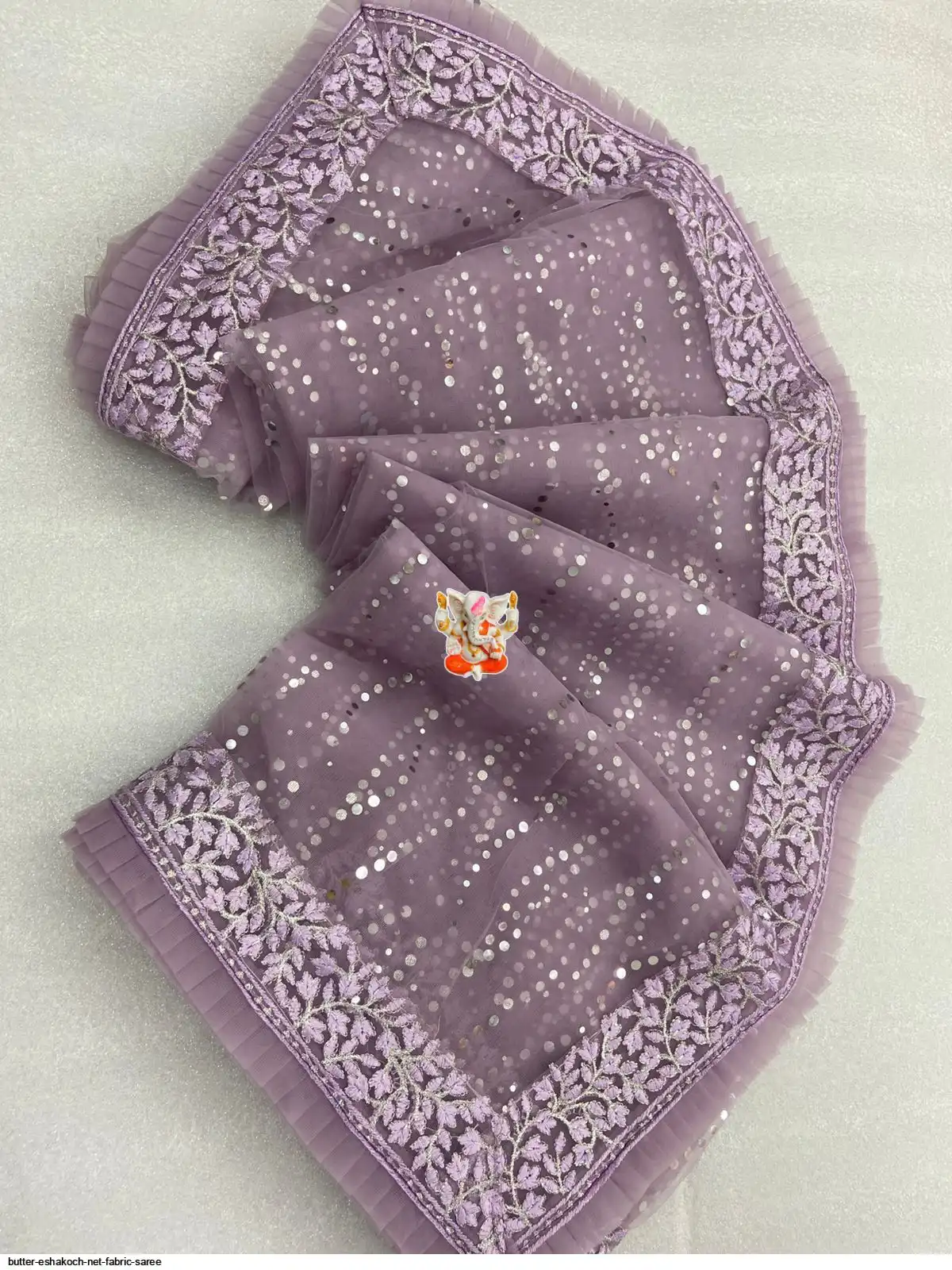 Fabrics=Butter Eshakoch Net fabric with double layers frill with mirar work 3mm.4mm’5mm’6mm mirar work all over sarees with embroidery work lace broder