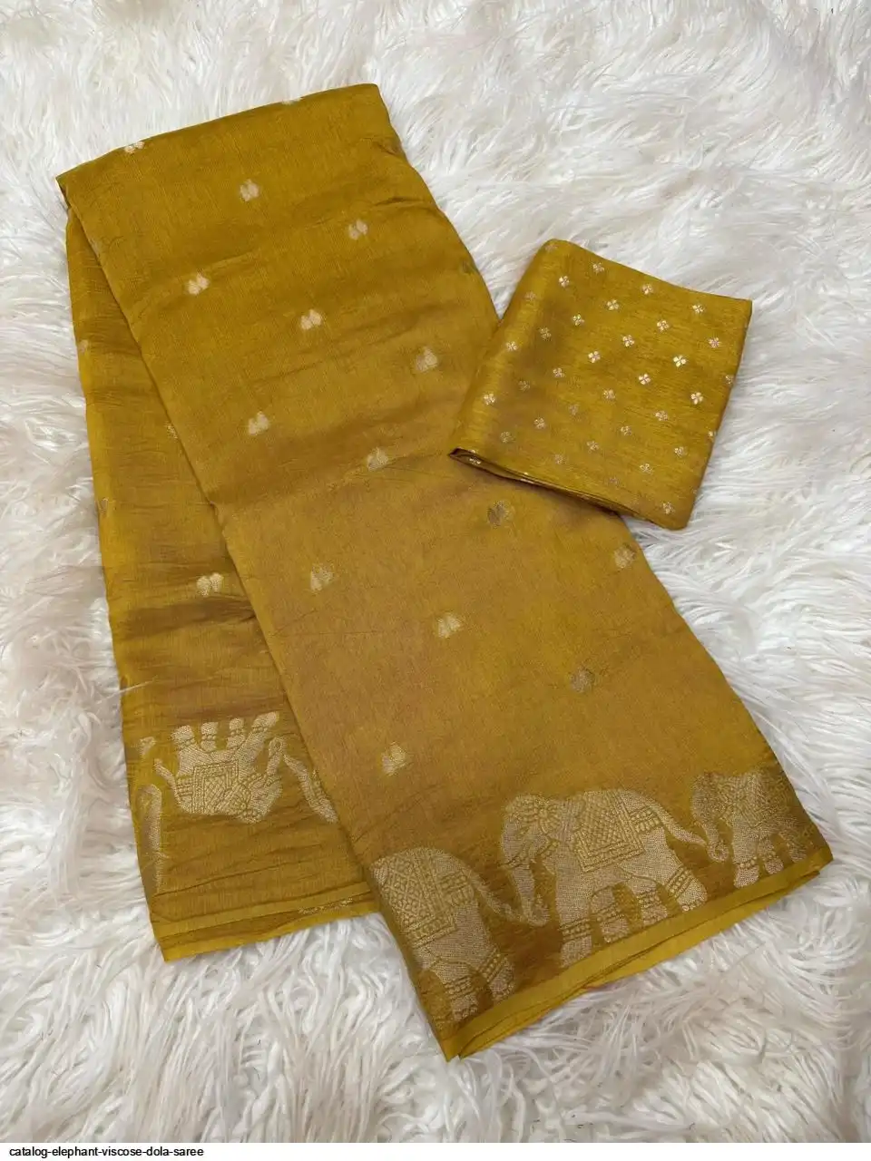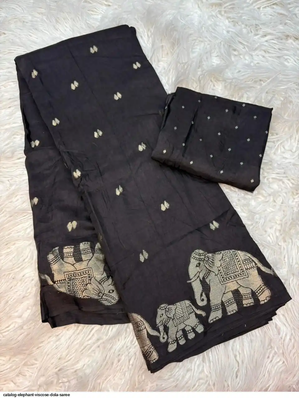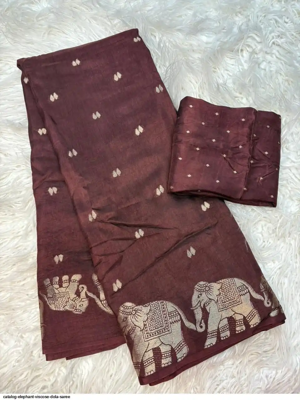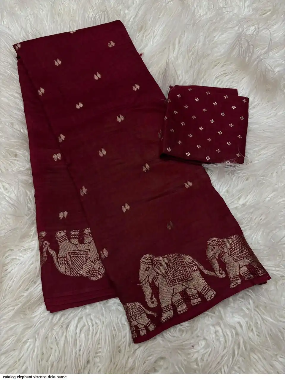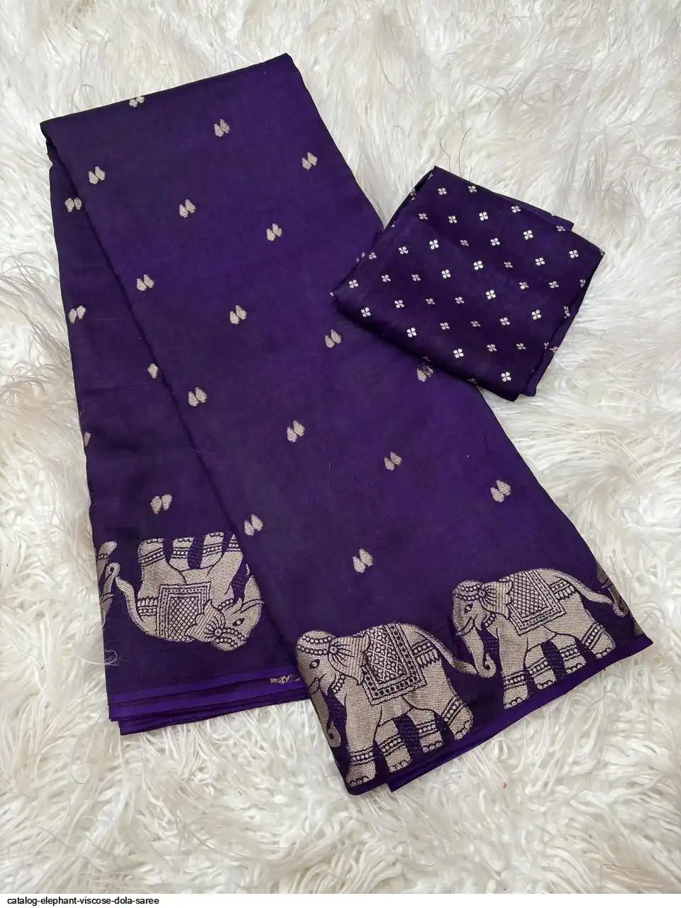 Pure Russian dola fabric with beautiful elephant 🐘 figure in saree border with running Zari chitt pallu pair with viscose jacquard blouse