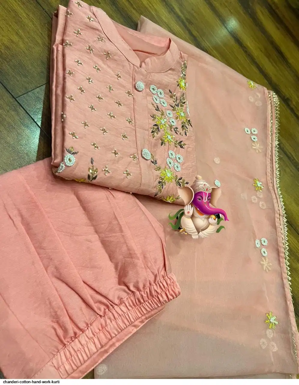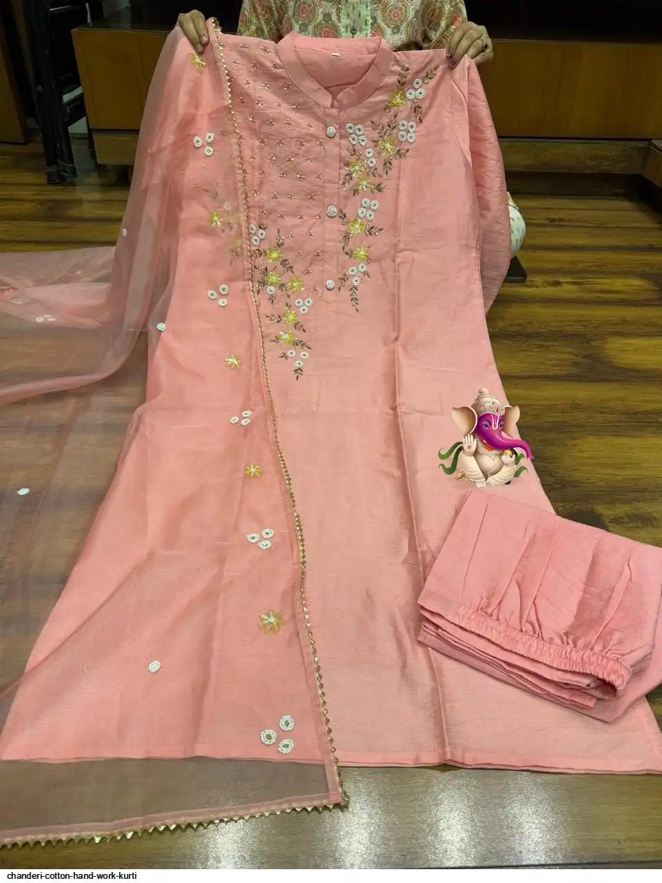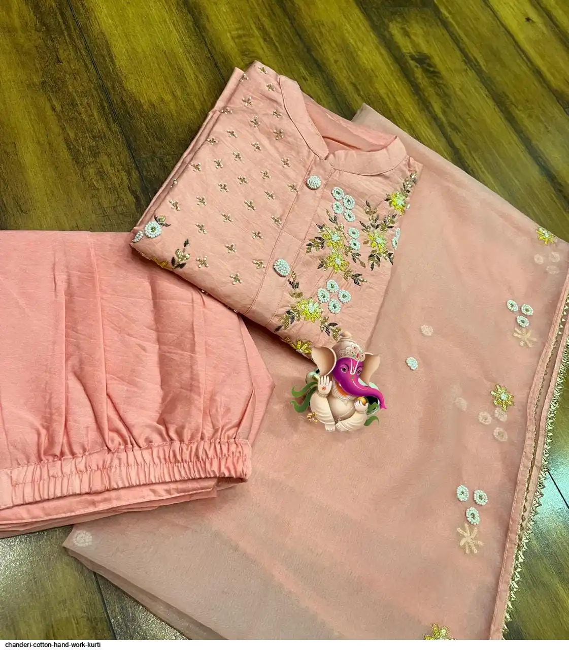 Chanderi cotton fabric with cotton lining with hand work side cut straight kurti with organza dupatta and pant with lining