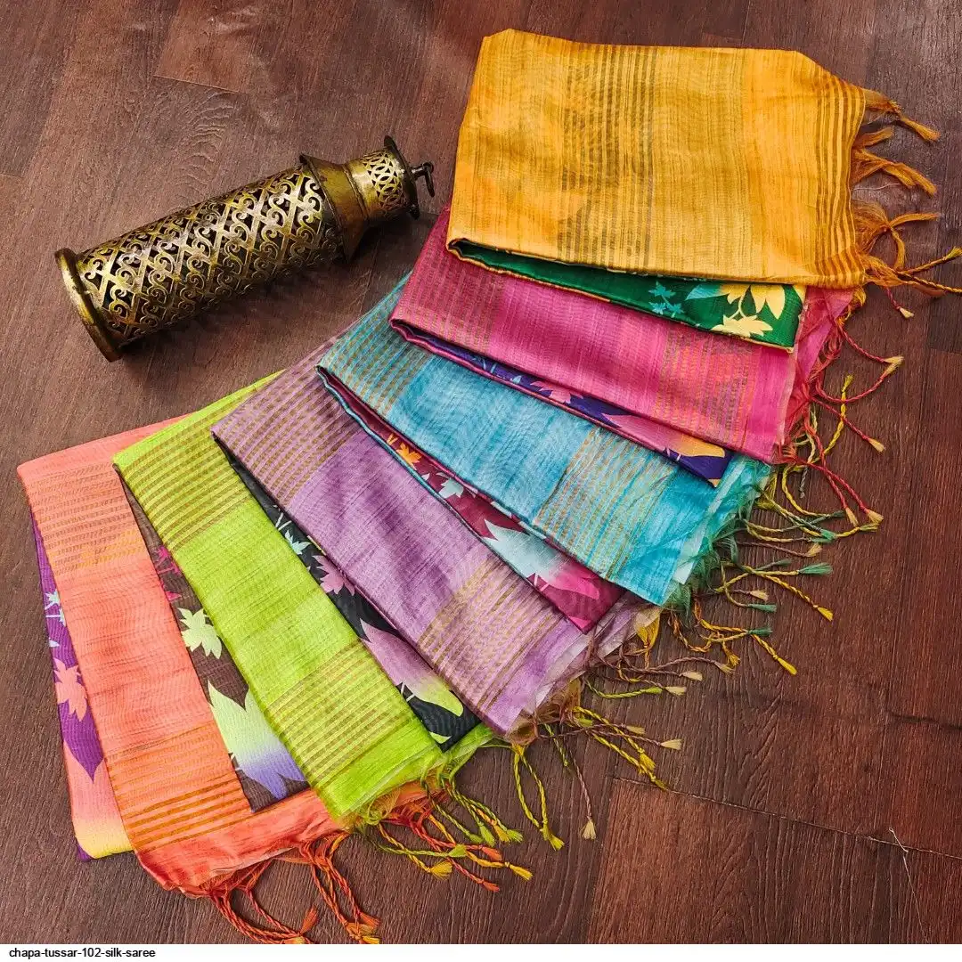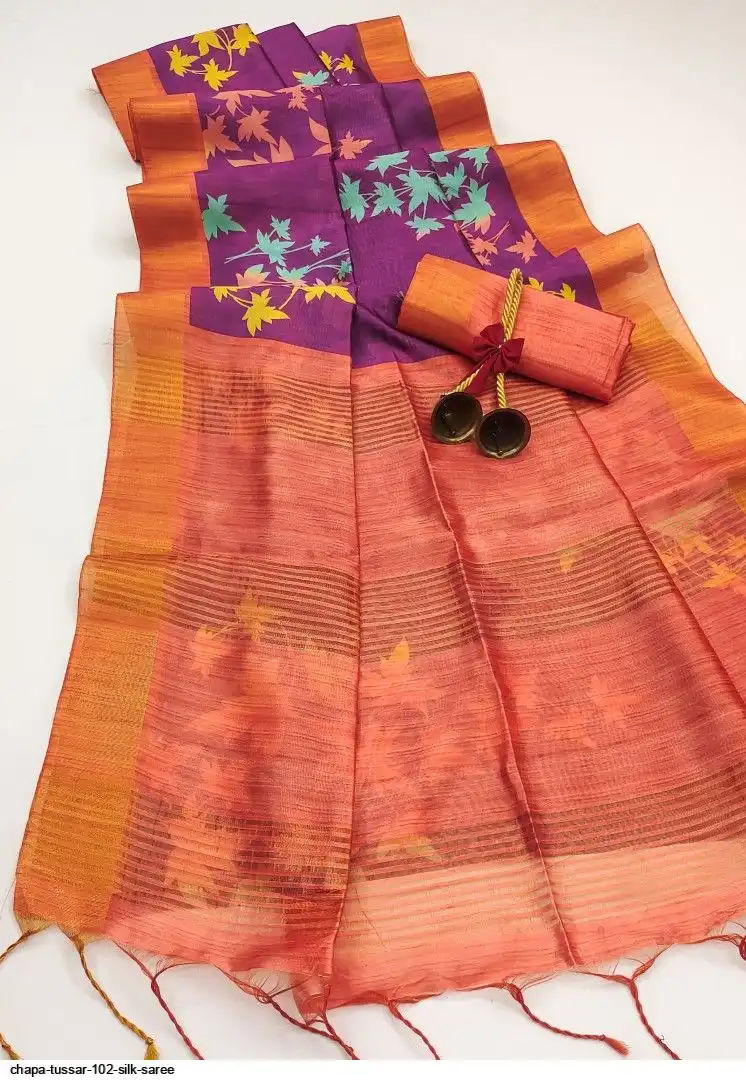 PREMIUM SOFT DESI TUSSAR SILK SAREE WITH CLASSY FLORAL JAL PRINTED BODY AND CONTRAST ZARI WOVEN BORDER , PALLU AND CONTRAST BLOUSE PIECE