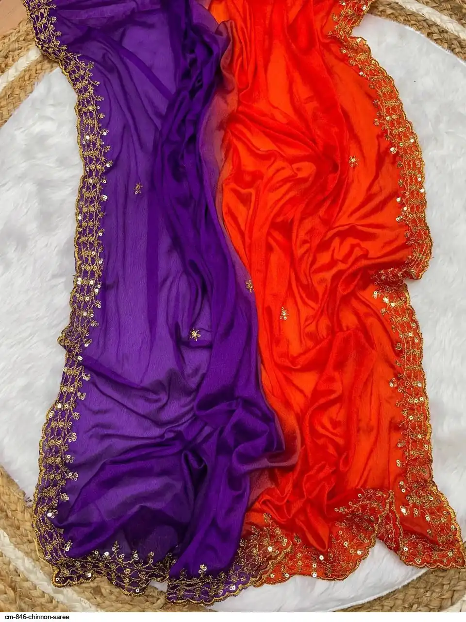 Soft Hand Dyeing Chinnon Saree With Heavy Embroidery Sequence And Jari Work And Border Arca